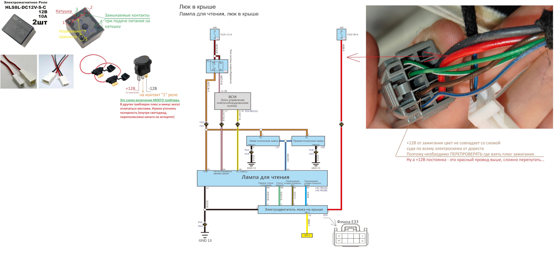 Питание взял — с фишки люка (расположена над салонным плафоном). Причем в моем случае — нужно ДВА! разных плюса с фишки. Причина такова: на люк идет постоянный плюс 12в через предохранитель F102(30А). Т.е. при выключенном зажигании +12В остаются ВСЕГДА. Нам такая ситуация НЕ нужна. Поэтому пришлось ставить дополнительную релюшку, чтоб можно было включать безопасный плюс с силового 12В/30А только при включении зажигания (коричневый тоненький провод на той же клемме люка — будет нашим «управляющим сигналом»).