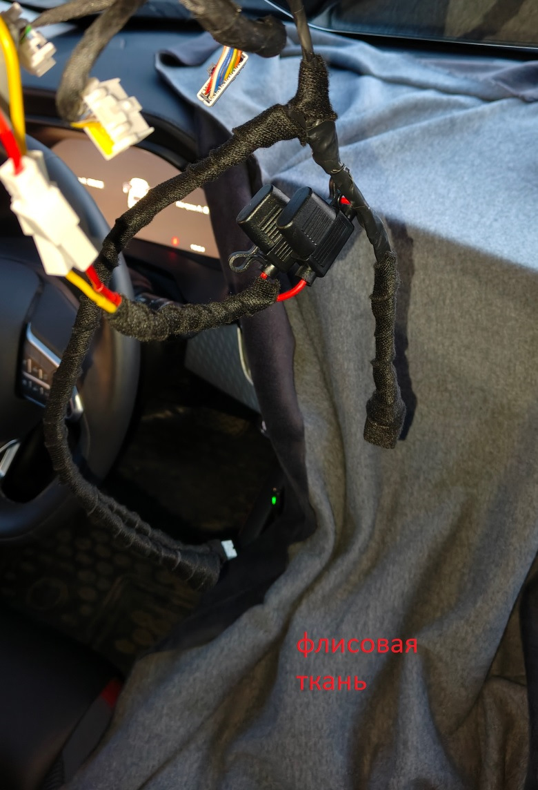 Собранные провода и все потроха выглядят примерно так (скрутил в жгуты изолентой + обмотал маделином, чтоб не тарахтели под шкурой):