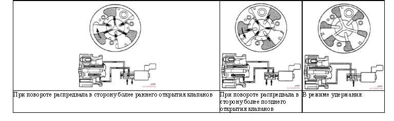 Масло подводится с одной или другой стороны каждого из лепестков ротора, заставляя его и сам вал поворачиваться. Если двигатель заглушен, то устанавливается максимальный угол задержки (то есть угол, соответствующий наиболее позднему открытию и закрытию впускных клапанов). Чтобы сразу после запуска, когда давление в масляной магистрали еще недостаточно для эффективного управления VVT-i, не возникало ударов в механизме, ротор соединяется с корпусом стопорным штифтом (затем штифт отжимается давлением масла).