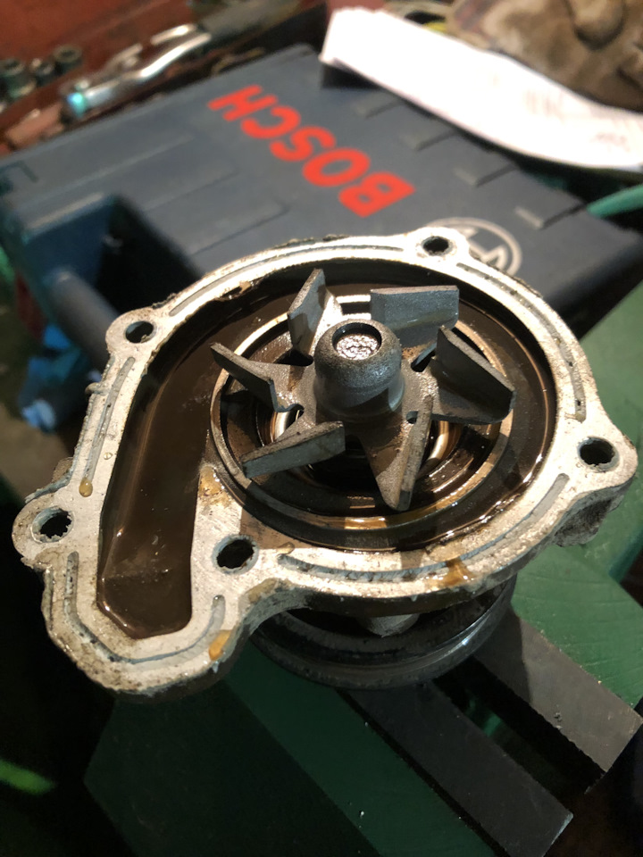 Вот старая помпа, крыльчатка на месте, люфта почти нет, не текла, помпа оригинал, хотя подшипник кажется скоро б вышел из чата — есть некий шум при вращении