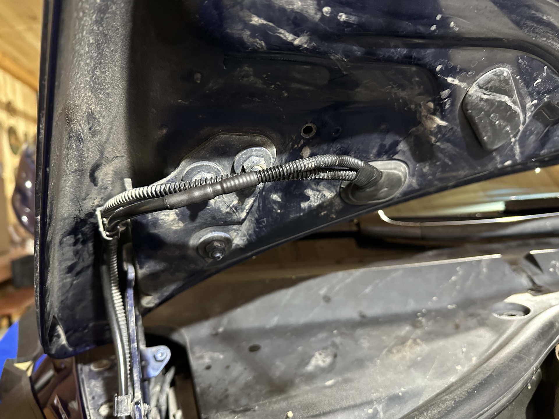 На этом туареге решил вопрос иначе, сделал переход силиконовым шлангом 4мм. т.е. трубка на выходе из крыла (при помощи переходников) сразу переходит в шланг, поднимается по петле капота и далее вновь соединяется с оригинальной трубкой. Подвижной частью становятся шланг. На мой взгляд получилось достаточно хорошо! Для надежности упаковал соединения в клеевую термоусадку.