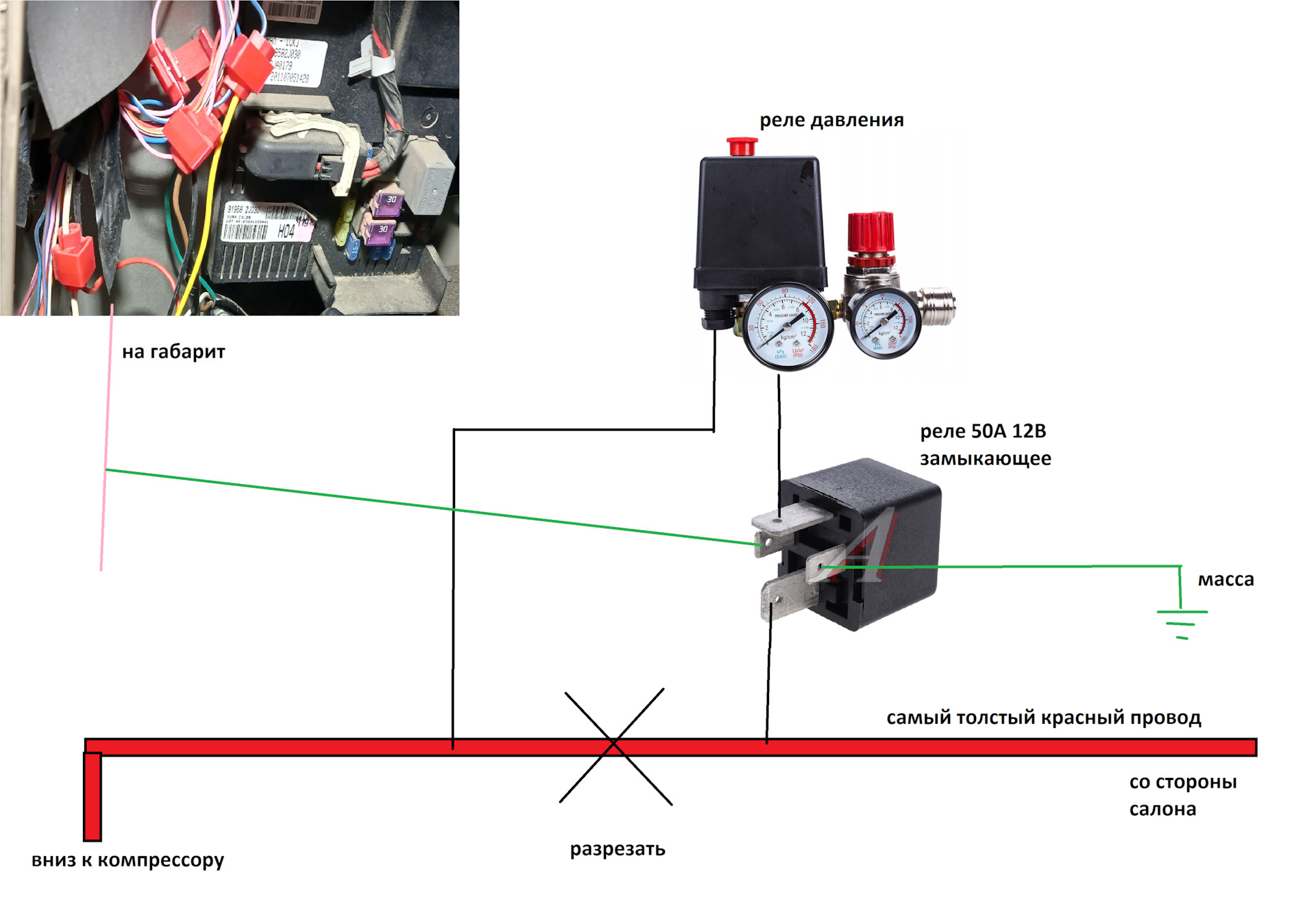 Электропитание простое. В левом лючке в жгуте проводов самый толстый красный провод – плюс на компрессор пневмоподвески. Его разрезаем, входящую часть проводим через большие ножки (9,5 мм) замыкающего реле на 50А 12В, на маленькие ножки (6,3 мм) подаем массу и питание от заднего габарита, вроде розовый провод. Таким образом, пневмокомпрессор будет работать только при включенных габаритах, а это обычно означает заведенный мотор. Дальше со второго большого контакта реле провод идет в реле давления, так называемый прессостат, откуда дальше идет на штатный красный провод, уходящий к компрессору. При этом надо вынуть реле пневмокомпрессора в подкапотном блоке и замкнуть два крупных контакта (9,5 мм) проводом, лучше с клеммами, т.к. ток там будет большой.