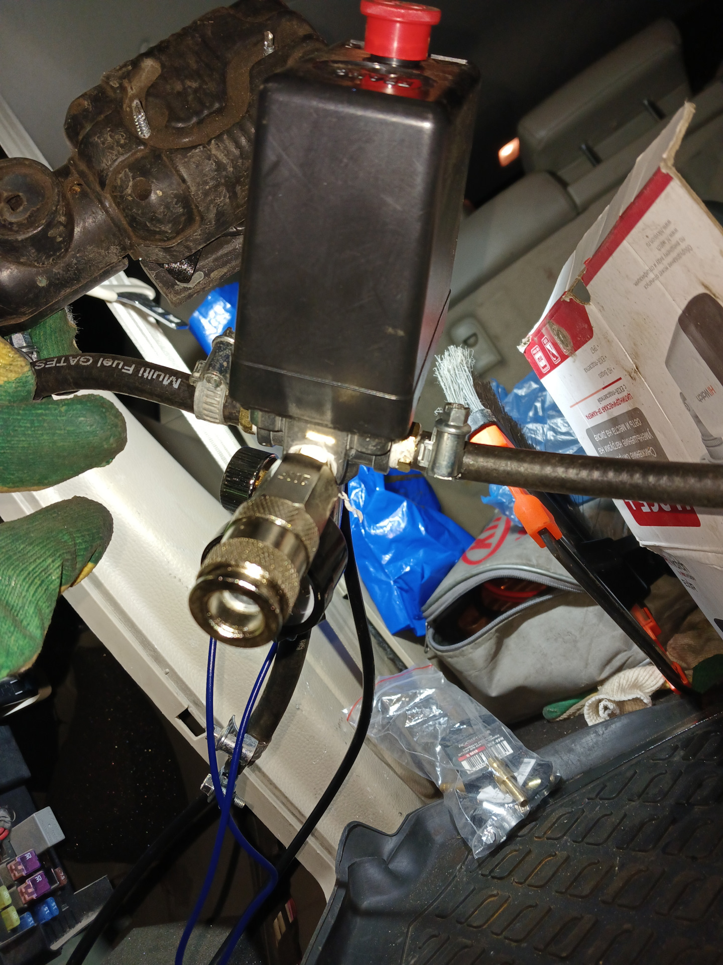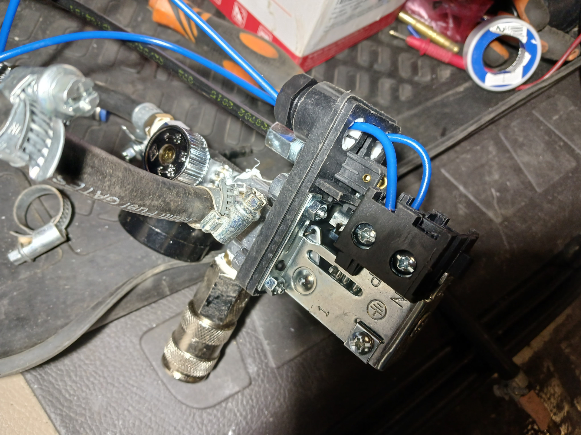 Купил недорогое реле давления для компрессора Патриот за 800 р, оказалось не совсем подходящим, т.к. при выключении кнопкой стравливает давление в компрессоре полностью (и ресивере заодно). Но пока стоит оно. Через тройник воздух одним шлангом попадает во включающую часть реле-регулятора, , а вторым шлангом подходит в разветвитель, откуда выходит на быстросъем для подкачки колес, на подкачку внешним компрессором и на регулятор давления, где выставлено 4,5-4,7 атм, а дальше на контур пневмобаллонов.