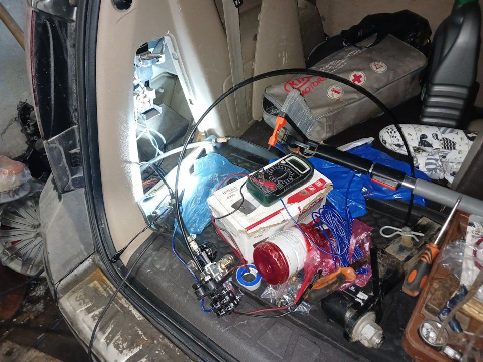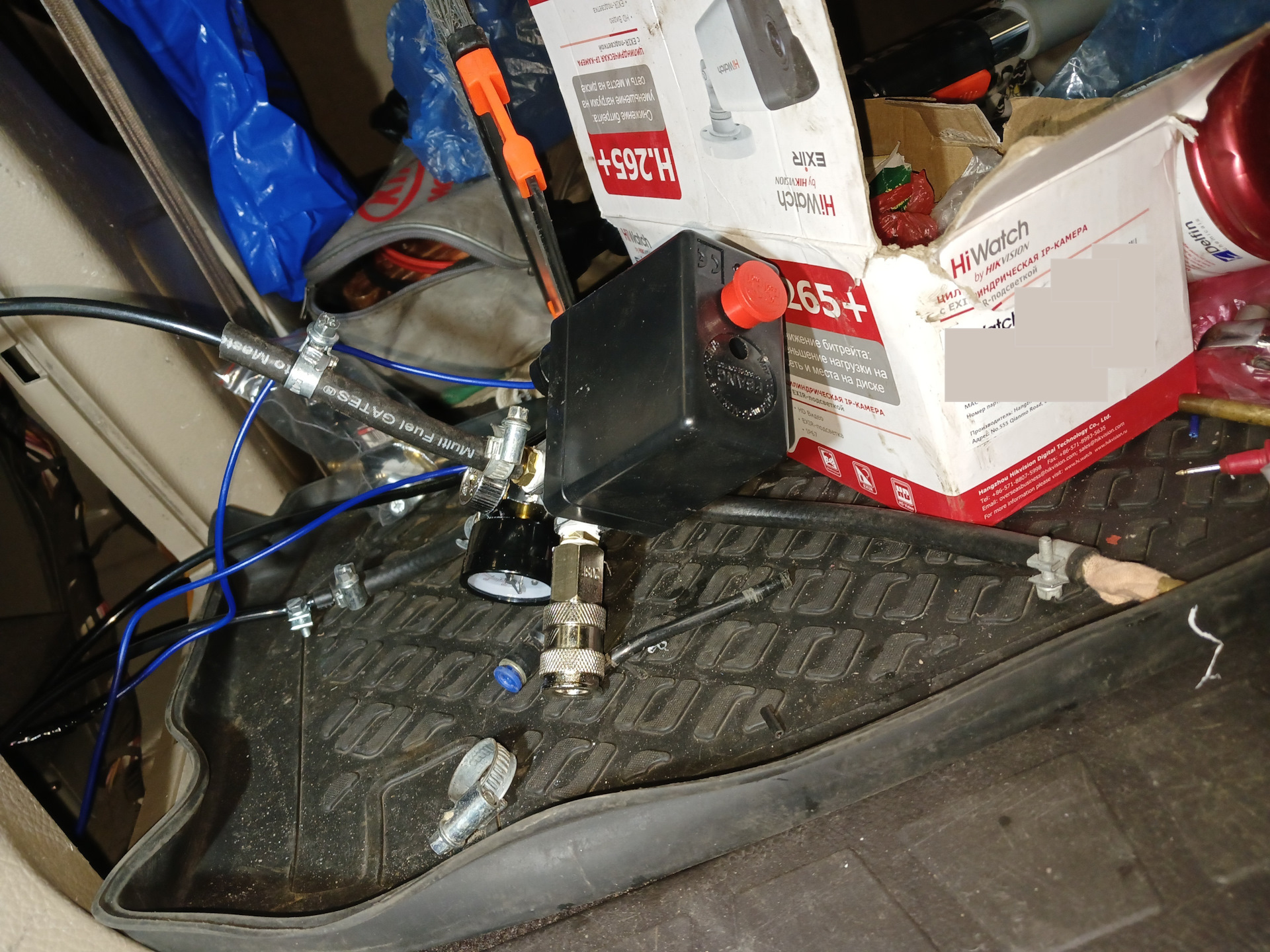 Теперь у меня воздух уходит быстрее, а компрессор мощный, приходится к аккумулятору присоединять, разматывая шланг вокруг всей машины, поэтому и запитал пневмобаллоны от штатного компрессора, переделав, по сути, систему управления.