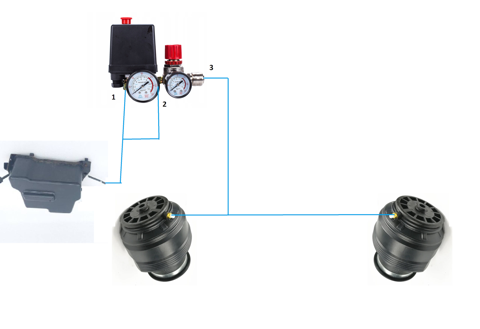 Описание работы простое. При включении габаритов питание подается на реле давления, и если давление в ресивере ниже настроенного значения, реле замыкает контакты, включая компрессор. А при достижении нужного давления (обычно 8-12 атм), отключает компрессор. Через реле-регулятор давления воздух выходит в контур пневмобаллонов.