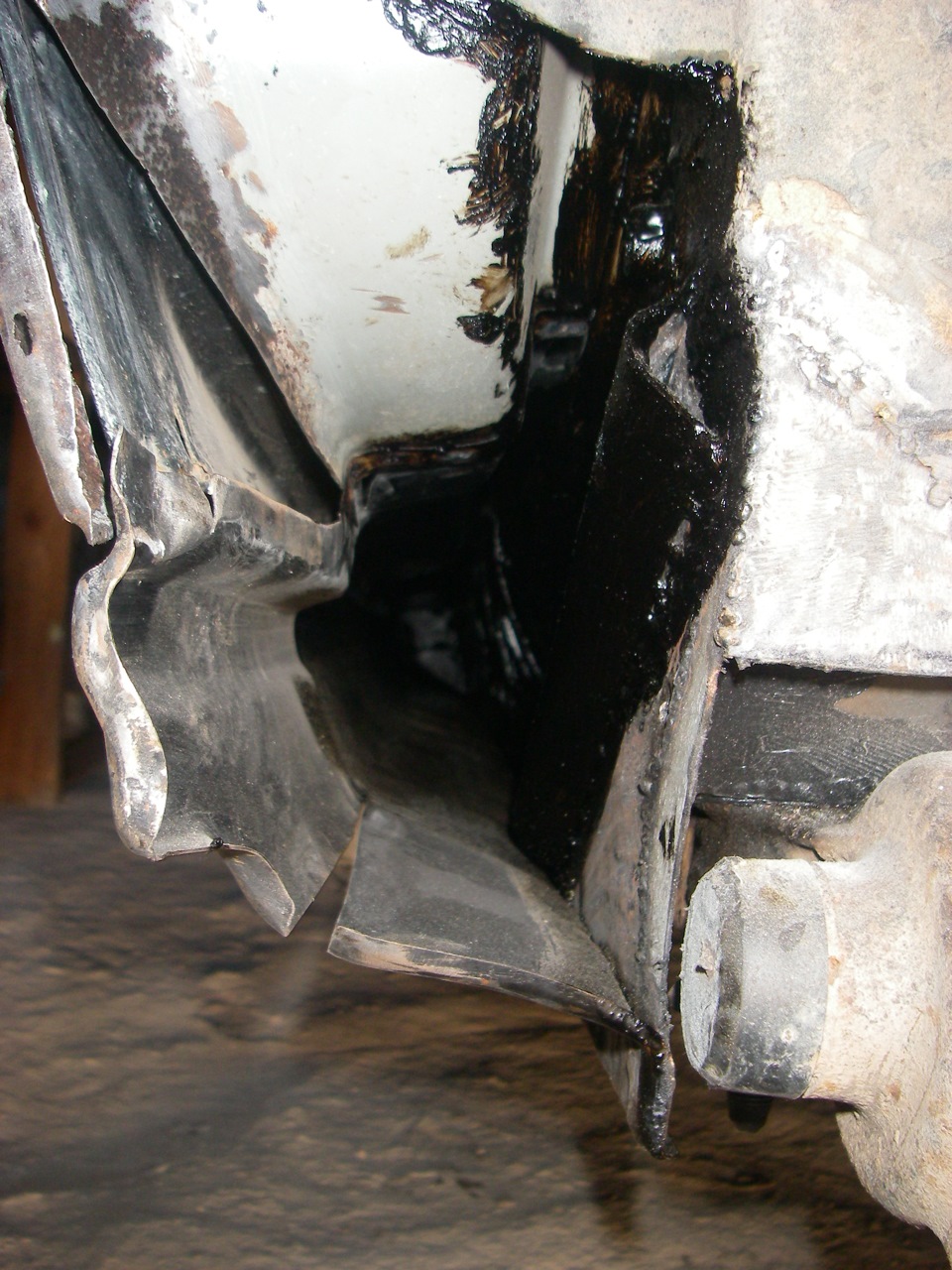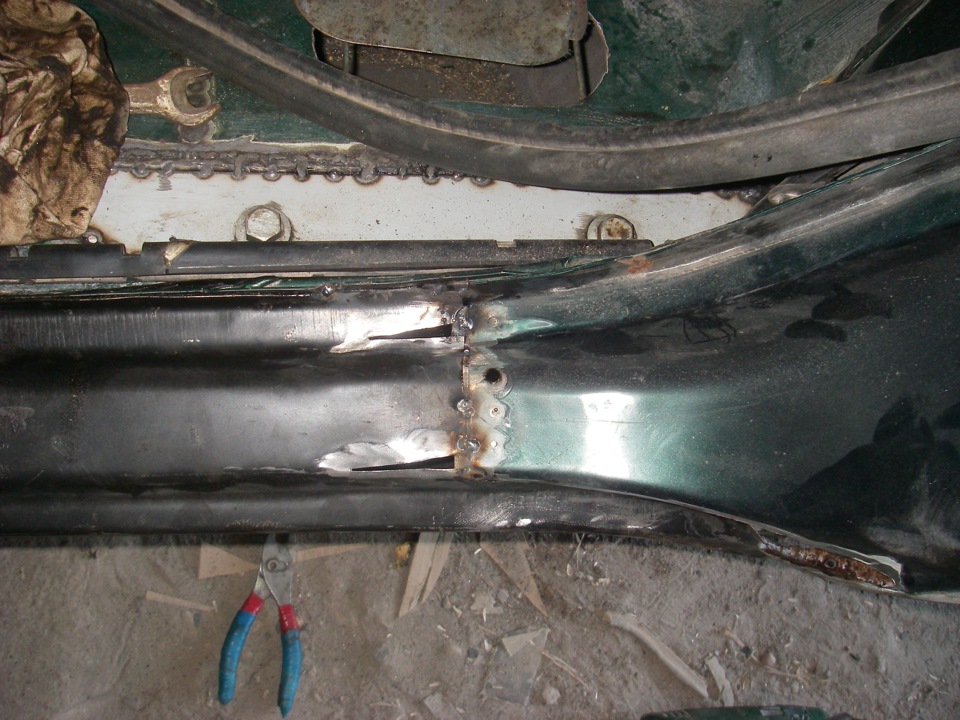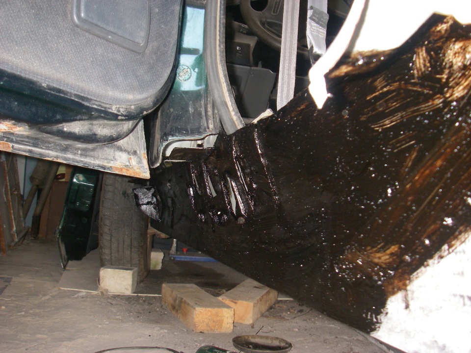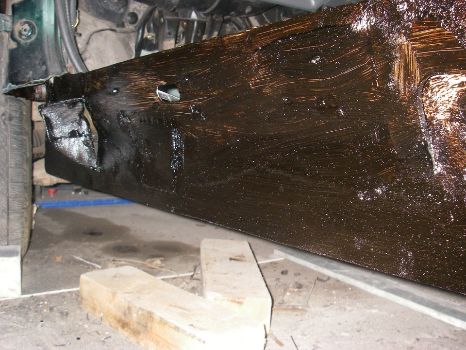Эпоксидкой я думал покрыть новую внутреннюю часть порога, но после того как понял, что чтобы смыть или там счистить всю его магазинную грунтовку (я так и не разобрался транспортная она или нет) мне понадобится как минимум литр растворителя и еще день работы, я залил пушсалом с бикором и её! Если там что-то и начнет когда то отслаиваться под этой мастикой, то по идее вообще должно самозалечиваться…