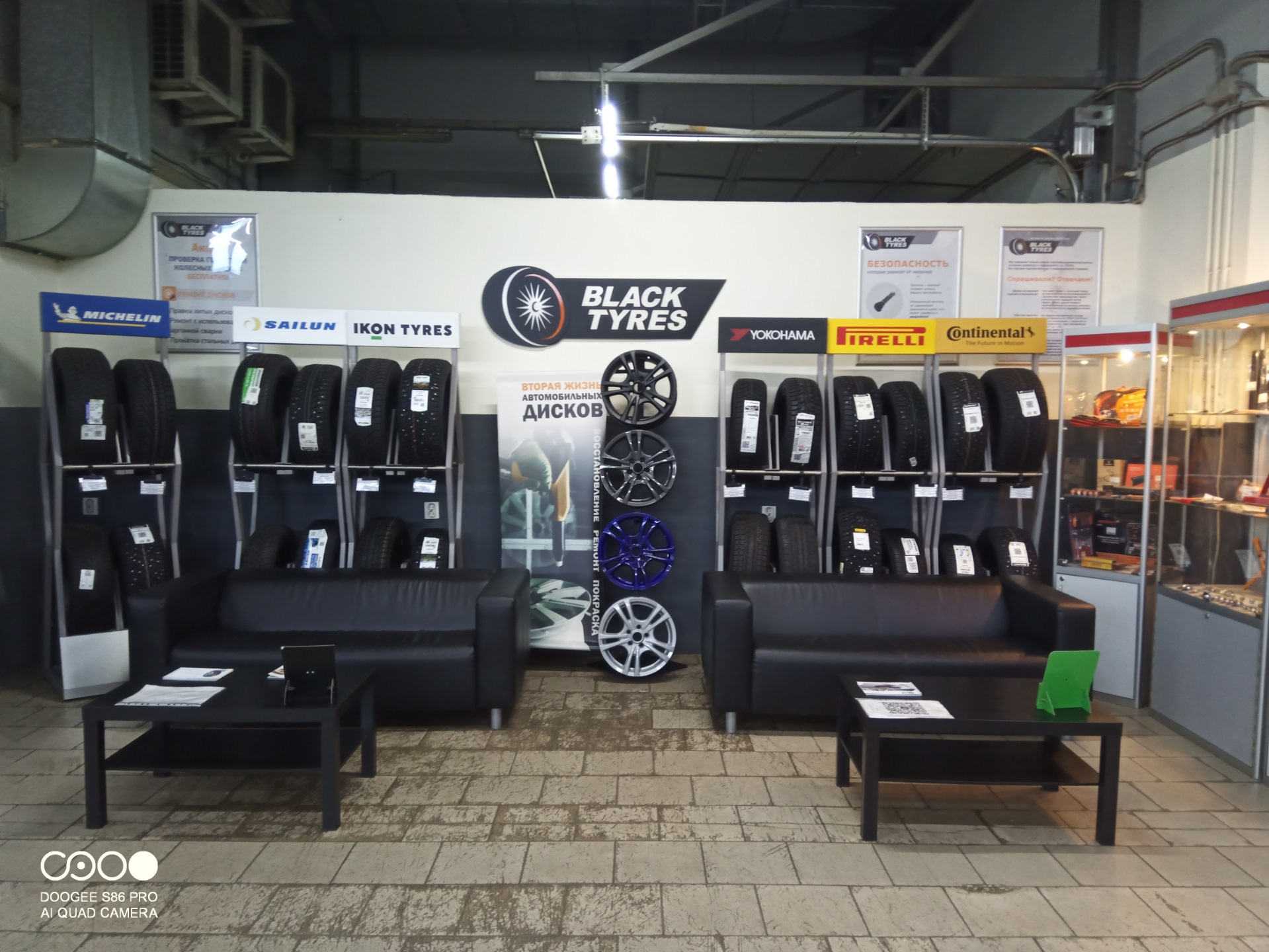 Шиномонтаж Black Tyres большой, одновременно может принять до 8 машин. Чисто, есть зона ожидания, стенд с продукцией, короче норм.