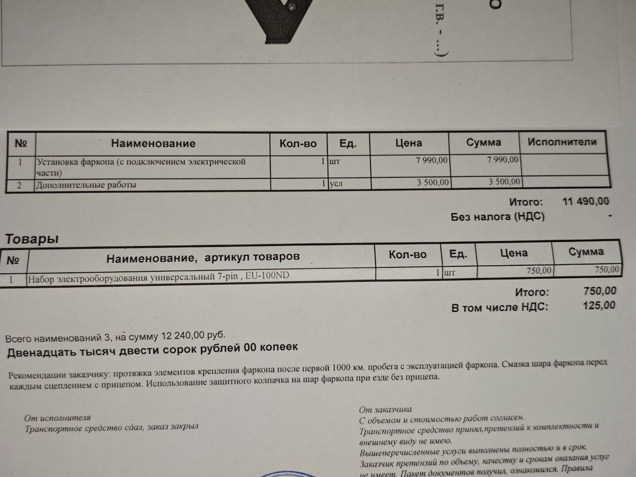 Теперь нам нужны бумаги на фаркоп: паспорт + сертификат соответствия. Установщики поставят печать.