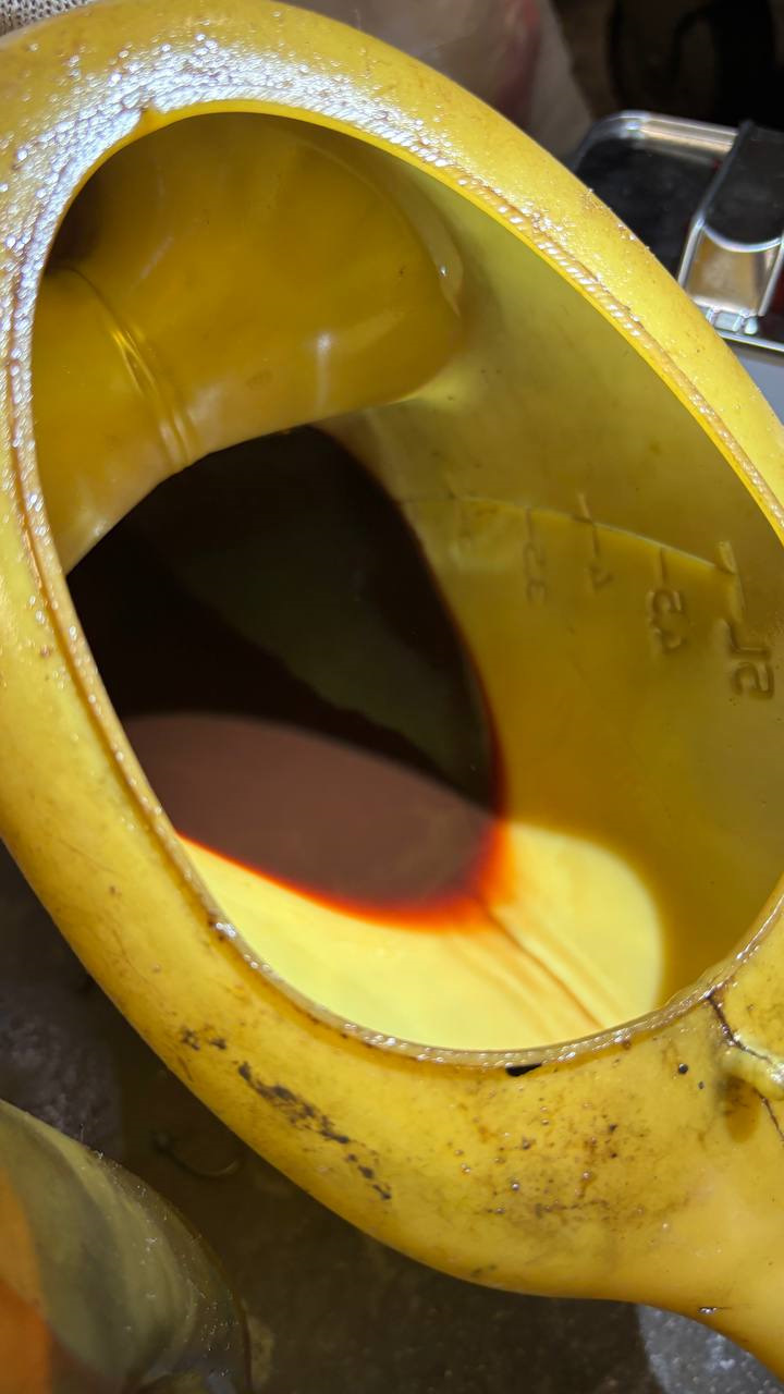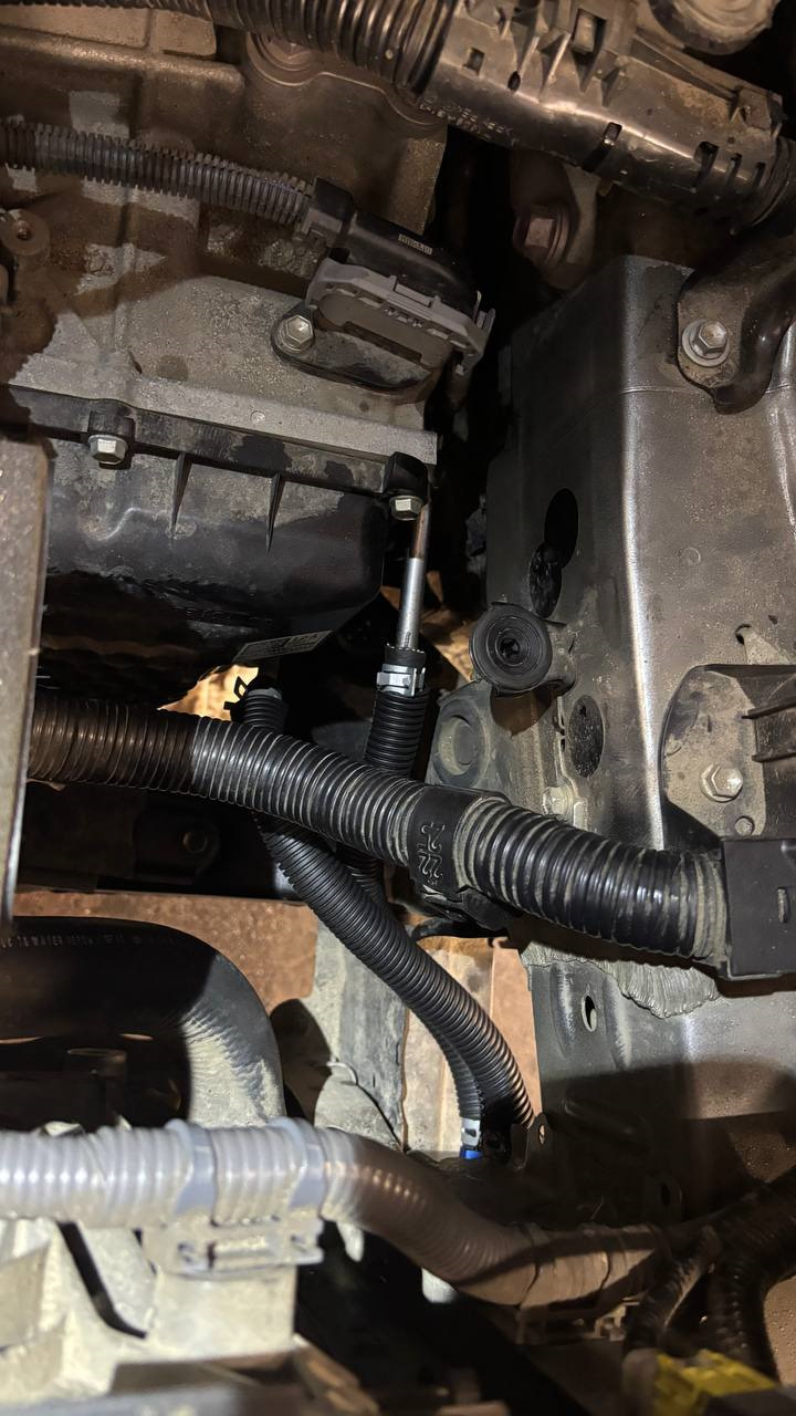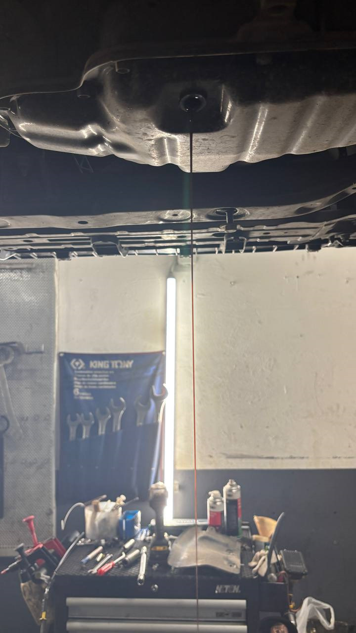 Всё подключили, запустили двигатель, прогрели коробку до 42 градусов и слили лишнее масло через сливную пробку, в ней установлена мерная трубка уровня (она также откручивается при замене масла). Как было первое прерывание струи и масло перестало быстро течь, закрутили пробку, чтобы еще мл 100-200 заполнили систему радиатора. После чего прогрели коробку до 75 градусов и посмотрели, как всё работает. Всё работает корректно и нигде ничего не течет.
