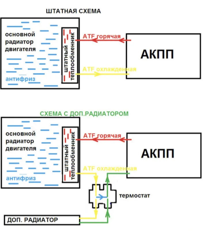 Термостат идет в разрез контура теплообменник-коробка и следовательно масло просто идет с темпообменника (через закрытый термостат) на коробку. А когда термостат открыт, то жидкость с теплообменника поступает (в термостат и через него) на доп радиатор, а потом с радиатора (через термостат) в коробку. То есть получается два контура маленький и большой.