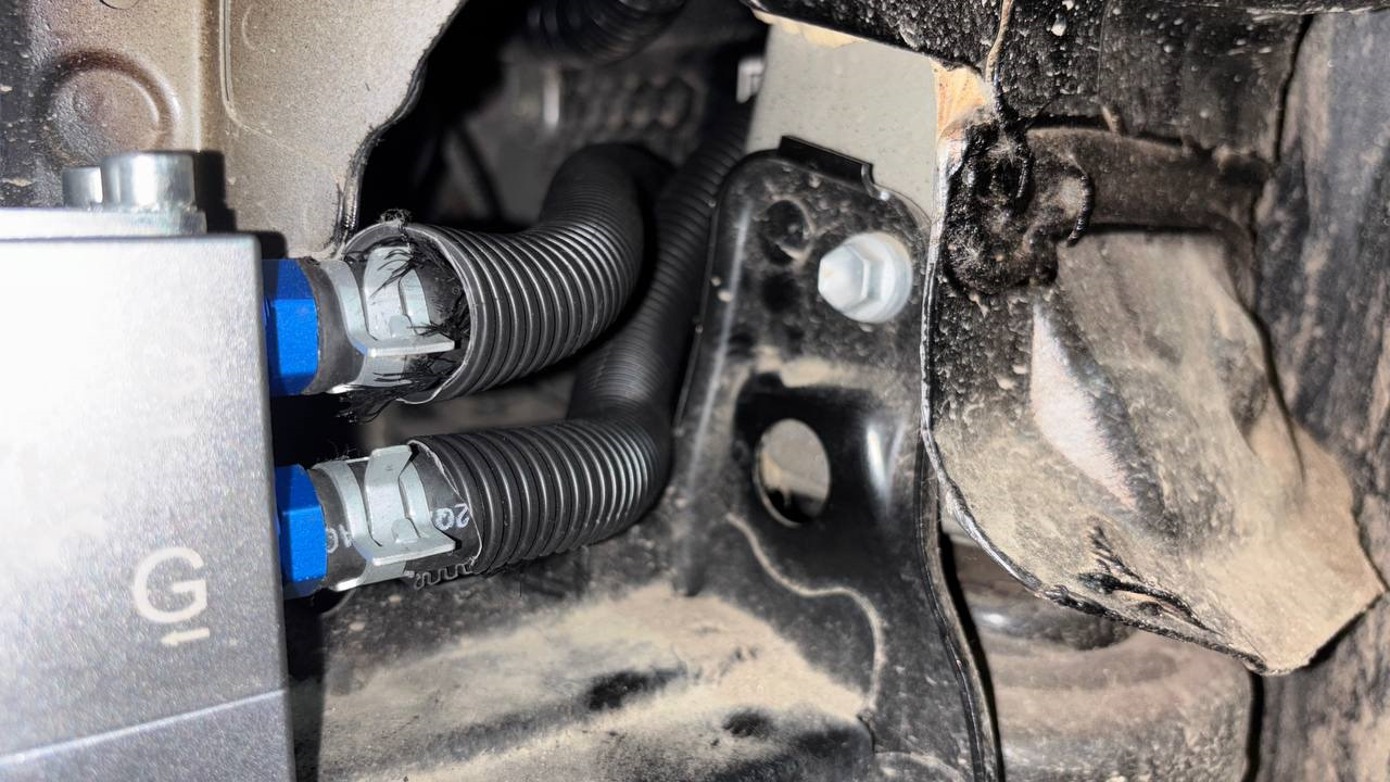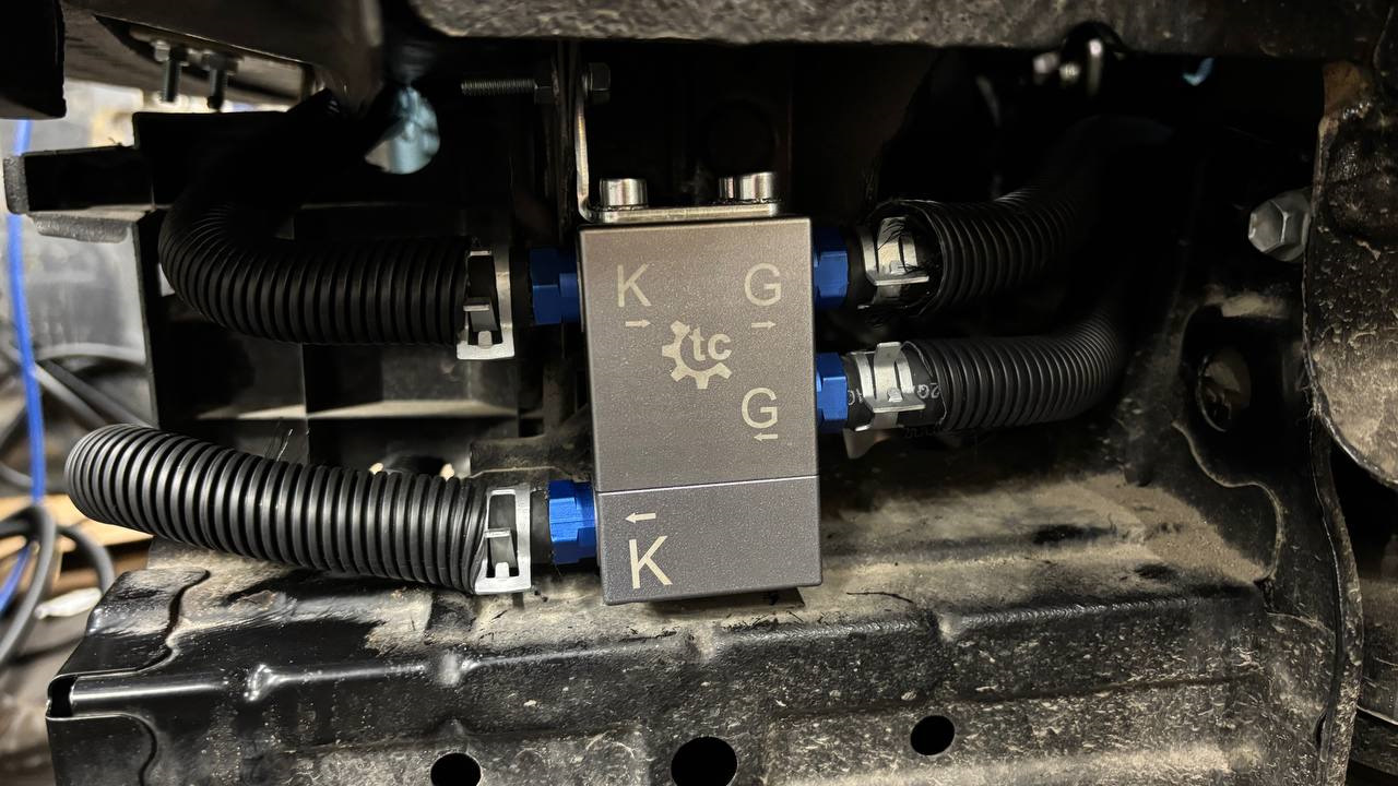 Из K← выходит шланг на радиатор (подключили к нижнему штуцеру), в К→ заходит шланг с радиатора (верхний штуцер радиатора). Для прокладывания шлангов от термостата к радиатору сделали 2 отверстия в пластиковом кожухе направления воздуха. Шланги на всякий случай в чулке и гофре, чтобы со временем ничего не перетерлось.