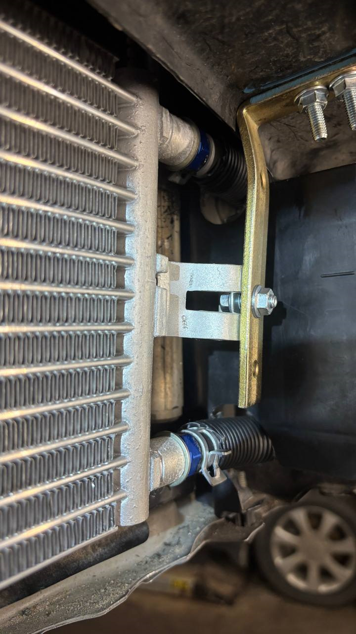 Примерили радиатор у него достаточно большие проушины, а также штуцера выходят в бок, поэтому изогнули крепления, чтобы зафиксировать к уголкам.