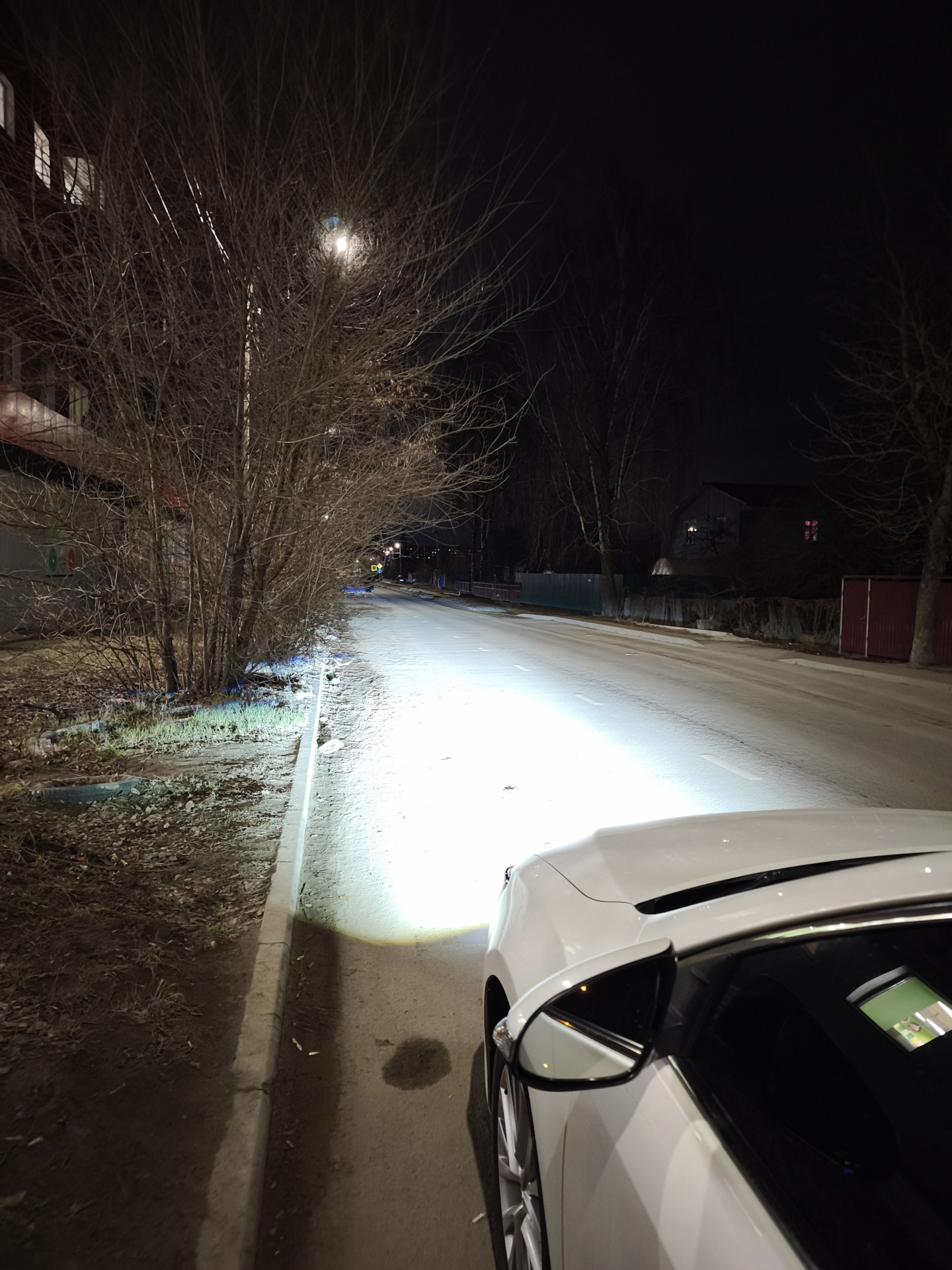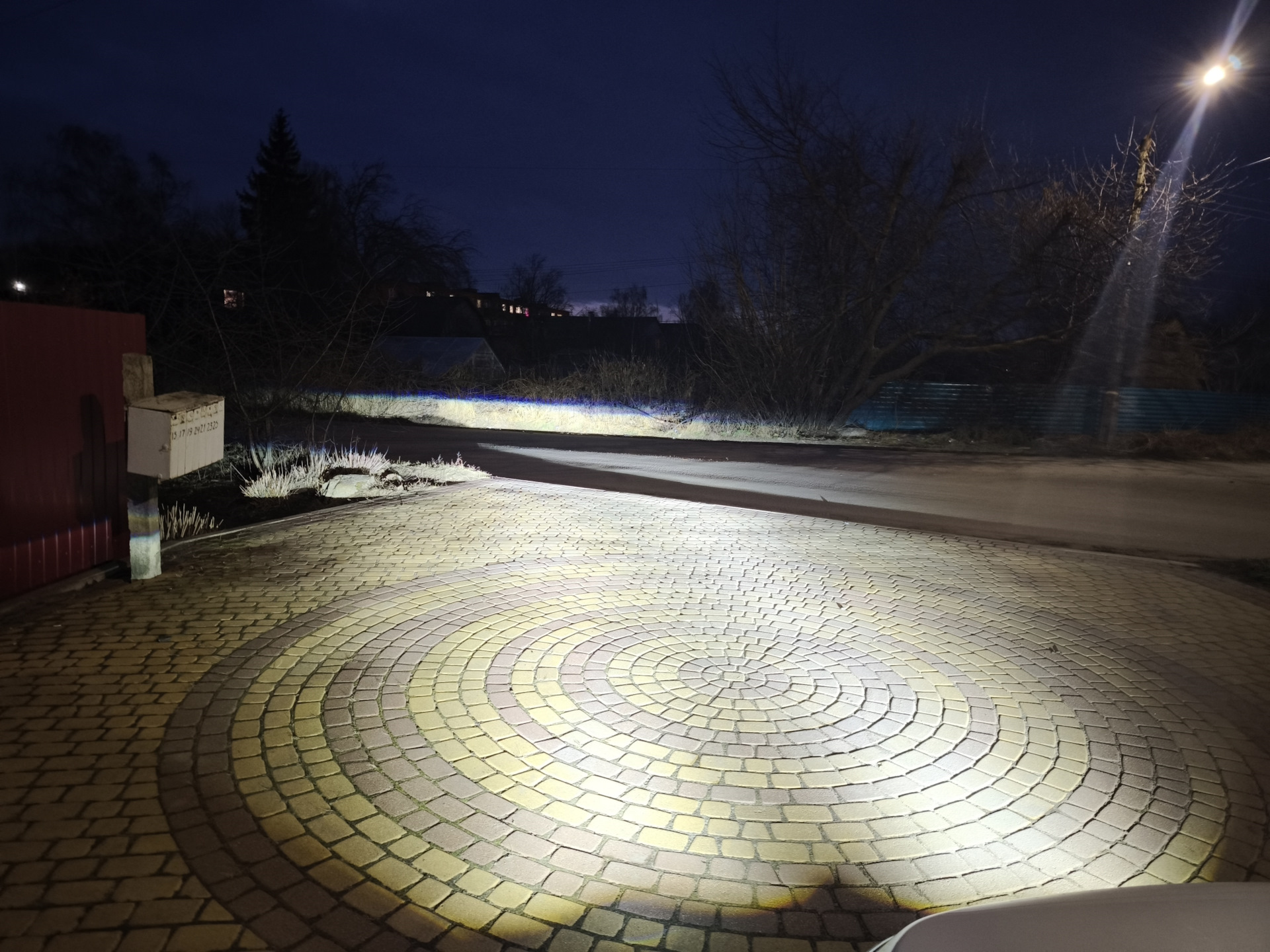 Проверка возле авто, просто небо и земля, штатные ПТФ светят "свечкой" по сравнению с bi-led. СТГ четкая с небольшим отливом синевы, что не совсем приятно глазу, но пятно пучка света массивное.
