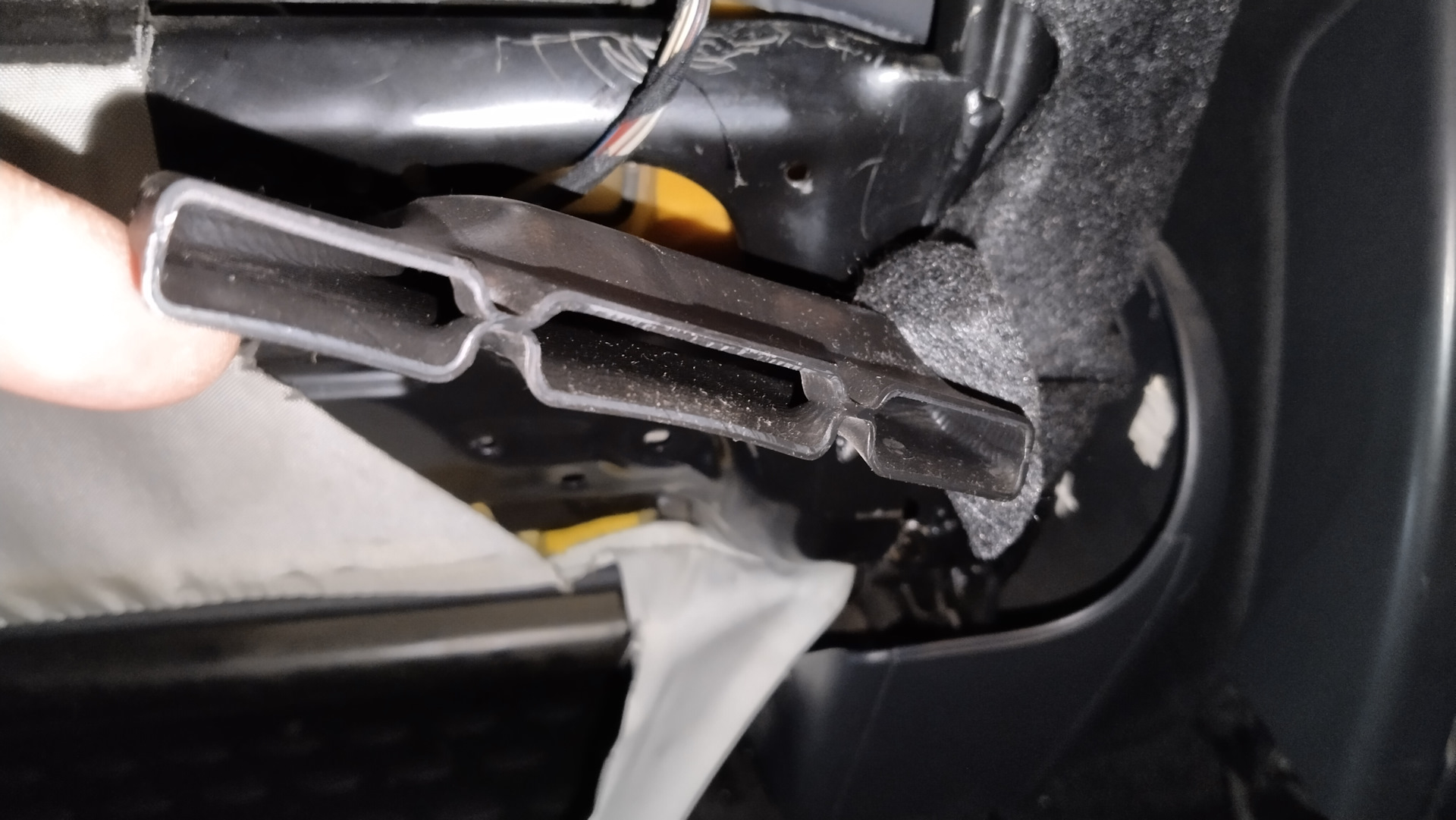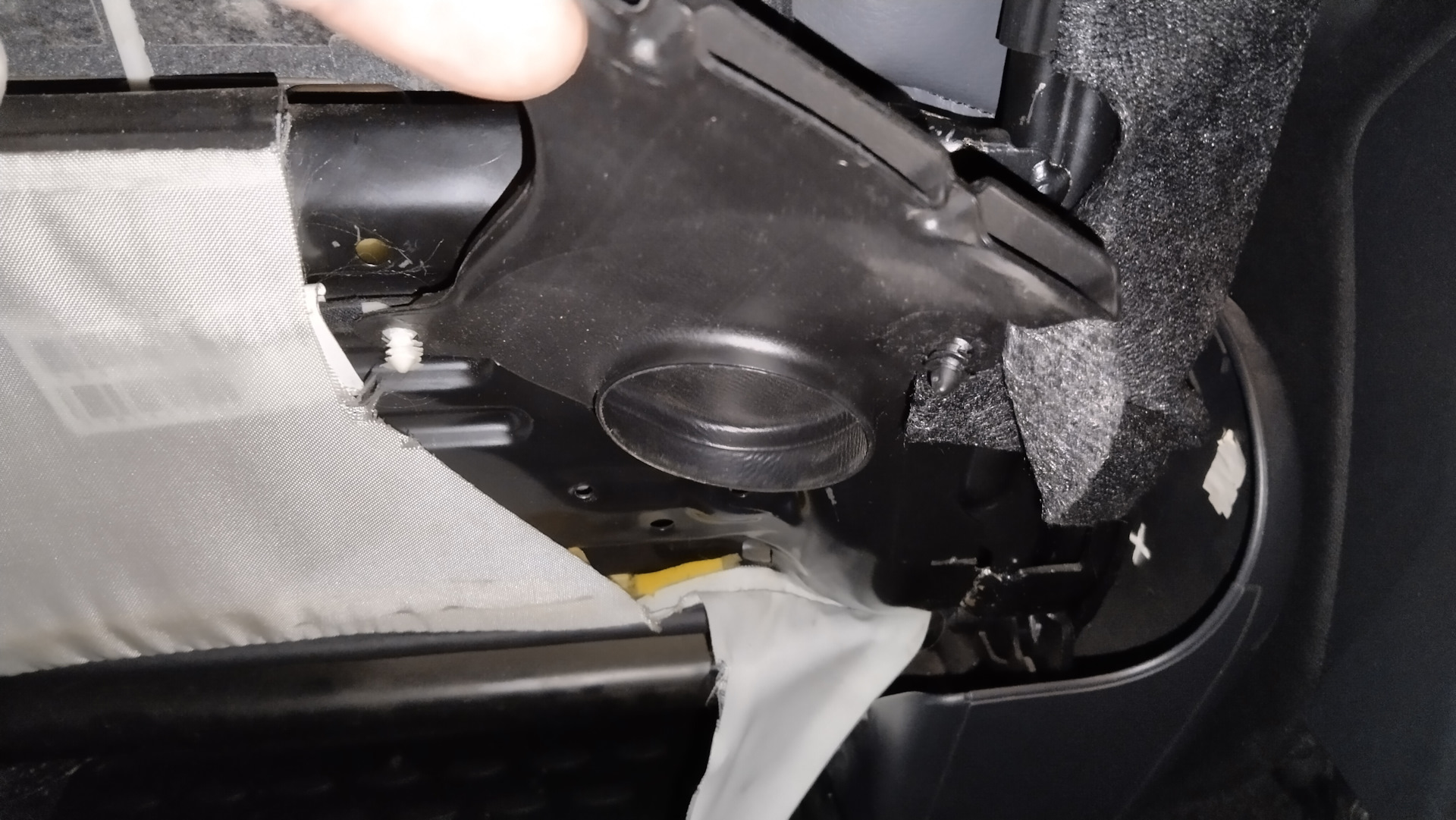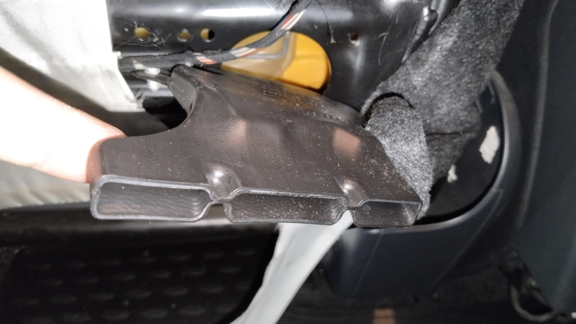 Отстегиваем лямку — получаем доступ к воздухозаборнику. Под ним находятся три самореза торкс, которые крепят конструкцию обогревателя к сиденью. Для доступа к ним надо отодвинуть воздухозаборник — он крепится на двух пистонах по диагонали — полностью его снимать нет нужды, он остается висеть на проводе и тряпочке.