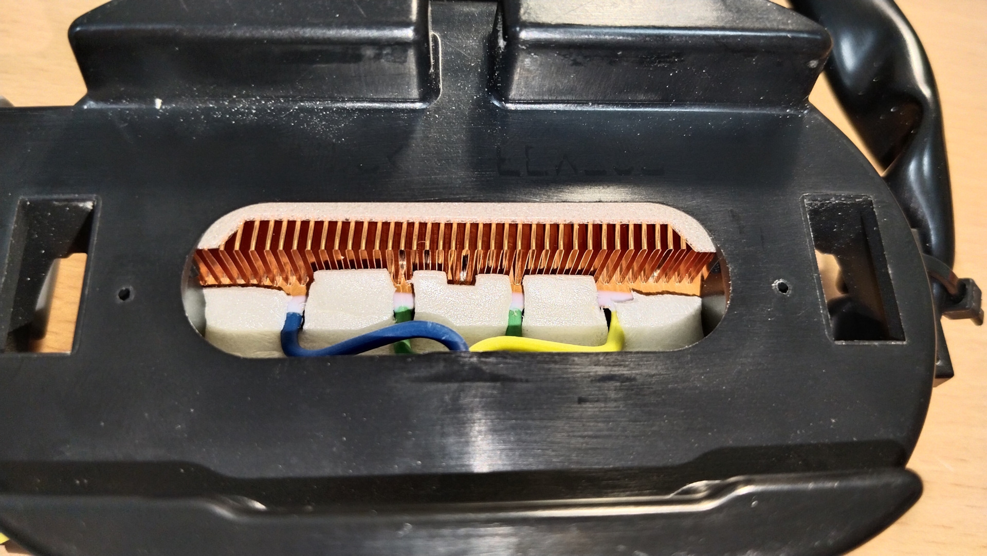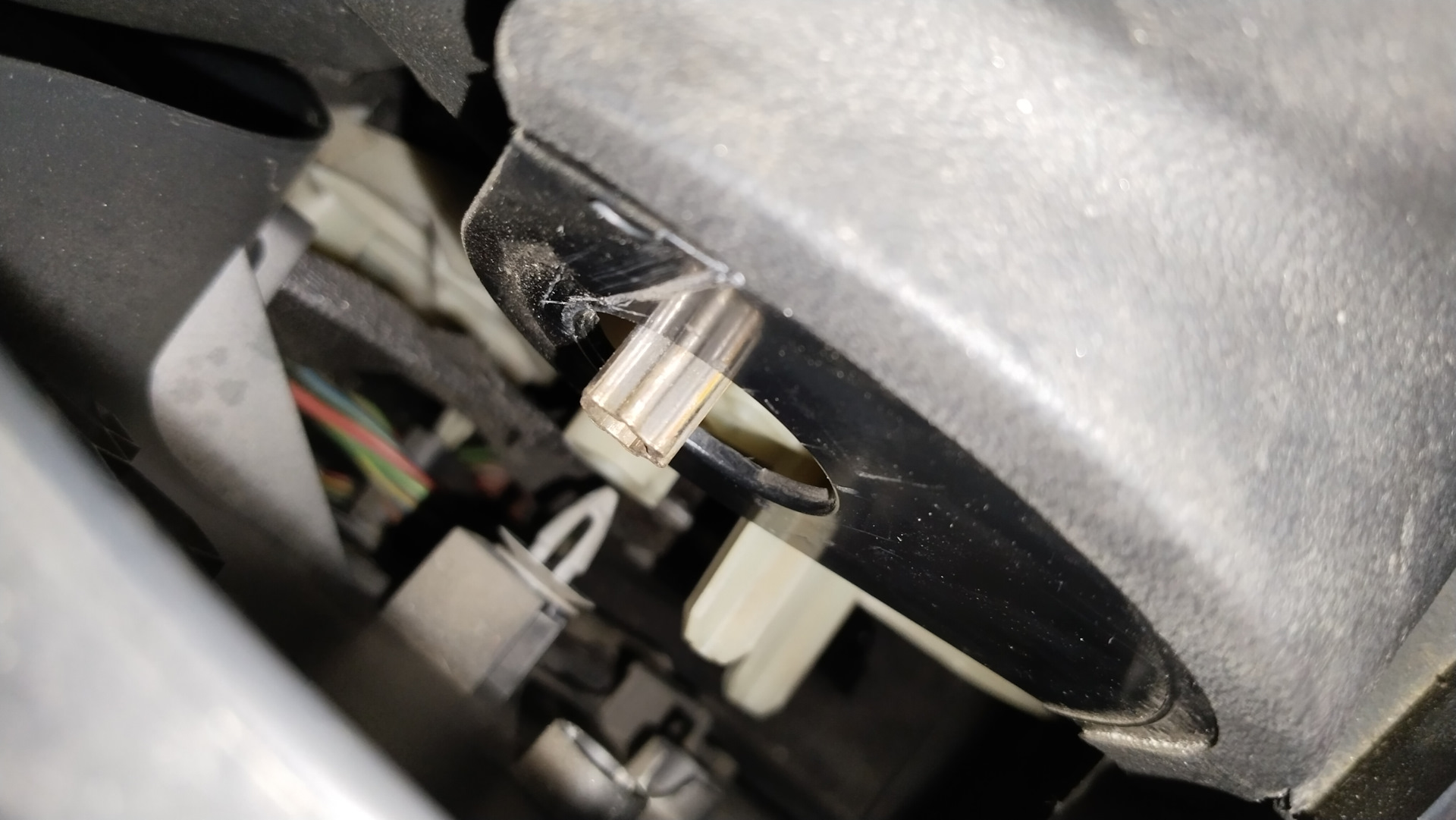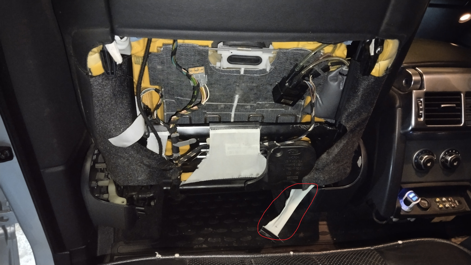 Отстегиваем лямку — получаем доступ к воздухозаборнику. Под ним находятся три самореза торкс, которые крепят конструкцию обогревателя к сиденью. Для доступа к ним надо отодвинуть воздухозаборник — он крепится на двух пистонах по диагонали — полностью его снимать нет нужды, он остается висеть на проводе и тряпочке.