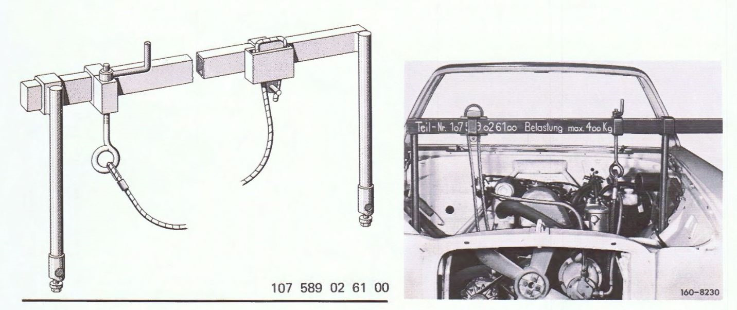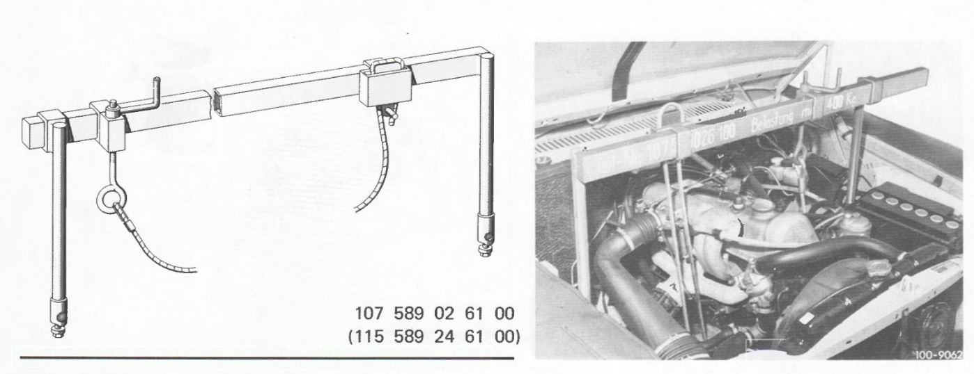 Оригинальная Мерседесовская приблуда (107589026100, 115589246100) опирается, не на проёмы крыльев (универсальные траверсы для вывешивания двигателя), а на чашки крепления амортизаторов