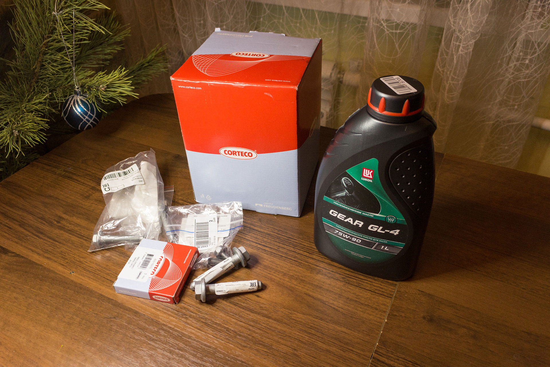 Были приобретены новая опора Corteco 21652822, сальник Corteco 120 169 28B и болты VAG N 105 167 02 (2 шт), VAG N 101 559 06 (2 шт), VAG N 102 096 05 (2 шт). По поводу болтов до последнего момента терзался сомнениями, т.к. многоуважаемые камрады с drive2.ru озвучивали разное количество. В конечном итоге доверился Етке и остановился на числе 6. Дополнительно прикупил в Озоне литруху полусинтетики ЛУКОЙЛ GEAR GL-4 (75W-90), если вдруг потребовалась бы доливка в КПП.