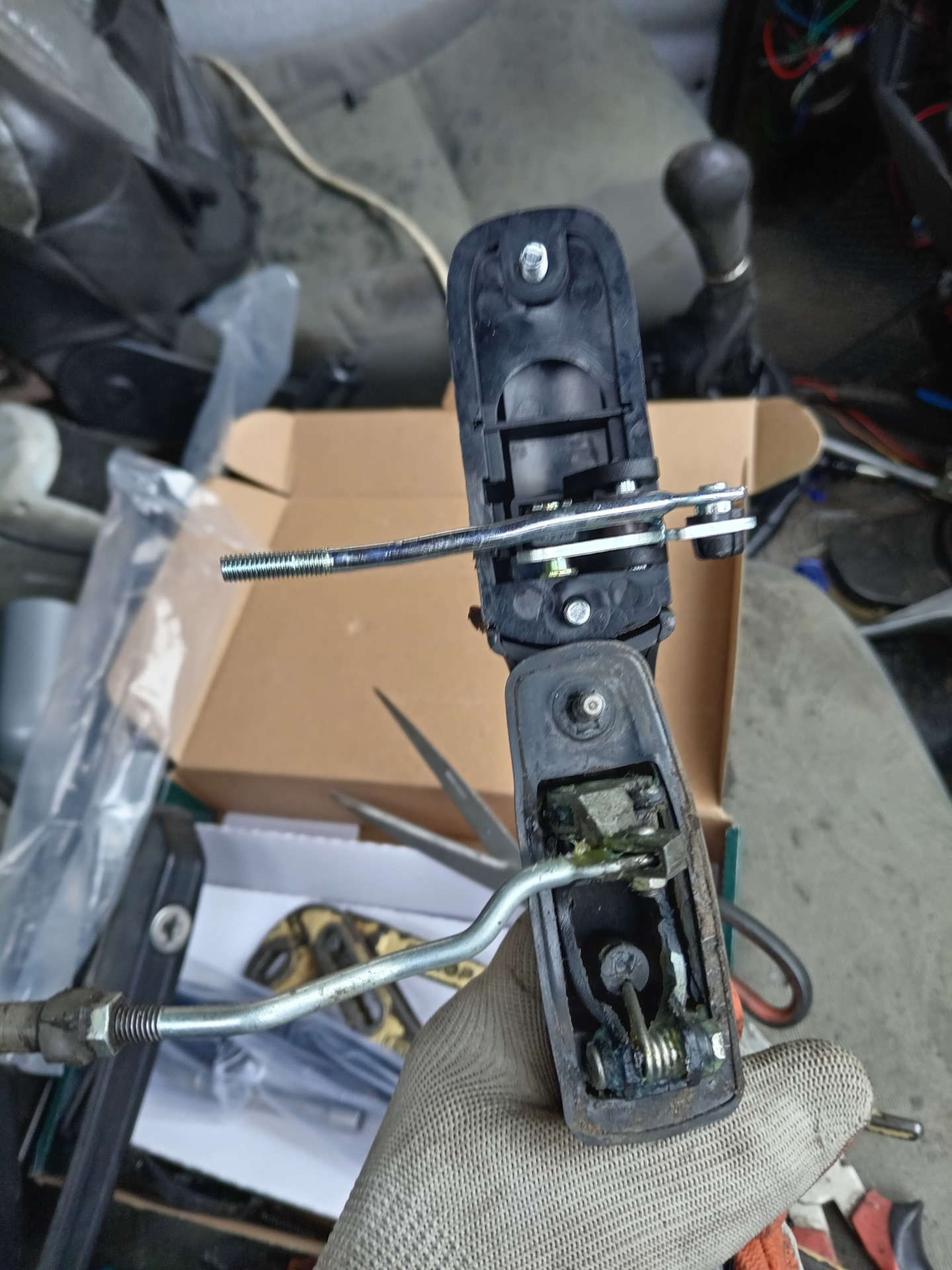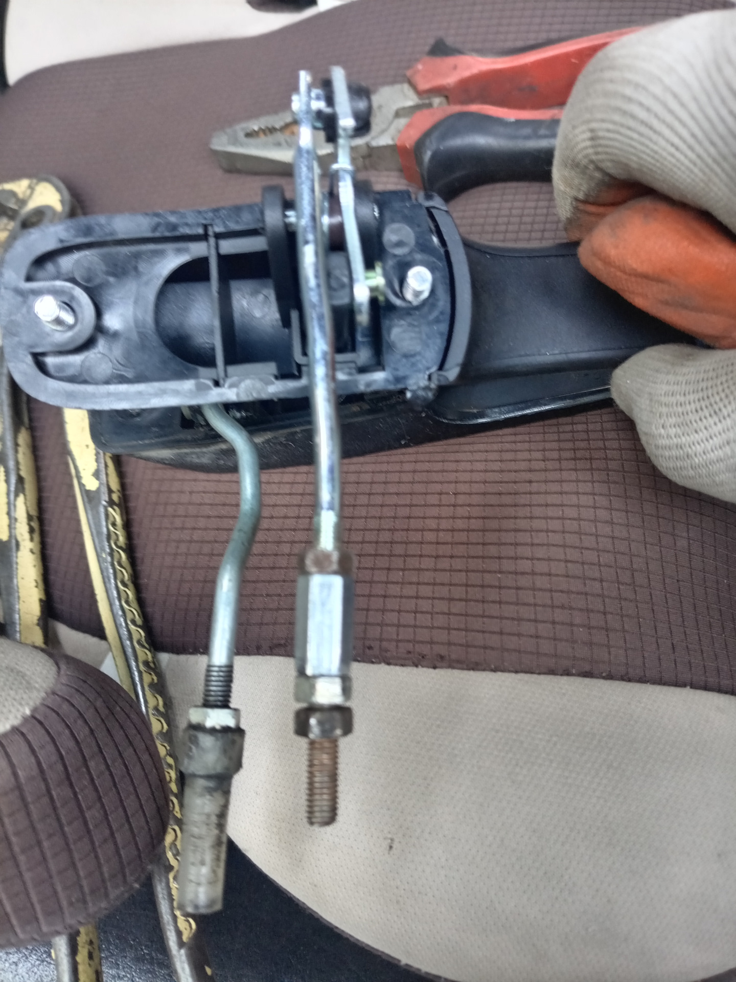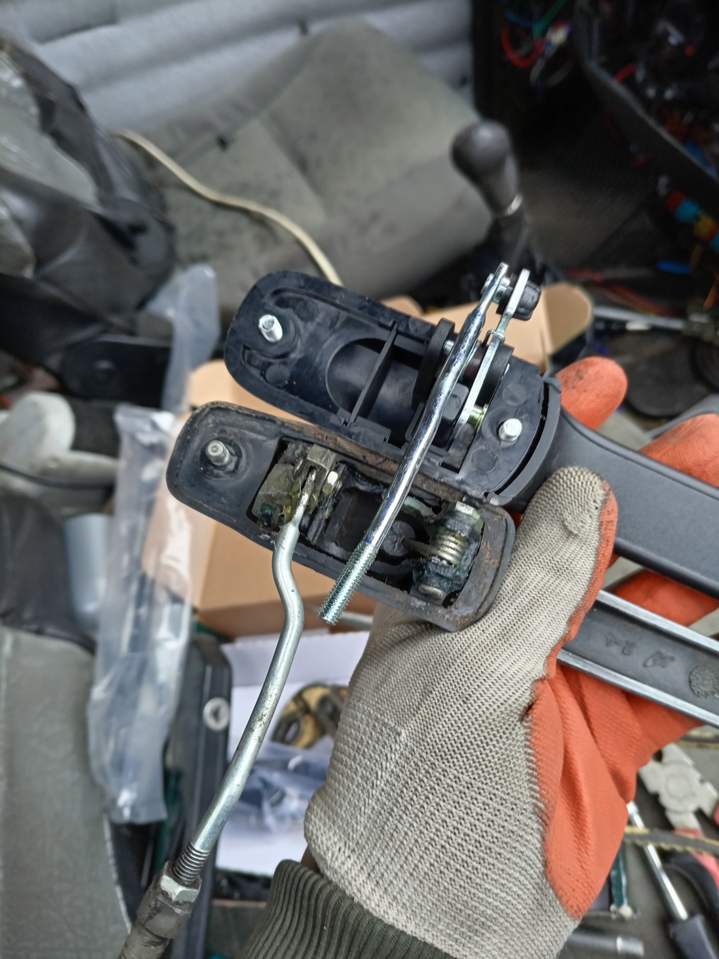 и перекинул пластмассовую пимпочку. Чтобы прикрутить ручку, пришлось открутить механизм открывания замка, т.к. чтобы ручку вставить ее нужно выдвинуть, как бы в открытое положение, а она упирается в механизм. Закрыл дверь, поехал домой, а дверь на ходу открылась. На следующий день раз 100500 снимал ставил, то дверь сама открывается, то не закрывается. В результате кое как подогнал длинну тяги, отрегулировал механизм замка, предварительно промыв и смазав, отрегулировал ответу замка. Также промыл и смазал механизм открывания.