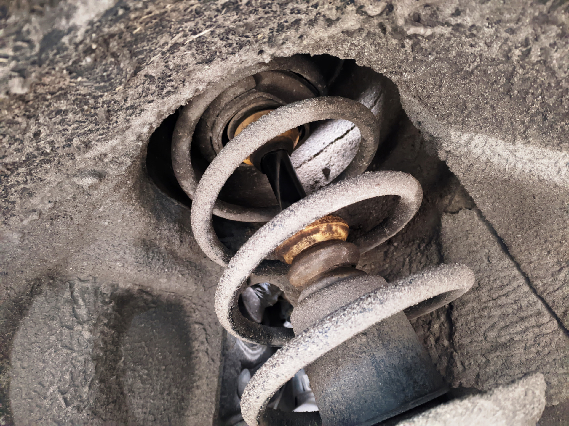 Далее, открутил гайку, опустил шток вниз. Извлек остатки отбойника. С большим трудом достал наш пластиковый пыльник — он никак не хотел проходить между витками пружины. Но я оказался сильнее. Сейчас знаю, есть мягкие пыльники. Можно было бросить на этом этапе и снять стойку. Но это дольше и сложнее, чем работать с полиуретаном внутри пружины. Вот в таком виде были отбойники после снятия.