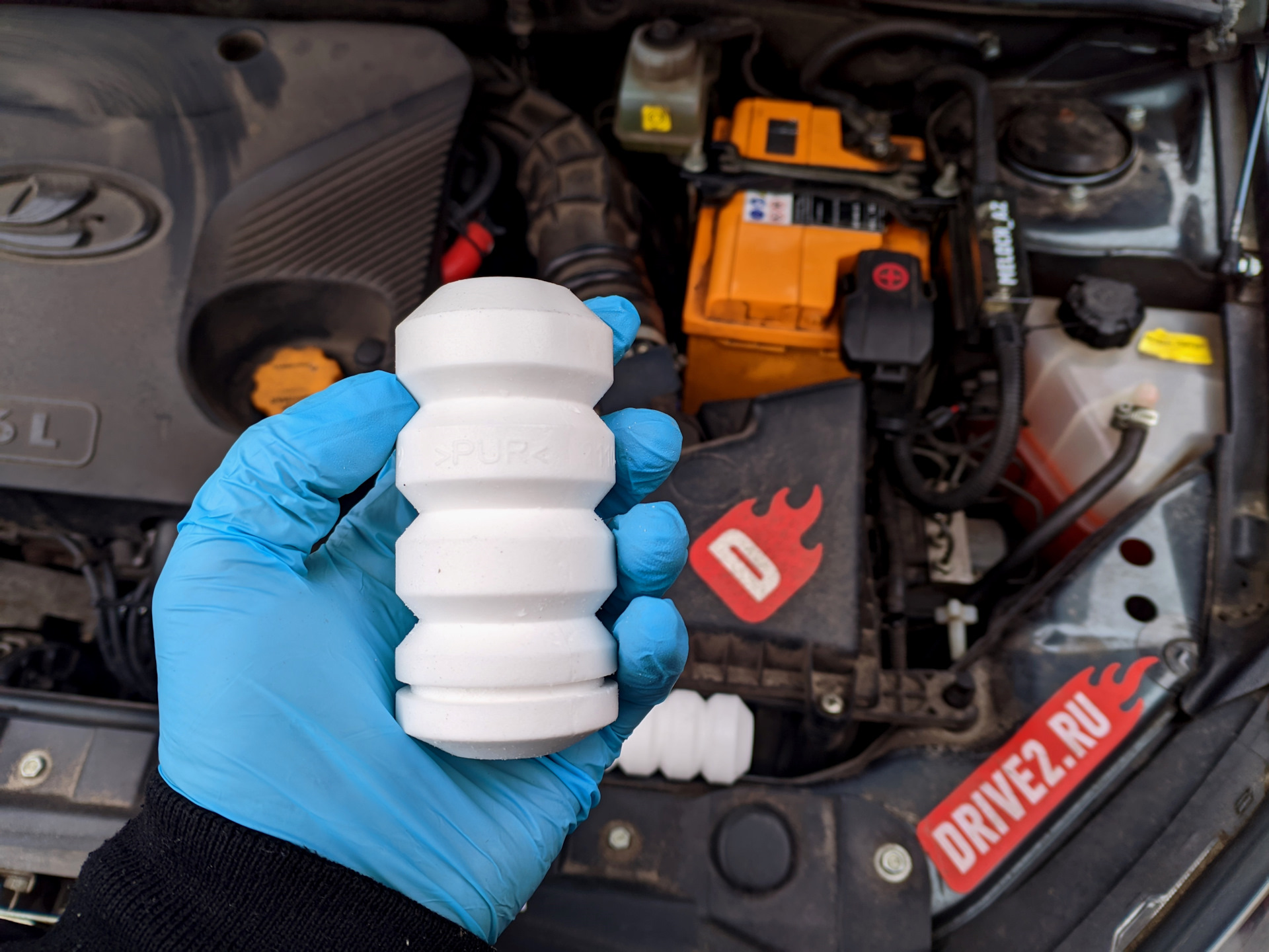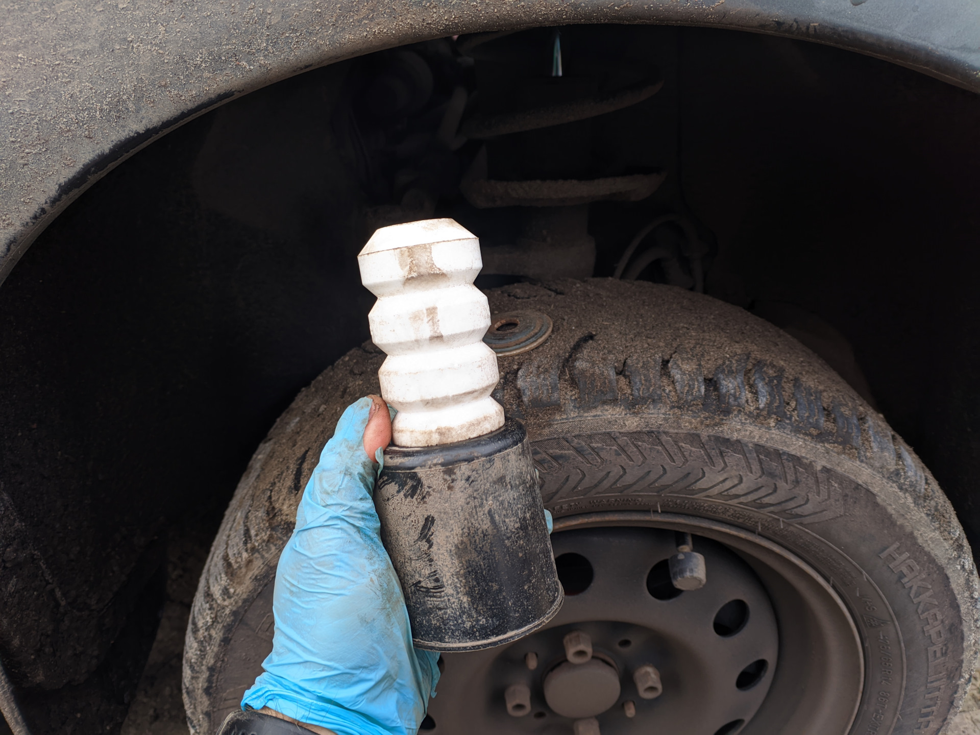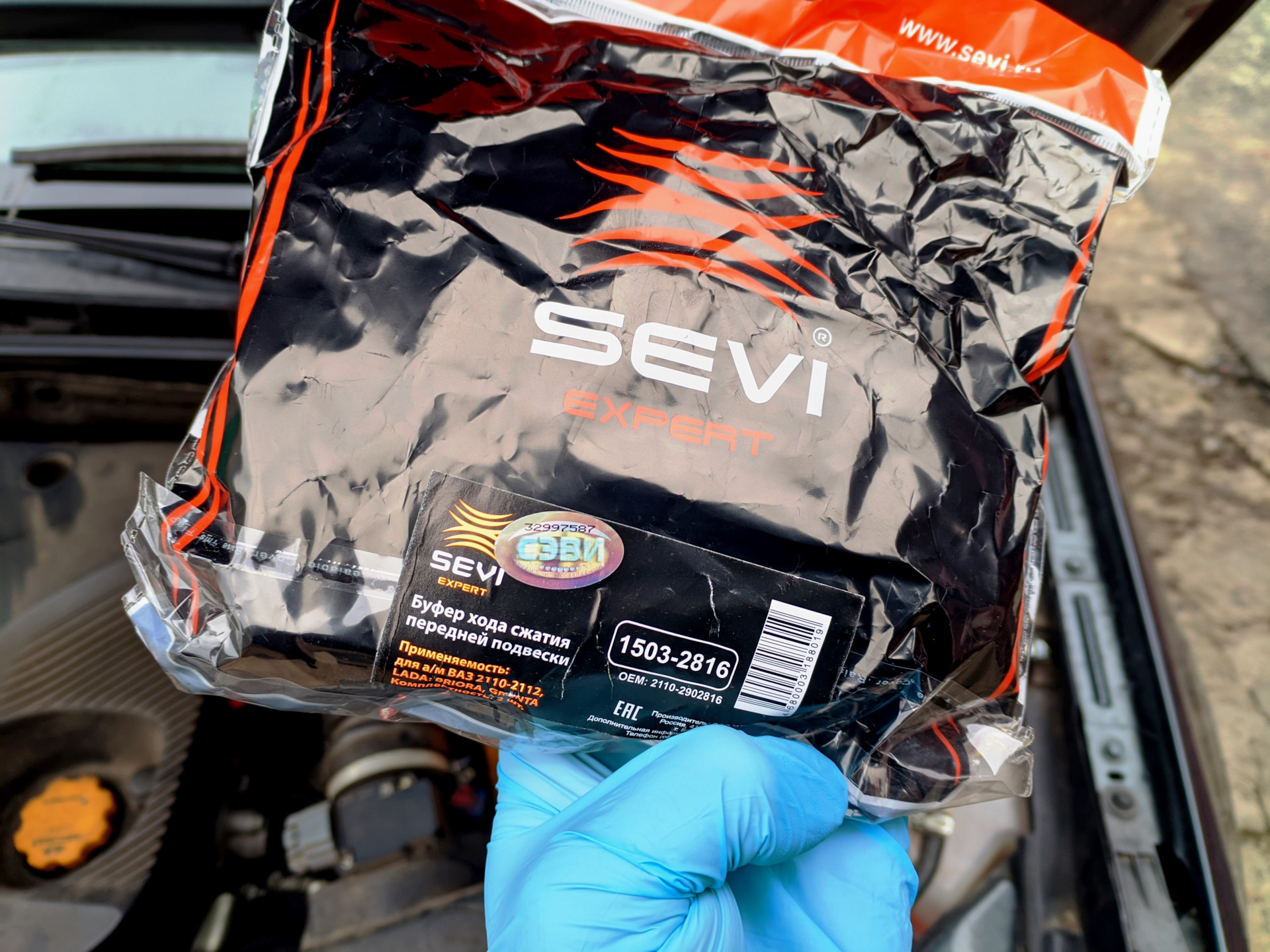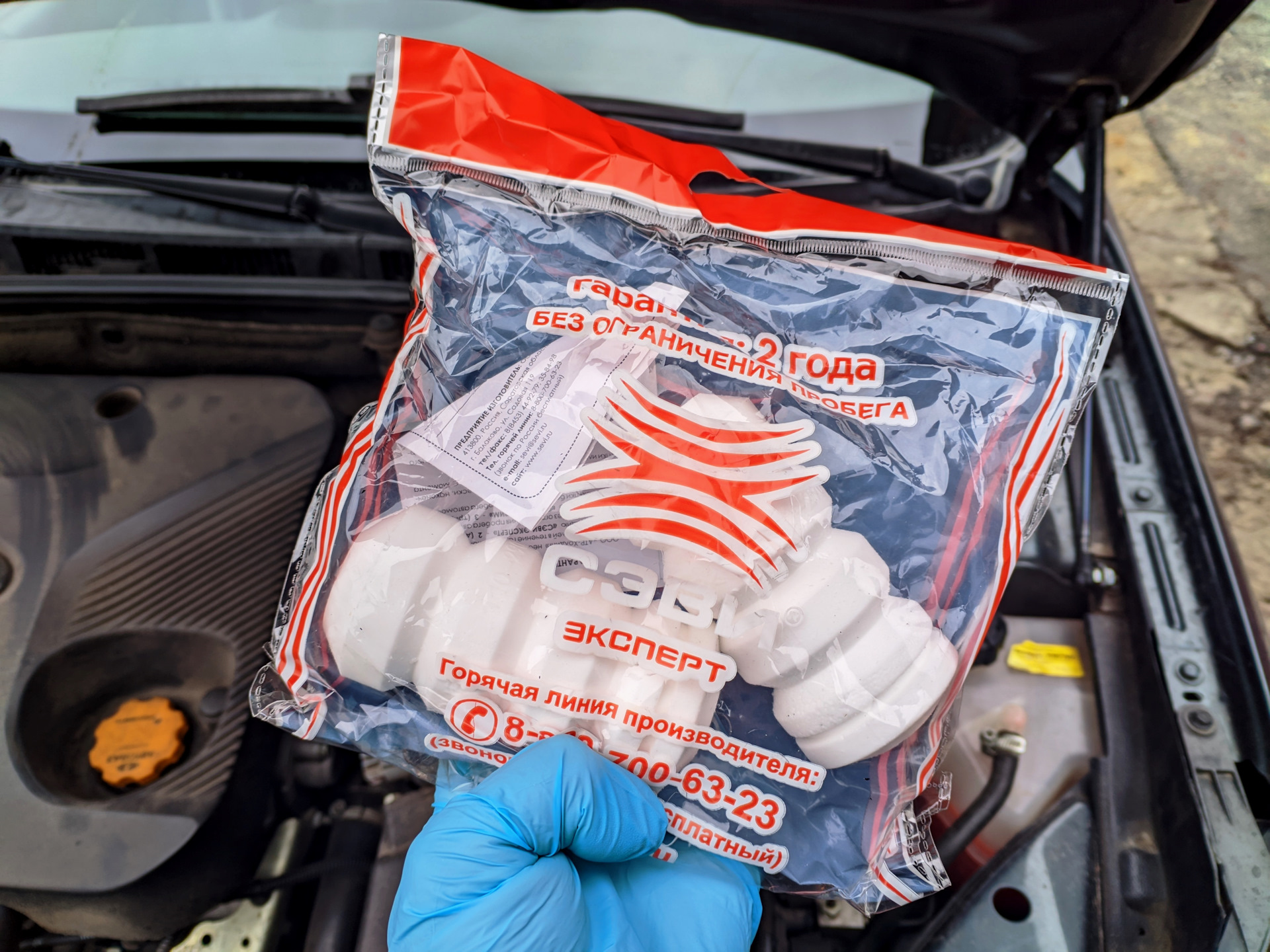 Ну и попутно, мастер сказал, что отбойники у передних стоек разбиты в хлам — надо менять. Но отбойники я уже заказал на озоне, т.к. менять буду сам. В сервисе слишком дорого выйдет со снятием стойки и поворотного кулака. Отбойники у нас от десятки. Купил опять СЭВИ Эксперт. Артикул — 15032816.