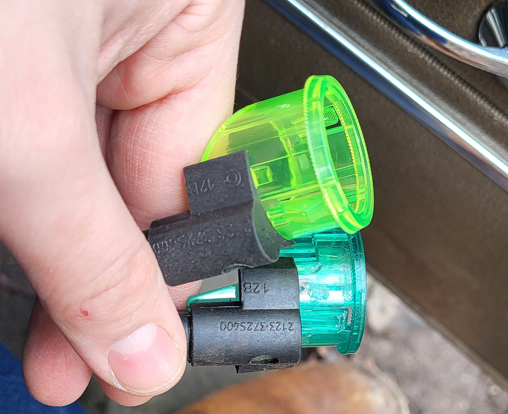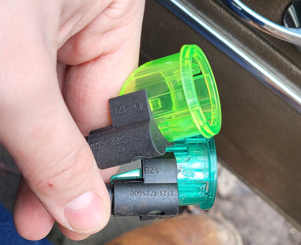 Вставил я сам патрон в зеленую оправку от МЗАТЭ-2, родная оправка (черная с крышечкой) идет для пластика и попросту выпадает из отверстия (которое теперь для нее и слишком большое к тому же). Но при этом сами патроны розетки очень похожи, у них один и тот же разъем, к примеру. Только в розетке без прикуривателя нет подсветки и соответственно одного контакта в разъеме. В теории можно даже как то в этот разъем протащить контакт и будет подсветка зеленого кольца, но у меня не получилось и я забил. Розетка завальцована и ее не разобрать, так что пофиг.