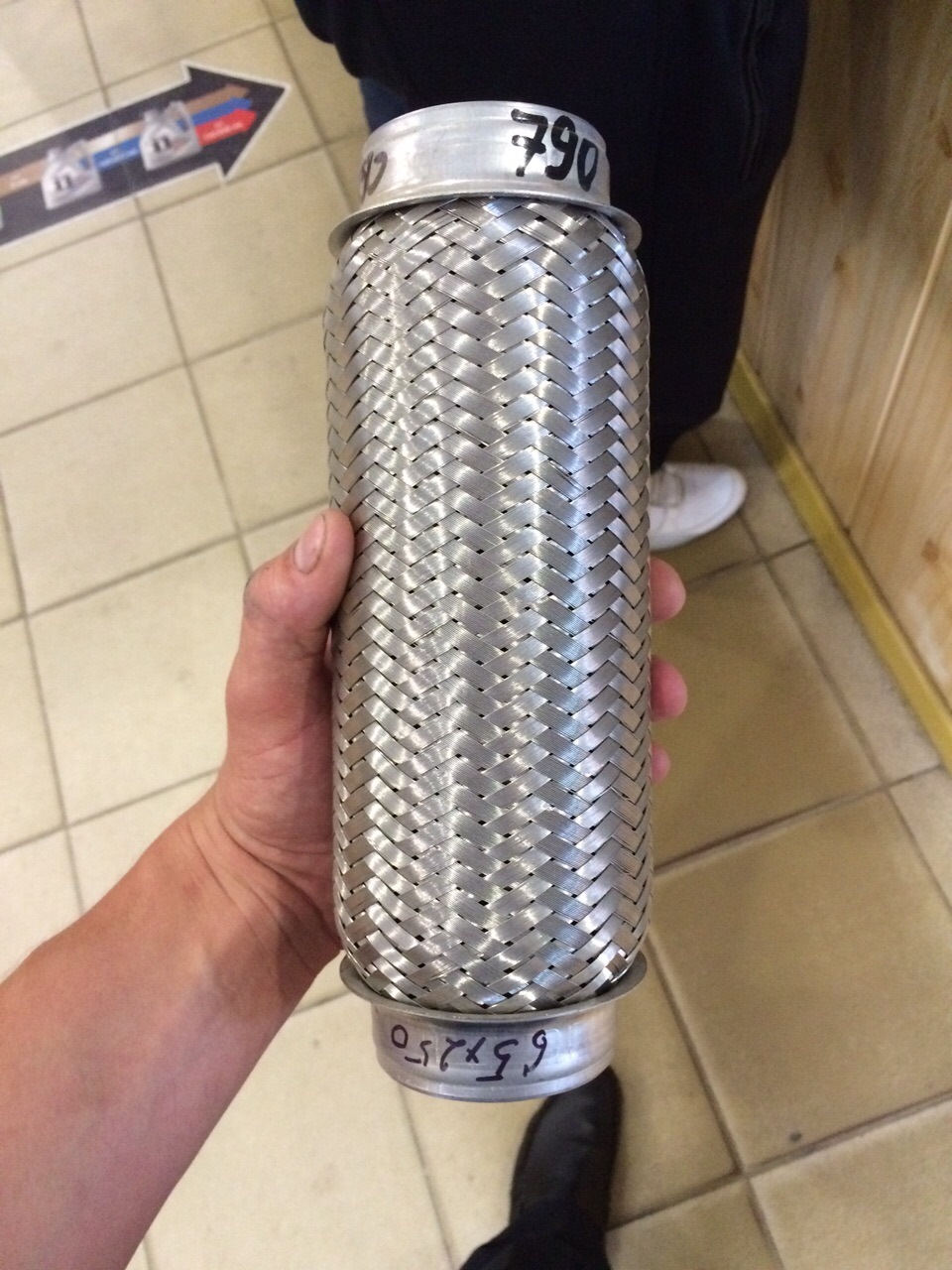 И так когда я начал искать гофру с диаметром около 60 у нас в городе в обычных авто магазинах меня посылали в грузовые магазины или в тракторные так как у них диаметр был максимум d 55 а покупать заводскую что то около 3 килорублей я не хотел принцепиально и вот в одном газелевском магазине я натыкаюсь на гофру 250мм и d65 внутренний диаметр которой был 61мм а моя труба 57 ну подумал что сойдет так как она была мало того единственная так ещё и именно такая как я хотел т.е. 3 слоя:это сетка и 2 ряда пластин.