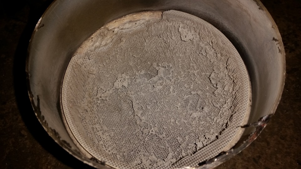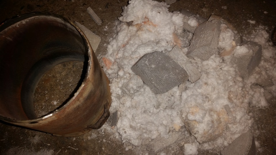видим полный писец так как катализатор на половину сгорел и на 95% был оплавленный и не дышал, поэтому вбиваем его молотком и пока переходим к гофре и вот тут понимаем что купили длинную