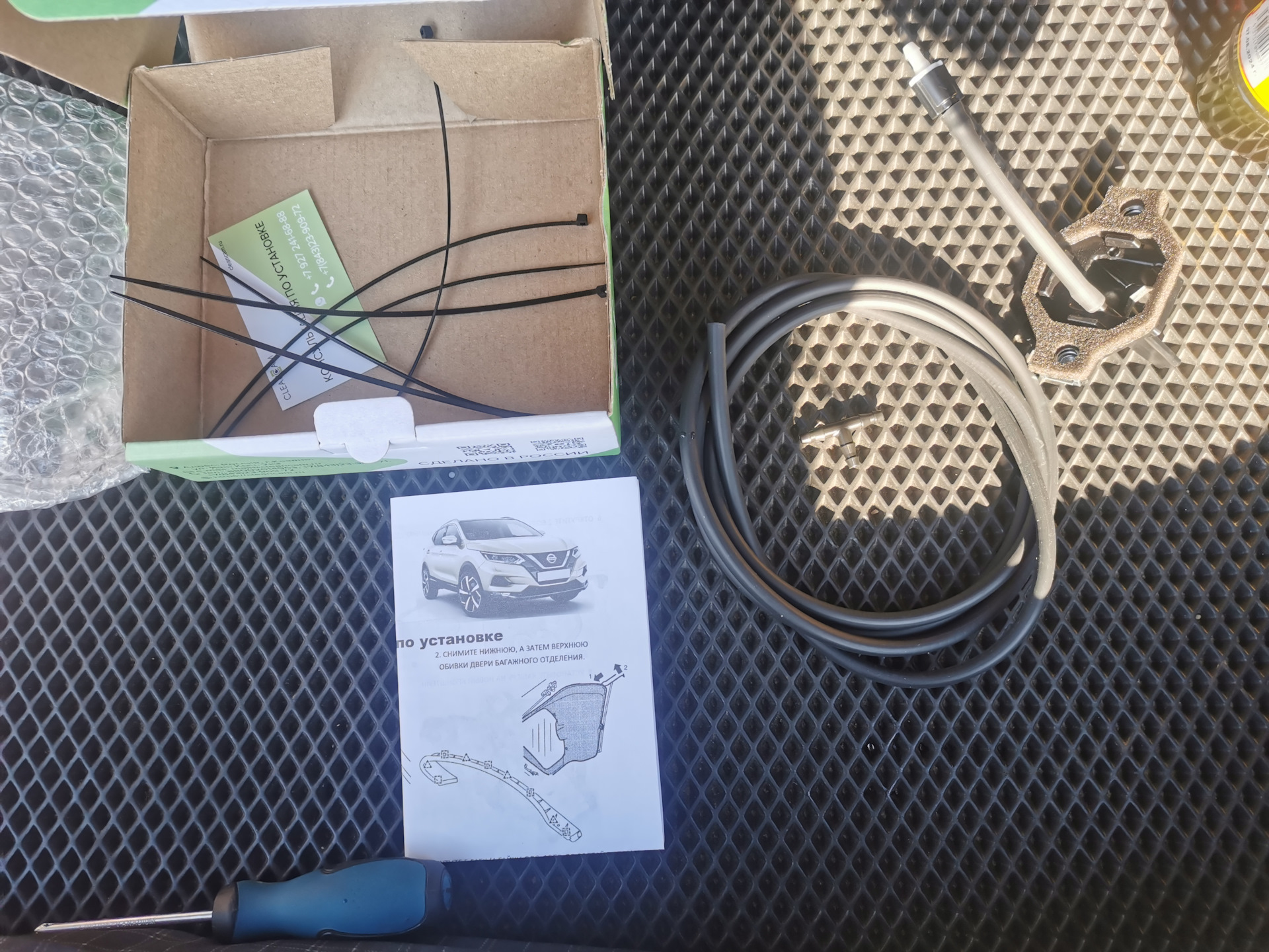 В комплект входит: омыватель с обратным клапаном, тройник, шланг для подключения, стяжки пластиковые и самое главное — подробная инструкции. Еще в магазине озона имеется видео, с инструкцией.