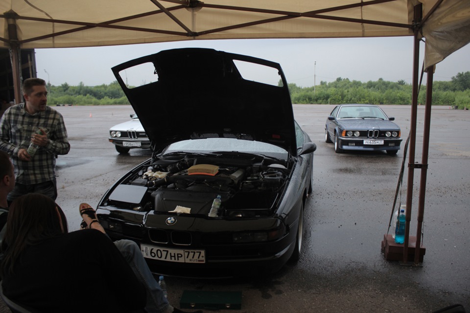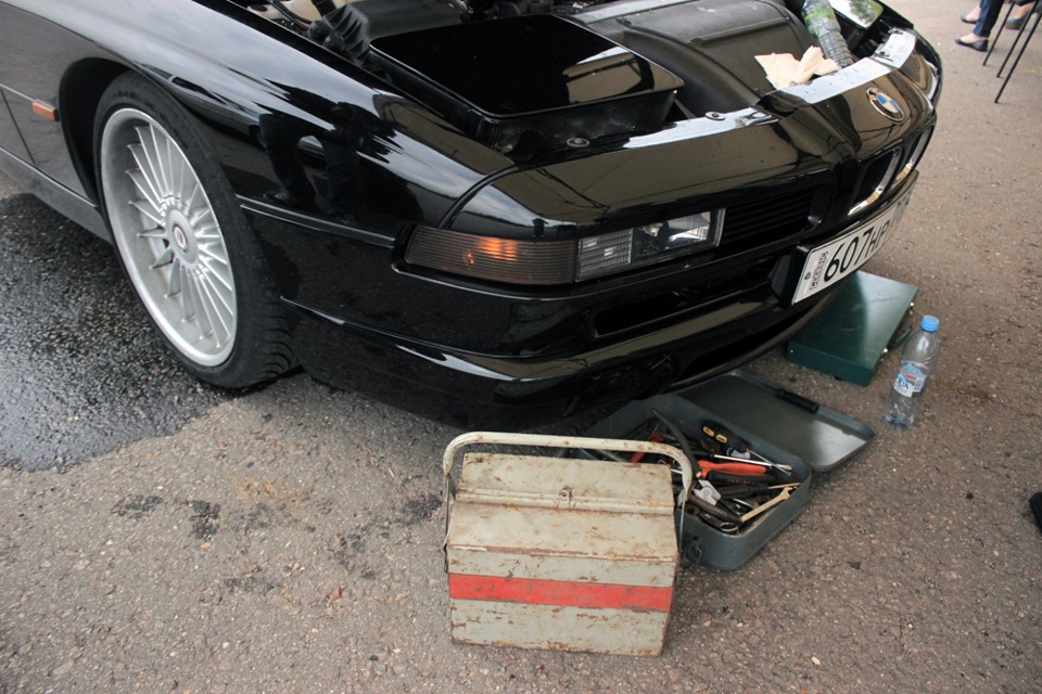 Не обошлось без небольших траблов. После довольно внушительного количества кругов по треку и "весёлых стартов" на 400 метров не выдержал шланг охлаждения на этой е31… А где инструмент? Ну, конечно же, только у меня! Ведь только я вожу с собой аж 3 ящика инструментов, вплоть до ключа на 32!