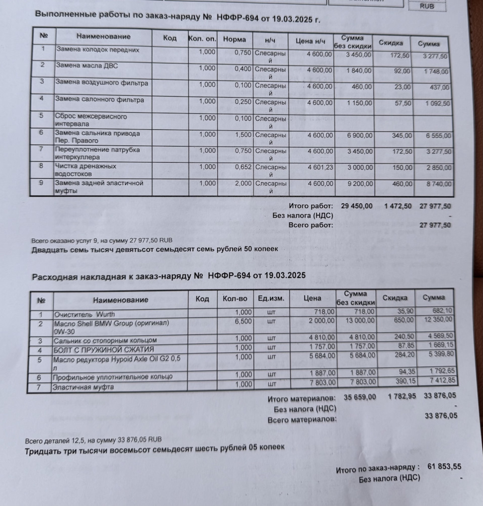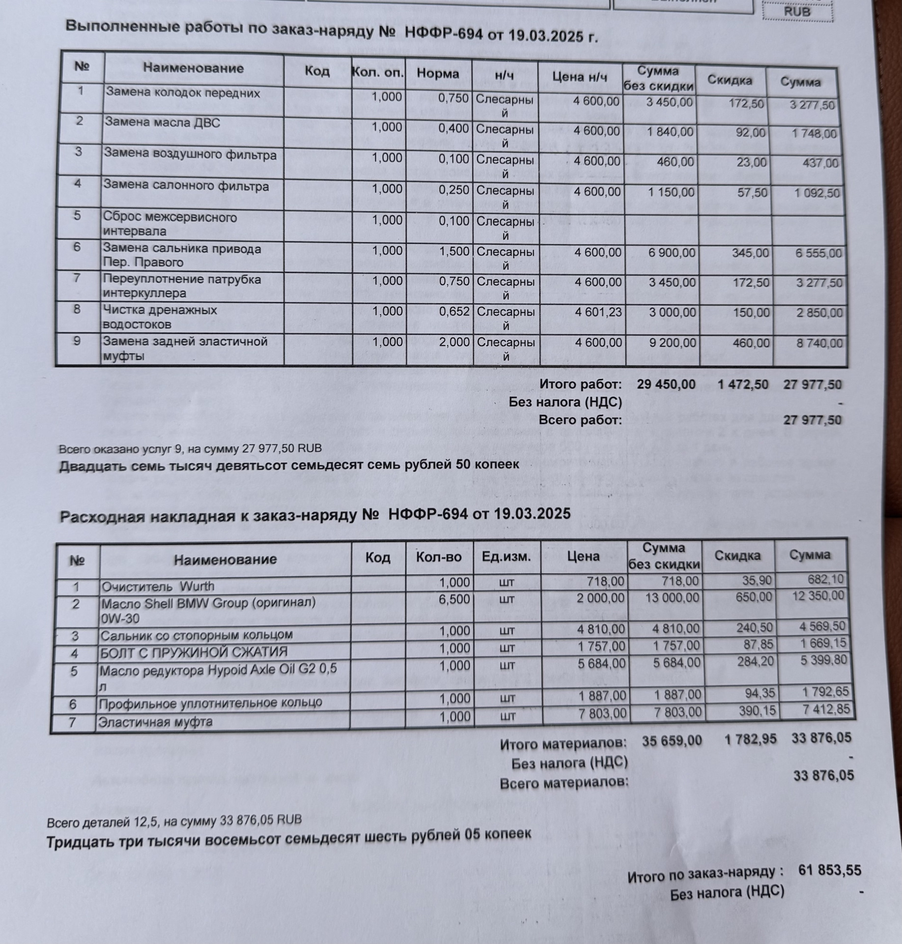 Менять всё это дело поехал в FG sever, где мне попутно приговорили эластичную муфту, сальник правого привода и патрубок интеркулера. Все косяки сразу на месте решил устранить. Заказ-наряд прилагаю.