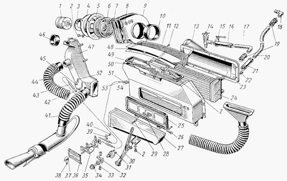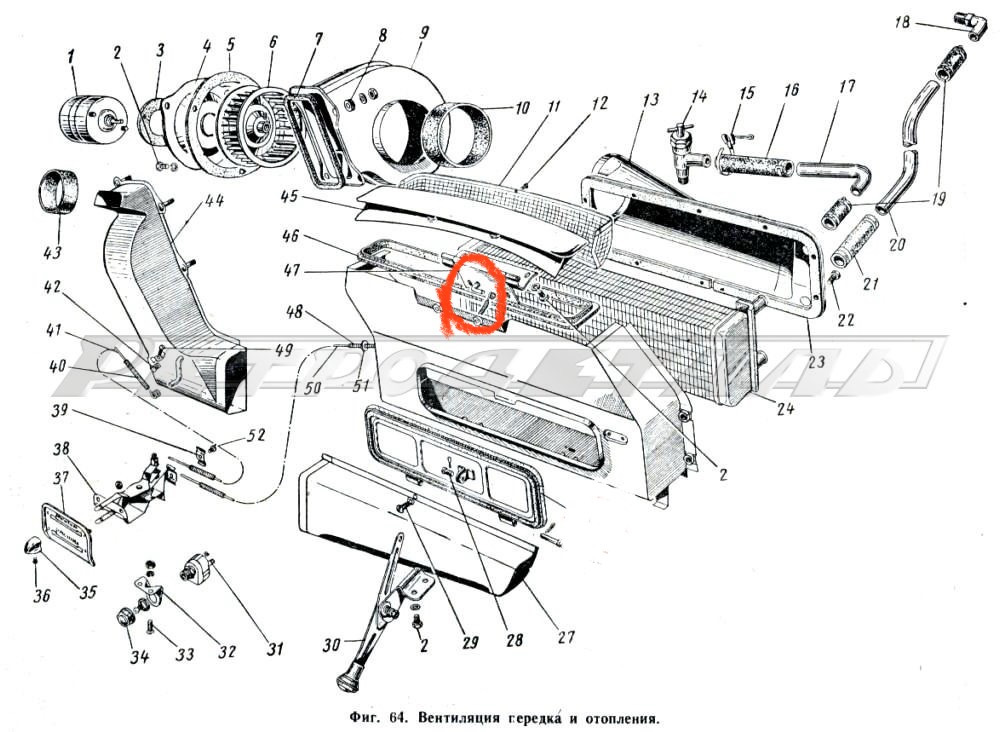 Лючок 48 приводится отдельной рукояткой, которая слева на торпедо в паре с другой рукояткой 35,36 и 51, который проходит через короб к приводу лючка.