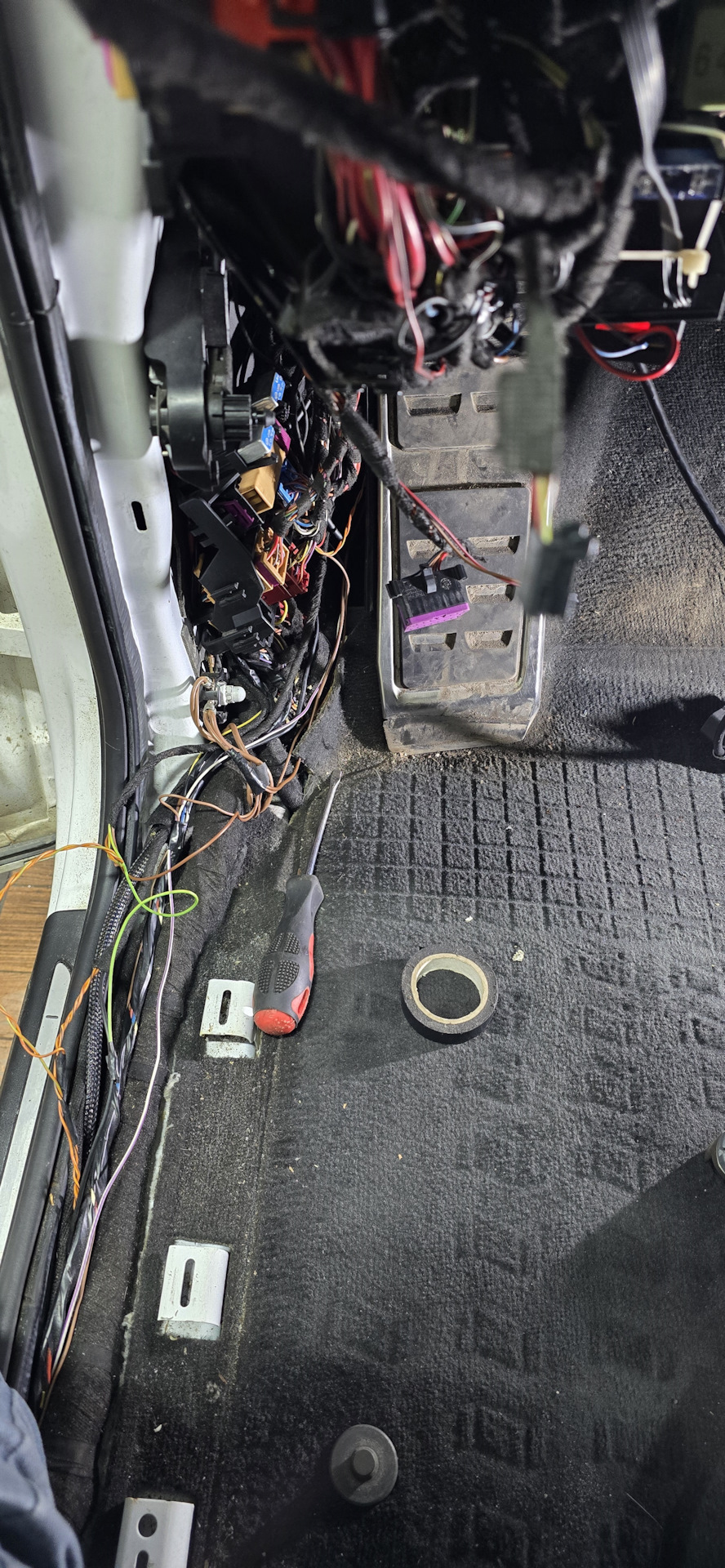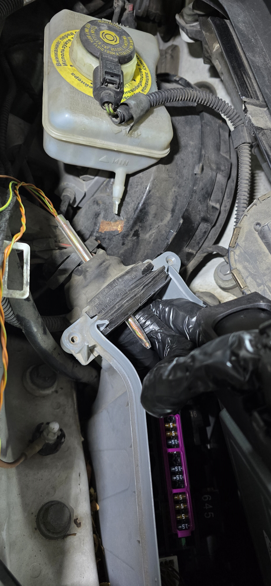 Дальше проводку приложили до блока управления ДВС. Вскрыли короб, протянули провода через уплотнитель с помощью ручки Big)) в нутро коробки, а там рукой подать до салона. Далее положил до ног водителя, там у меня уже идут провода для заднего блока создания шума. К ним и подключился. Питание идёт с колодки черной клеммы 15 — 7,5А предохранитель. Точно не помню, посмотрю схему и дополню попоже. Каншина двигатель — оранжево-черный провод.
