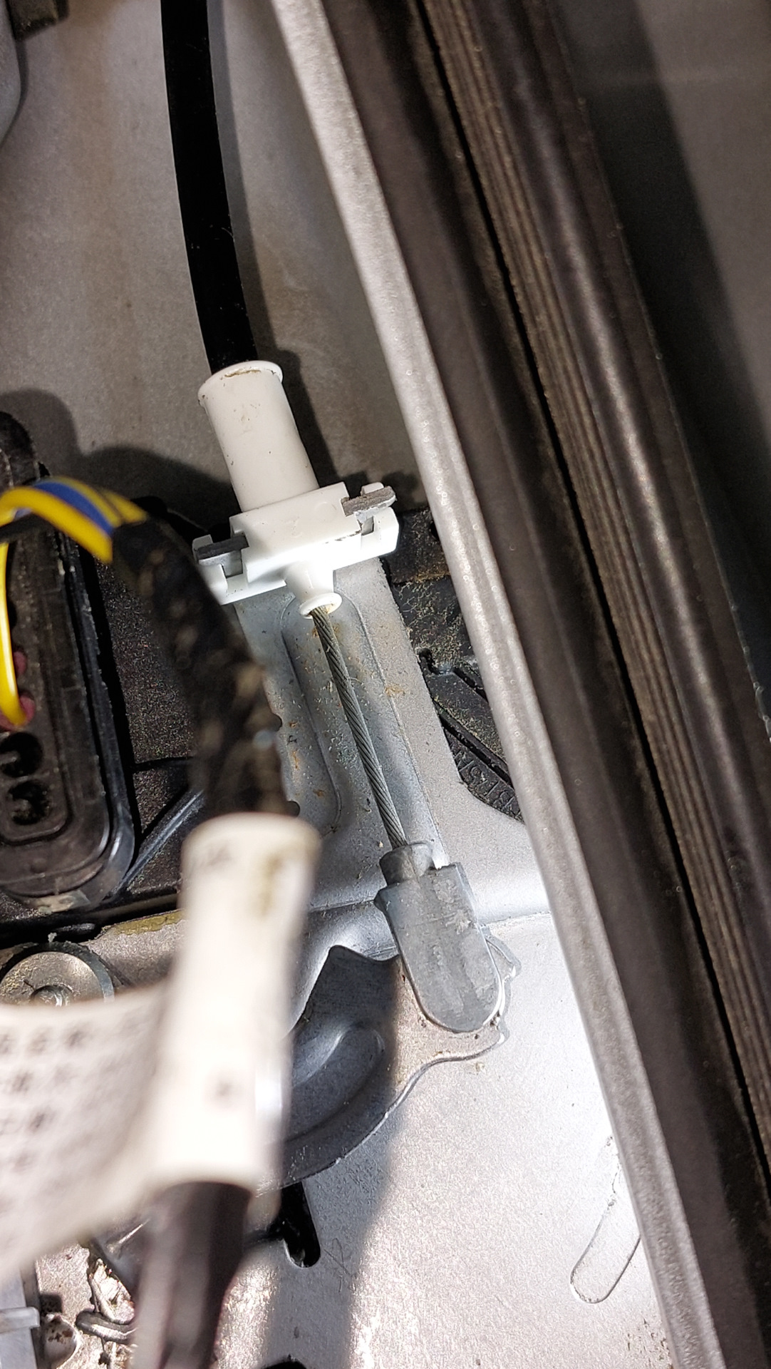 UPD: по итогу получилось вщелкнуть тросик без снятия замка и внешней ручки. В прошлый раз делал "наощупь", но не догадался содрать пленку побольше — в этом случае можно голову просунуть чуть глубже внутрь двери и, таким образом, механизм становится виден и можно, хоть и неудобно и с большим напрягом, но правильно сочленить элементы. Есть нюансик — тросик выскочил не просто так, а по причине того, что он вщелкивается в тягу прям свободно, т.е. почти без усилий, соответственно выщелкнуть также не составляет труда. Либо с завода отверстие под тросик чуть больше, чем нужно, либо со временем так случилось. Во всяком случае, пробовал дергать ручку с разным усилием после установки — ничего не слетает. Вот зимой, если тяга сильно примерзнет, может слететь, но теперь механизм обильно смазан силиконом и, будем надеяться, это поможет.
