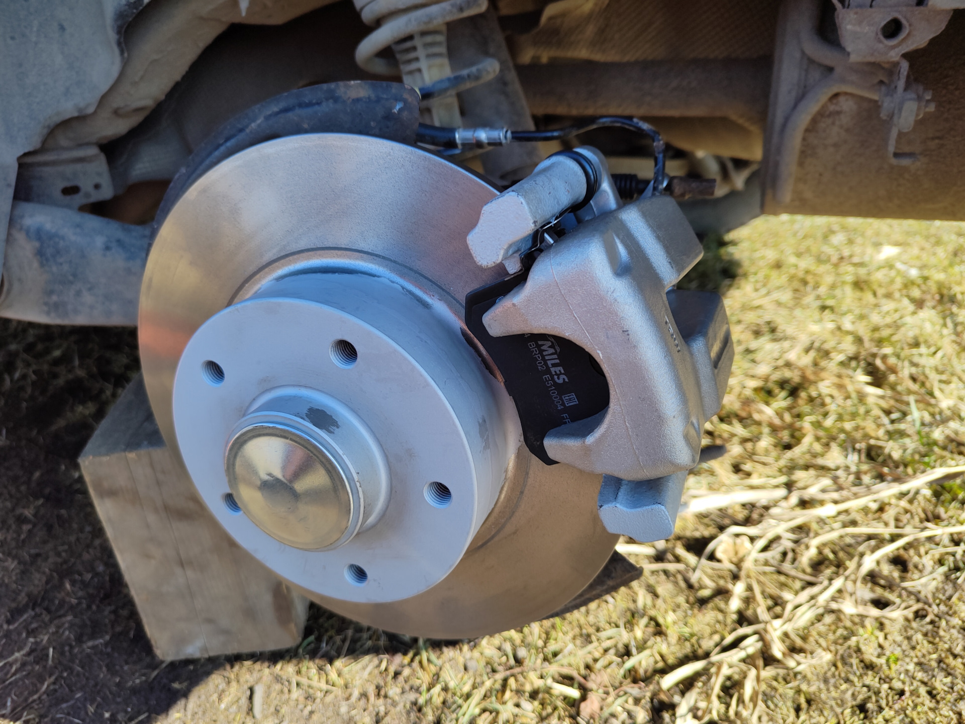 Все разобрал, старые колодки и диски були ещё в нормальном состоянии, можно было ещё покатать, но решил заменить все и сразу. Возникли трудности с откручиванием скобы суппорта, винты не хотели откручиваться, пришлось немного погреть газовой горелкой, постучать молотком и все о крутилось. Скобы суппорта немного зачистил, промыл очистителем и покрасил краской (если отвалится то и хрен с ней). Диски тормозные тоже обезжирил и покрасил термостойкой краской. Будет держаться или нет посмотрим. Собирается все легко и быстро в обратной последовательности, затянул ступичную гайку, забил колпачки. Прикрутил скобу, далее колодки и суппорт. Прокачал тормоза и поехал обкатывать. Ручник работает отлично, тормоза пока придираются, не понятно хорошо тормозят или нет. В комплекте с колодками положили 4 самых дешёвых болта, пластинок не было, пожалели видимо. Болты поставил из комплекта суппорта.