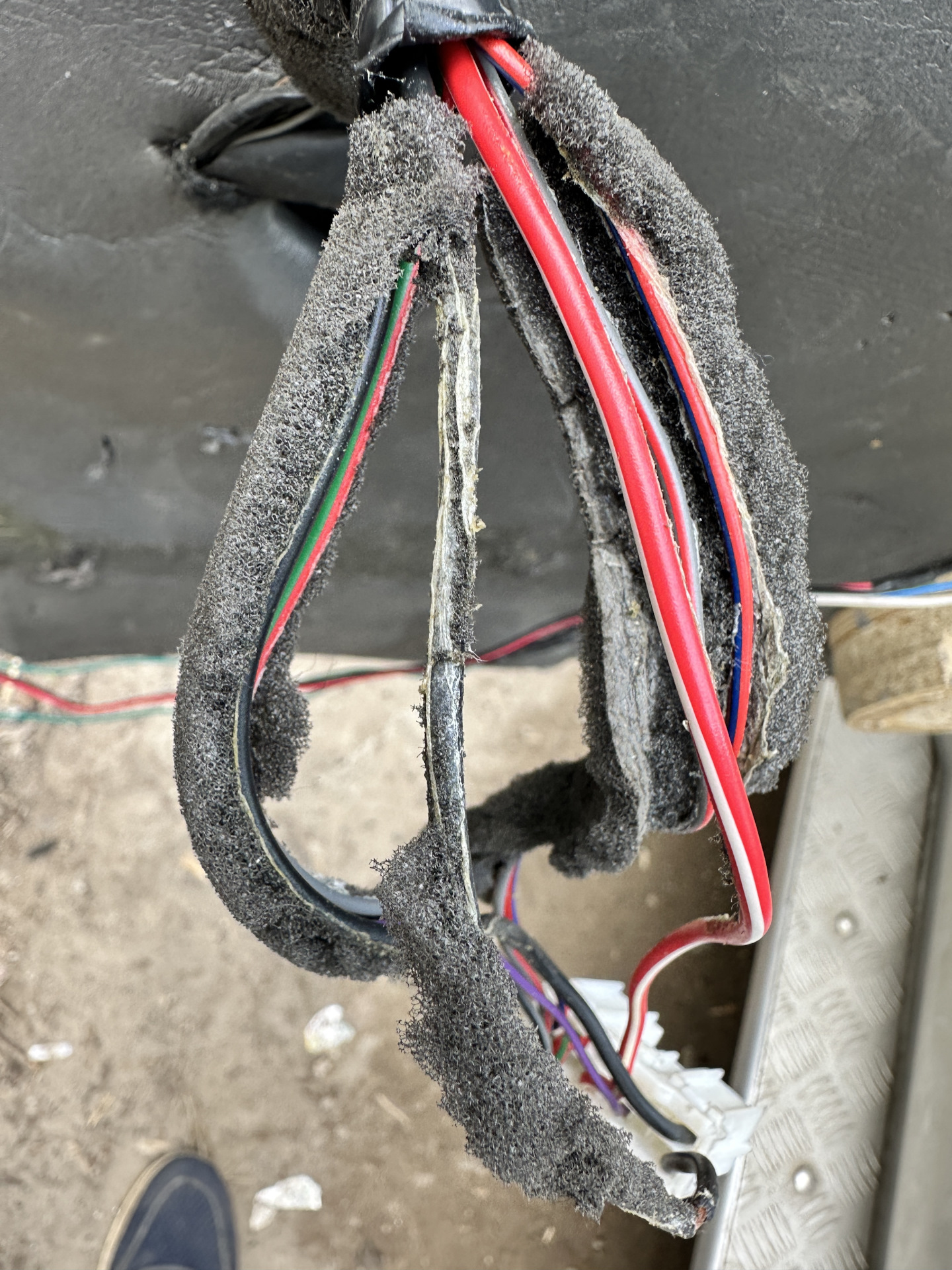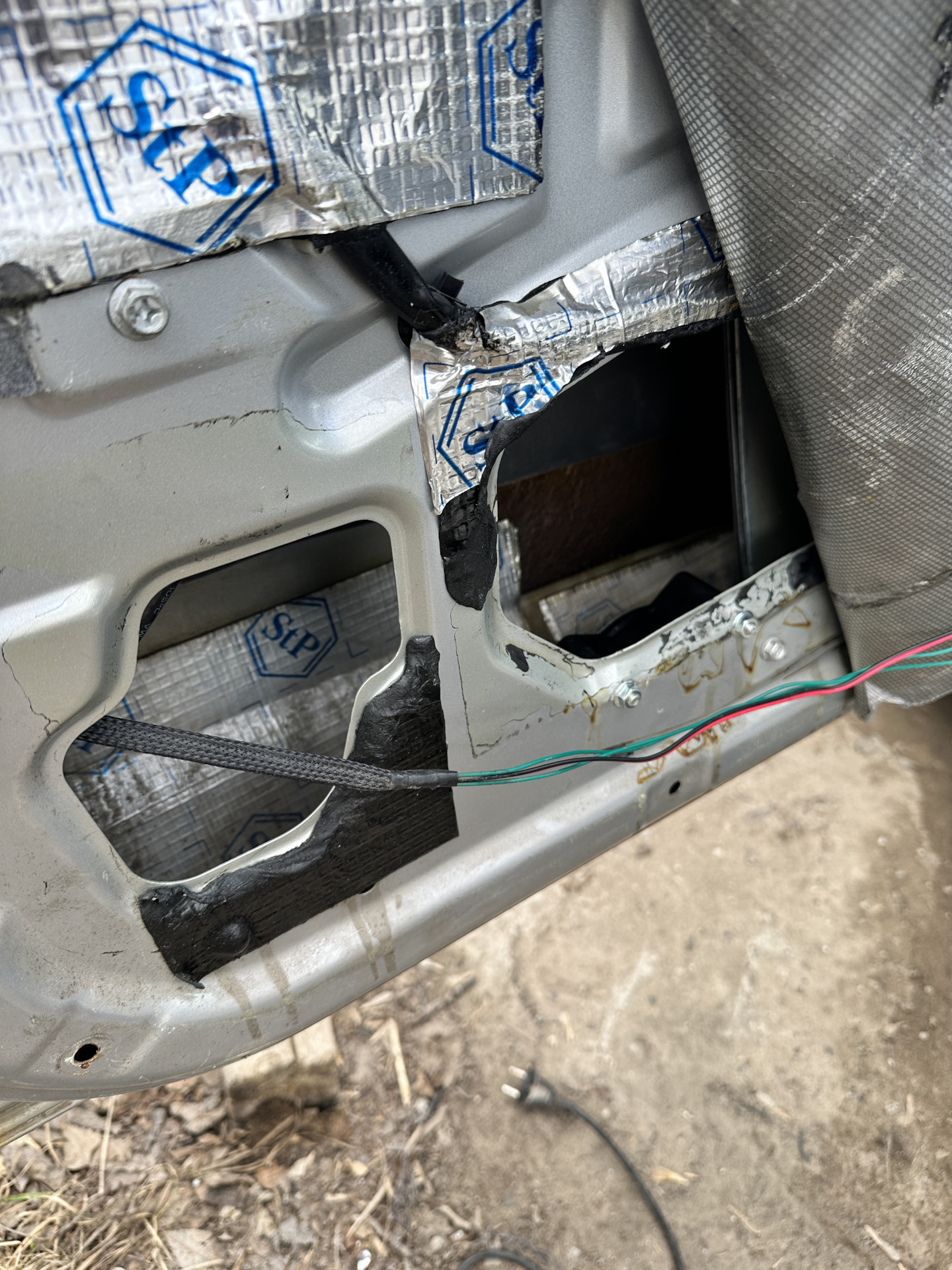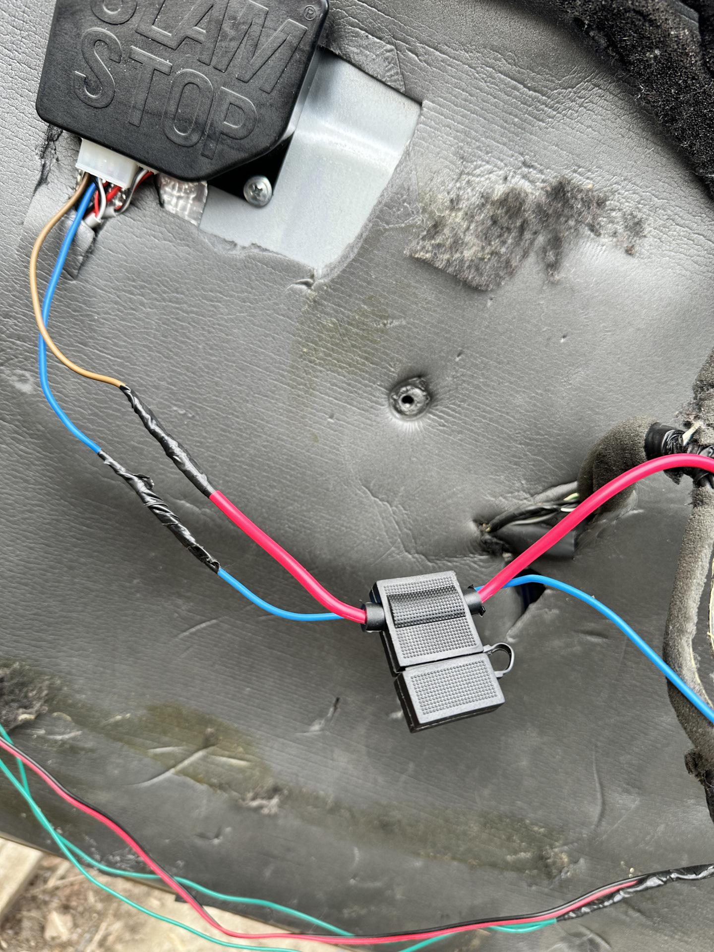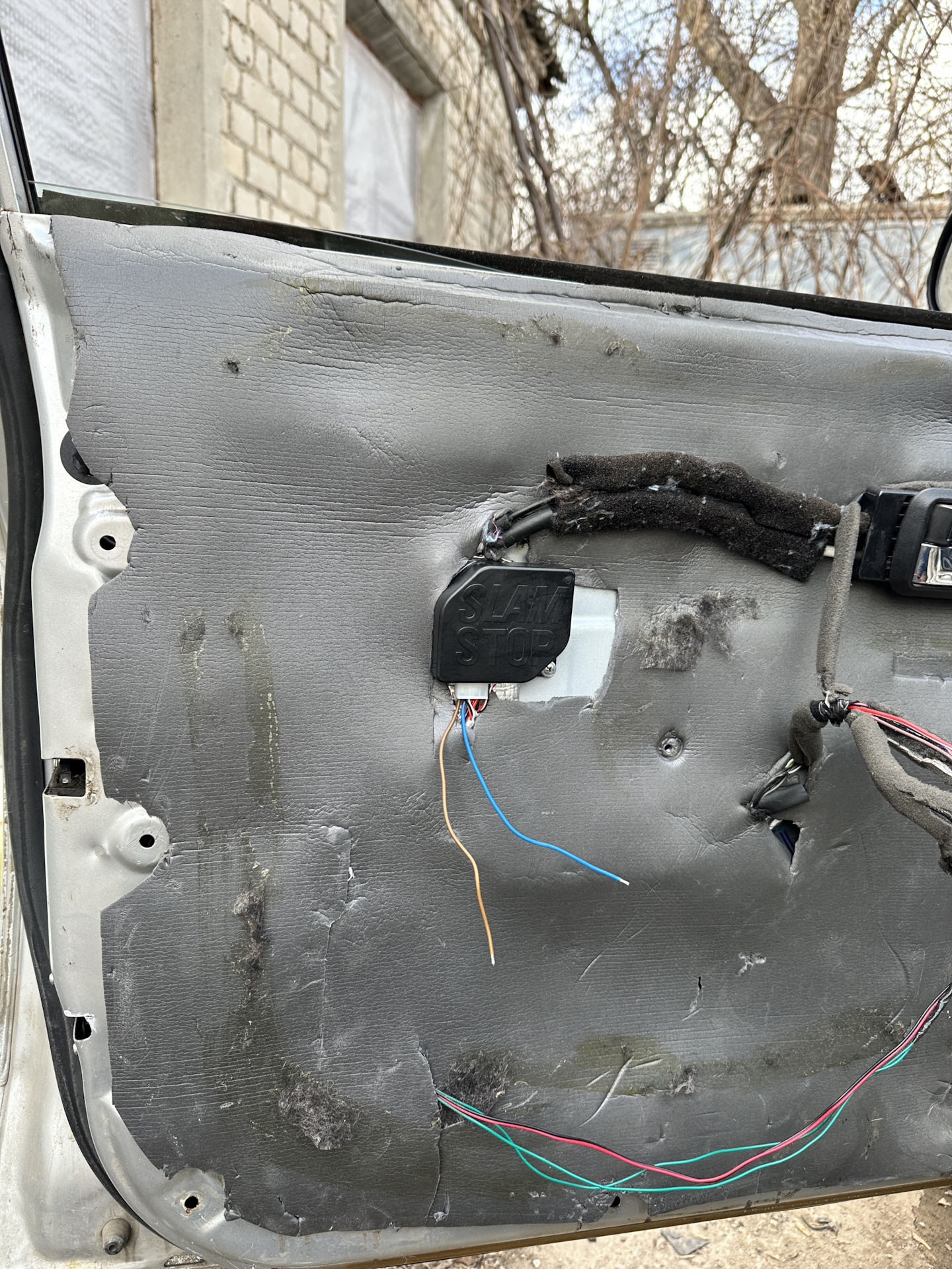 которые взял тут же в двери в проводке на кнопку. Это два самых толстых провода, чёрный масса, а красный с белой полосой это плюс. Всё на этом установка завершена.