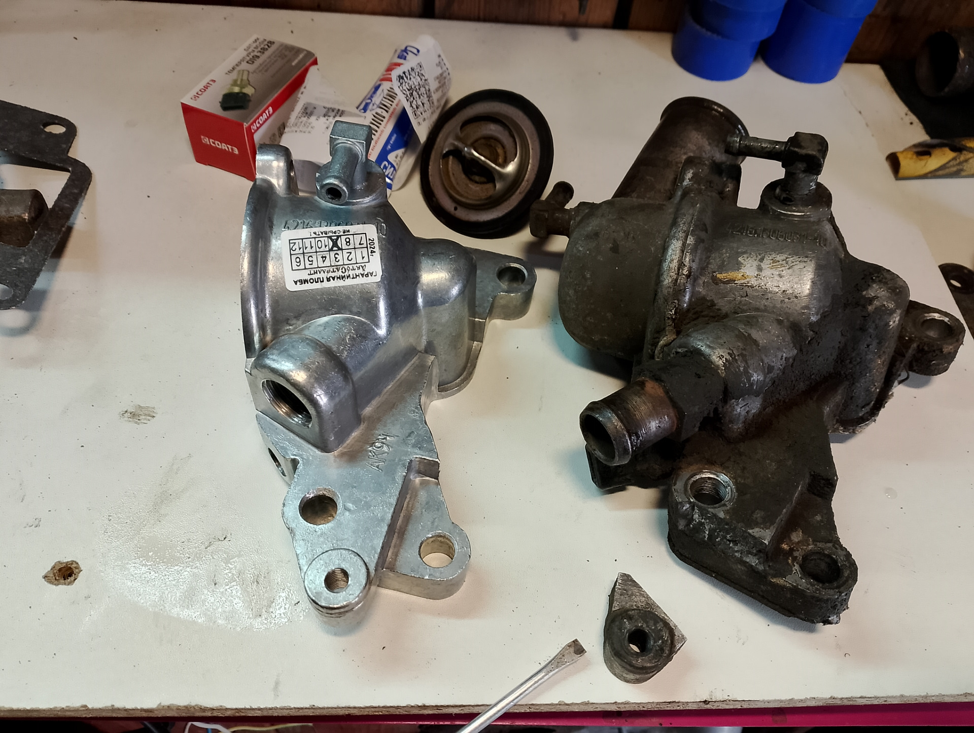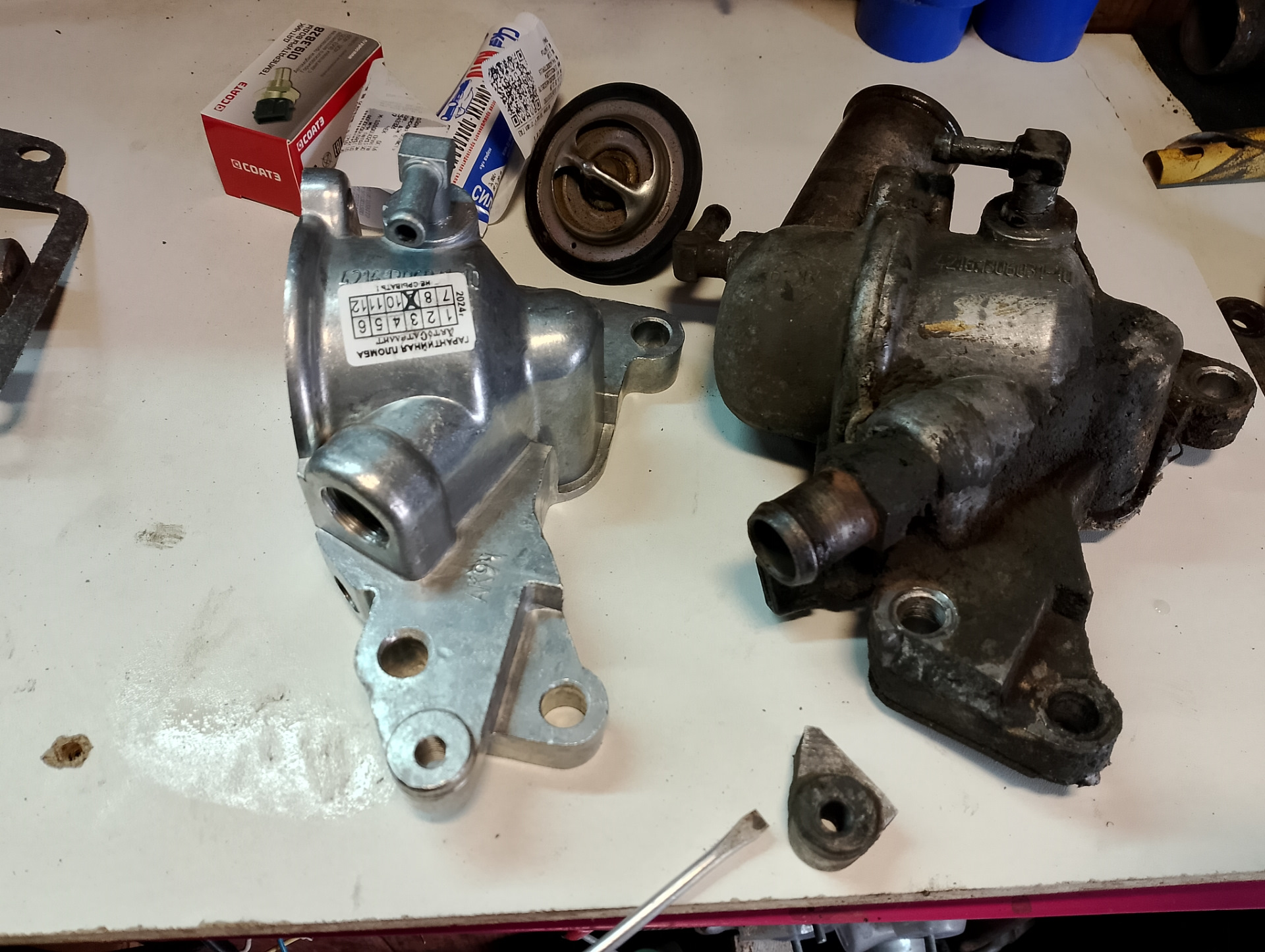 Обнаружил сегодня сломанное ухо крепления натяжной скобы генератора, на корпусе термостата . А полез поменять кронштейн генератора (он лопнул), который крепится к блоку .