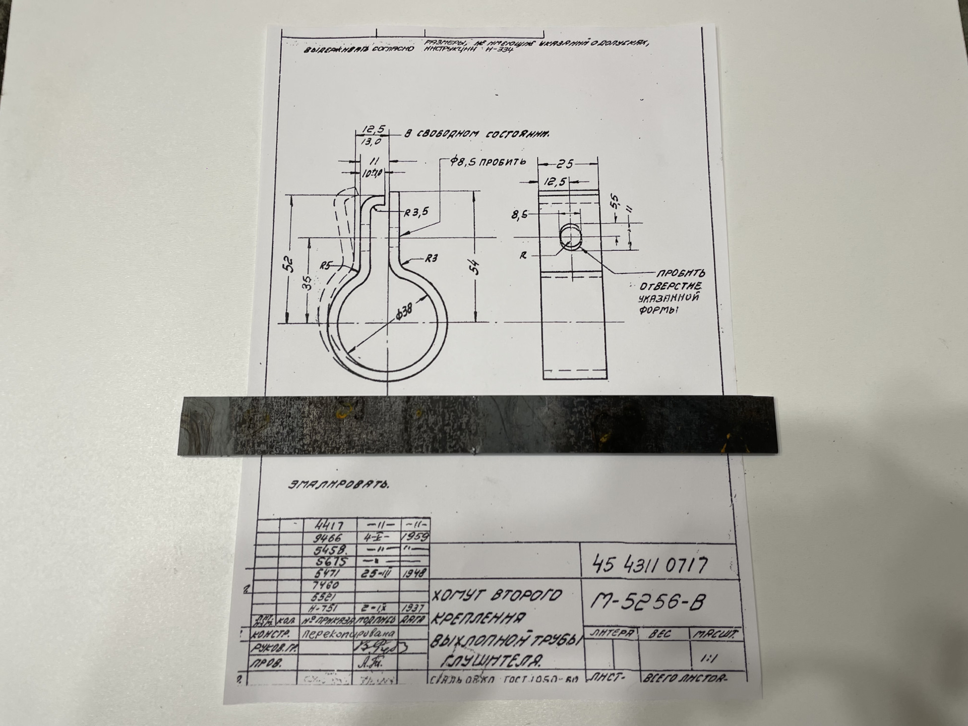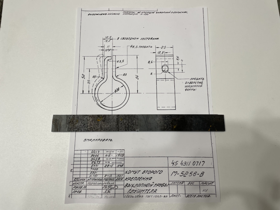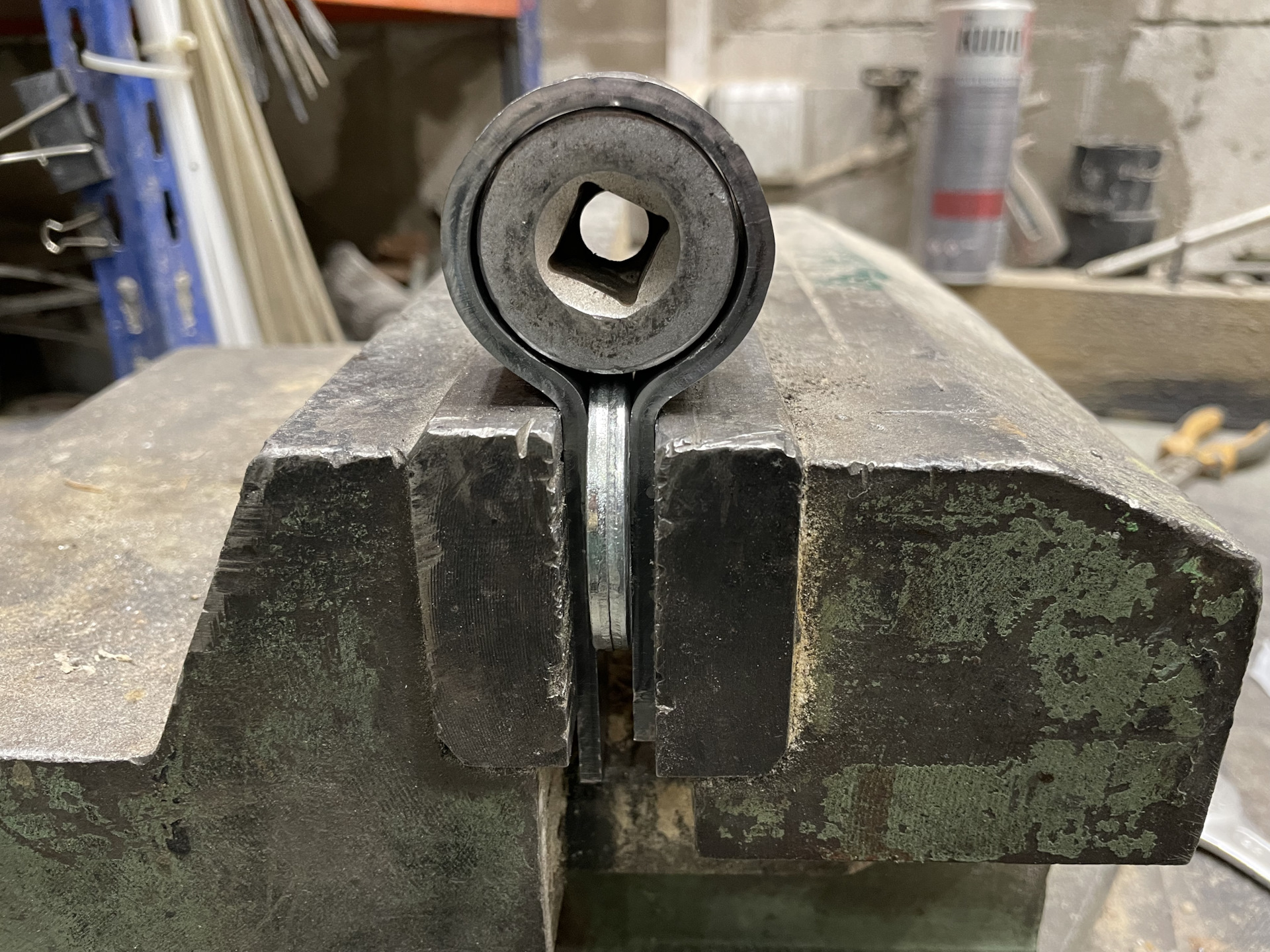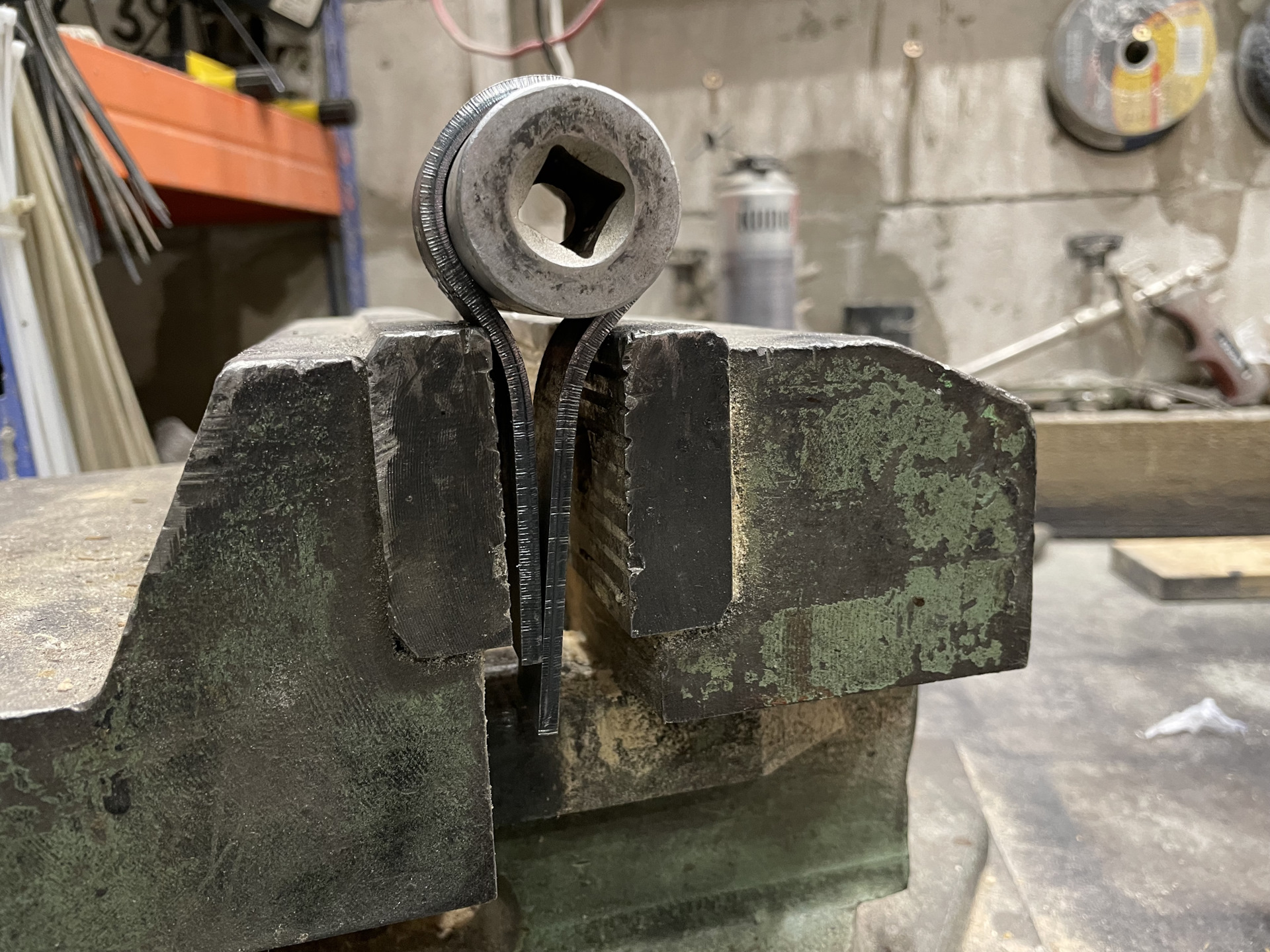 Пришлось повозиться с углами между окружностью и прямыми участками. Тиски не продавливают. Молоток через второй молоток делает угол слишком плавным. Зубило рубит хомут. Обычные сырые железяки сами гнутся.