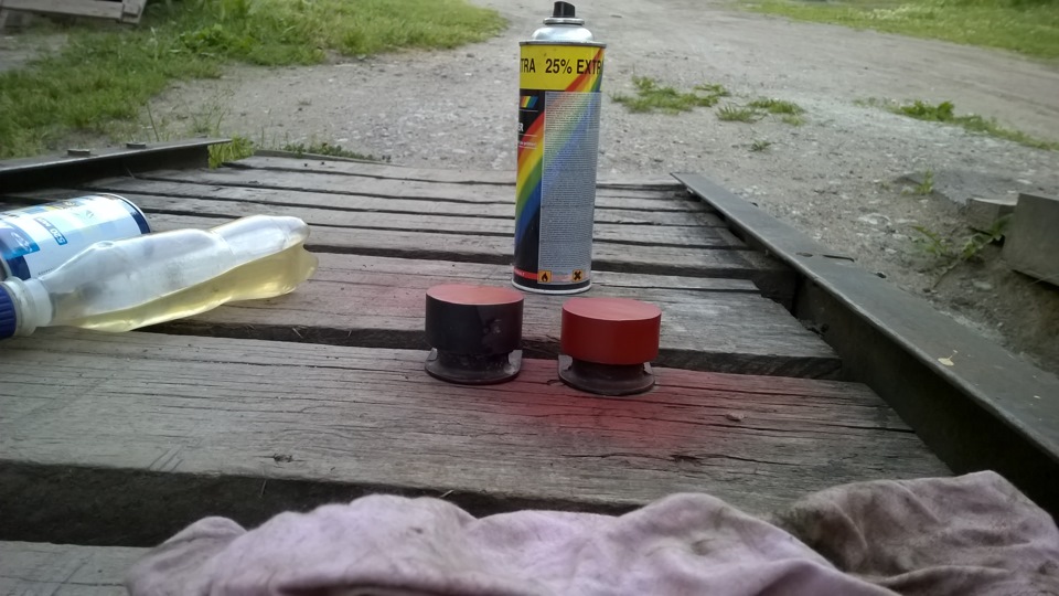Как и обещал, запилю отчетик по установке на заднюю балку, но до этого расскажу про исправление своего косяка в пятой части. На прошлых выходных настолько загонялся, что инженерная мысль вообще оставила мою голову в покое, обидно, расплачиваемся ногами)) ну так вот, снял я пиленые демпики и ничего удивительного не увидел, срез металла покрылся ржавчиной, логично, все логично. Ну что ж, взял наждачку, ацетон и немного краски от жигуля, все тщательно зачистил и обезжирил. Прогрунтовал поверхность для начала и положил первый слой.