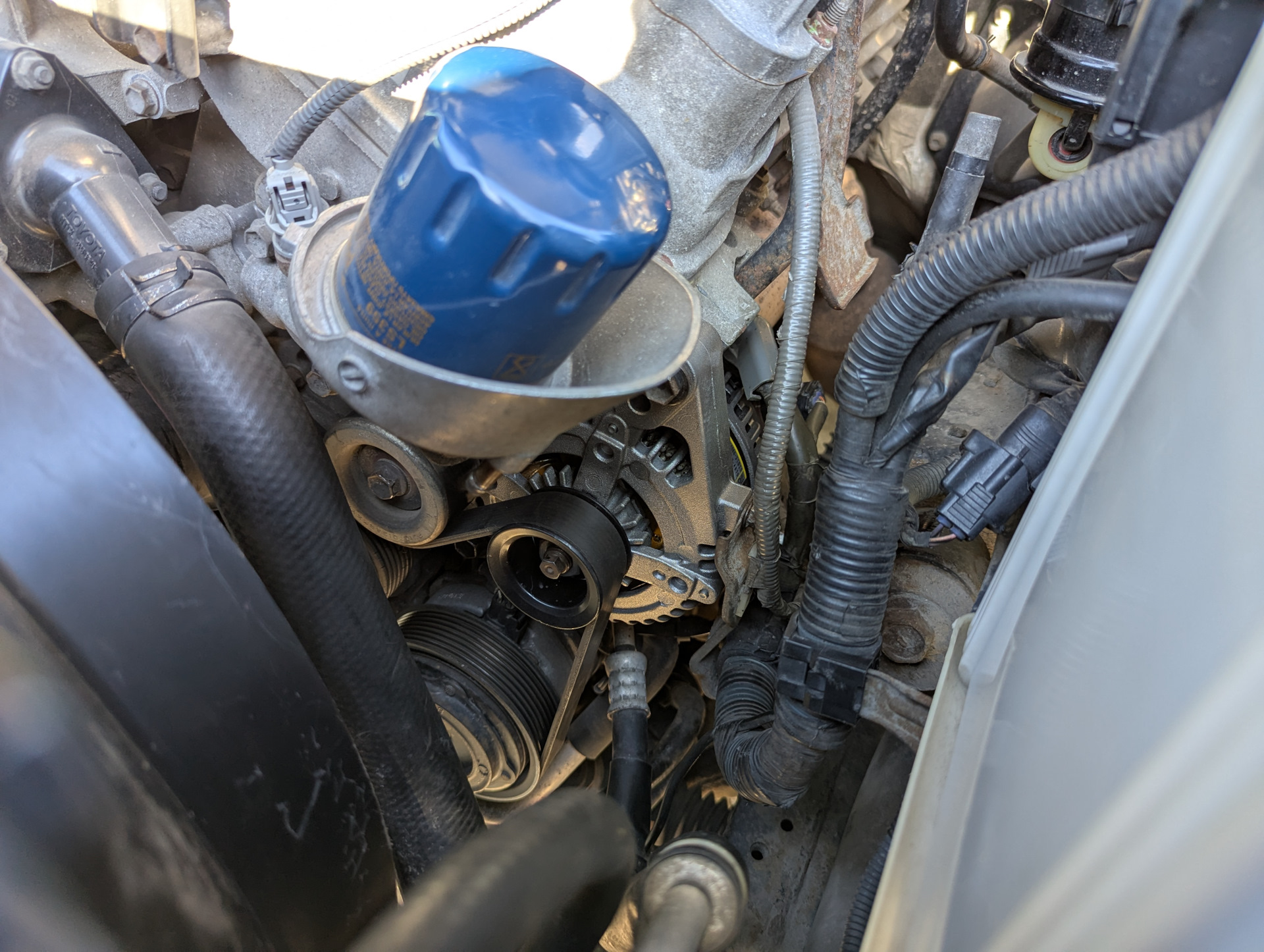 Не повредите трубку радиатора кондиционера и кожух вентилятора. Чтобы исключить механические повреждения вероятные места контакта можно заклеить несколькими слоями малярного скотча, по которому корпус генератора будет хорошо скользить. Также это будет полезно при установке нового генератора.
