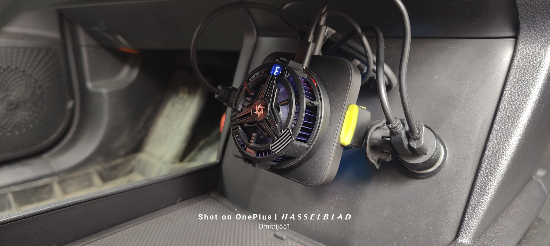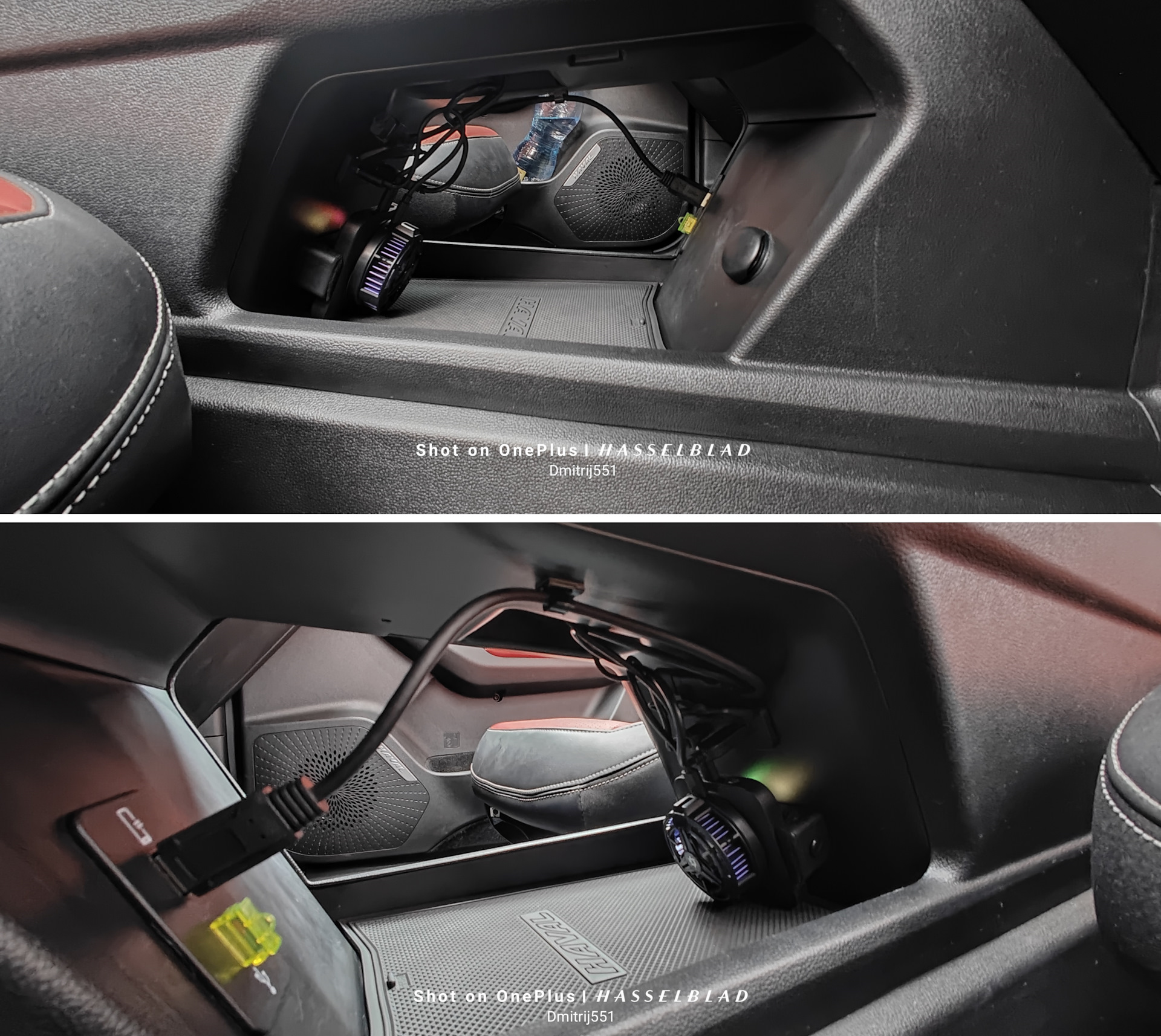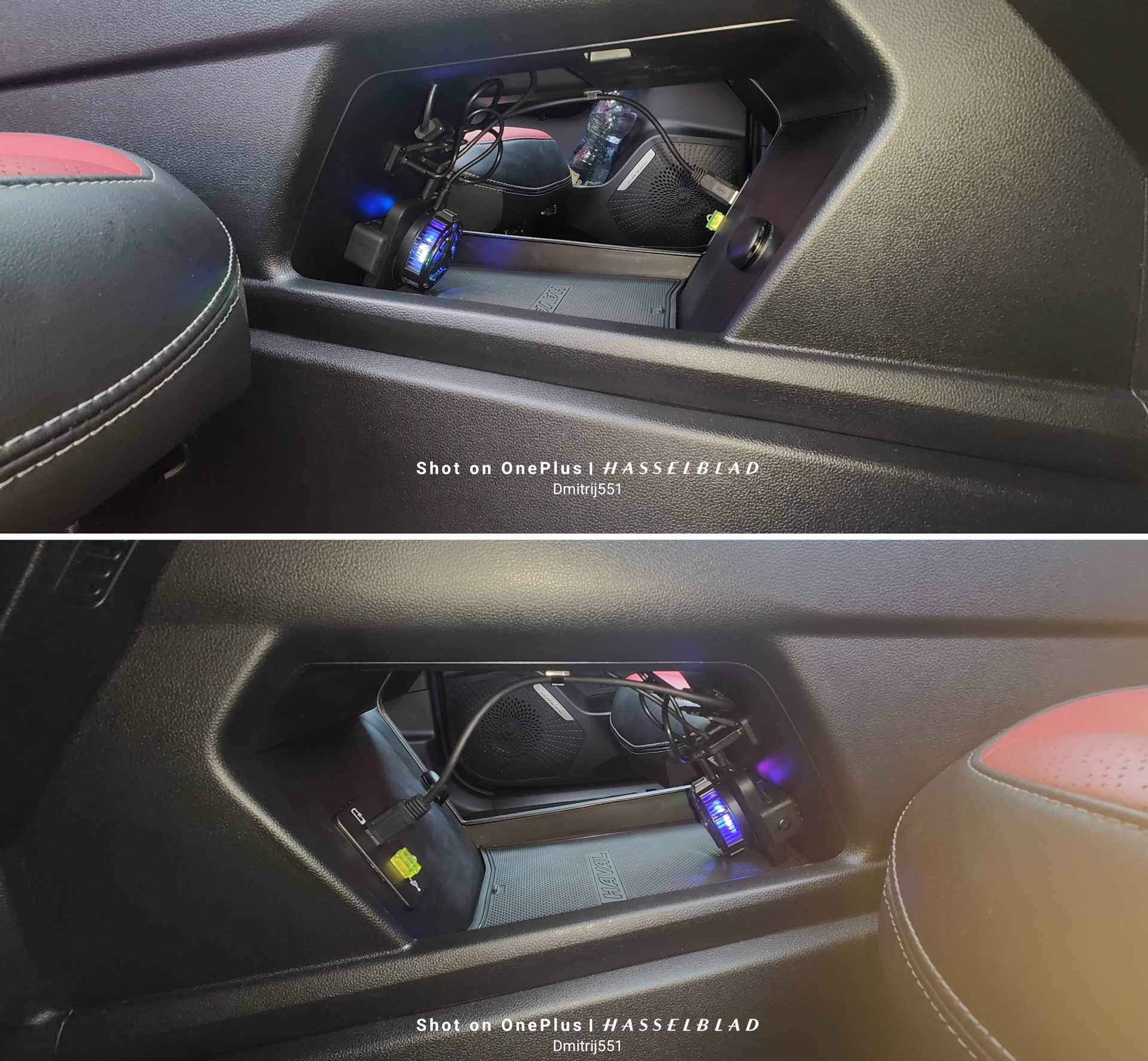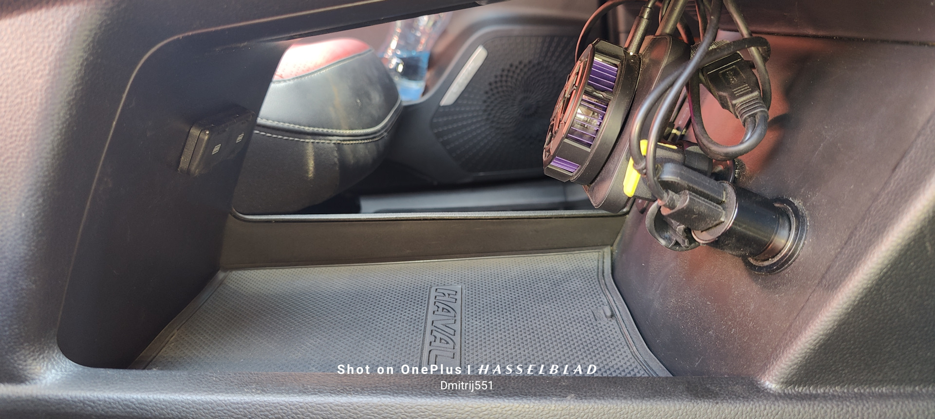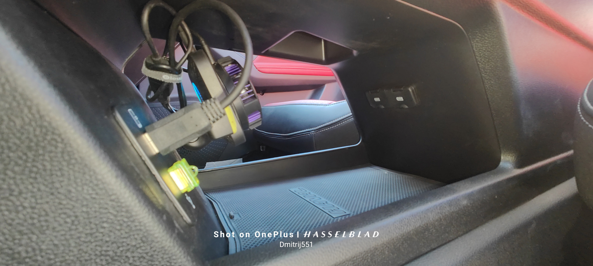 Получилось вот так, такая компановка мне нравится большеПолучается не зря устанавливал розетку, в темноте подсветка кулера интересно подсвечивает пространство внутри)))Так это выглядит при входе в машину, свободного места в консоли стало больше