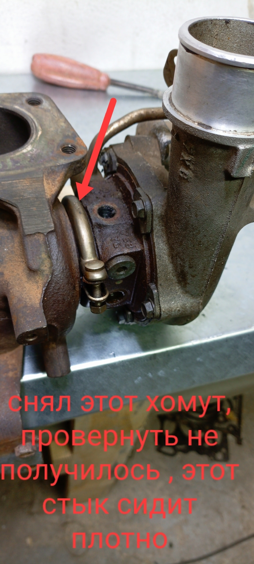 Был вопрос, криво поставили выпуск холодной улитки, патрубок встаёт с перекосом. Я взял турбину, все еще лежит в гараже, и показал, как это легко исправить. Как поставить на место холодную часть. Горячая крепится жестко, она не поворачиватся, так написано на моём фото. О горячей части даже вопросов не было,