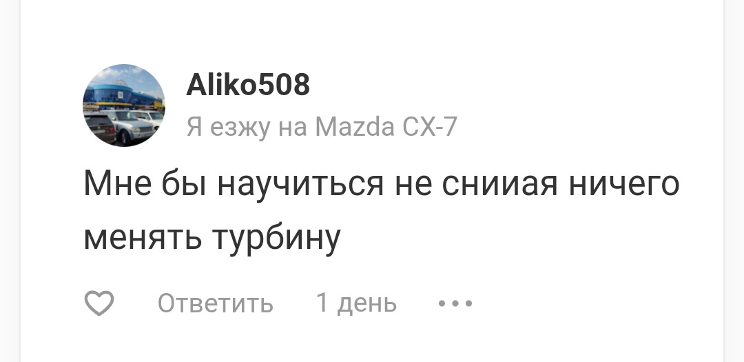 Мне в Ниж Новгороде срок ремонта 2 недели озвучивали))) 3 дня снять, 3 дня поставить, 7 дней на ревизию и ремонт. В итоге поехал в Мск в Рпм, за 3 часа турбину поменяли))) С мастерами конечно по сх-7 беда…
