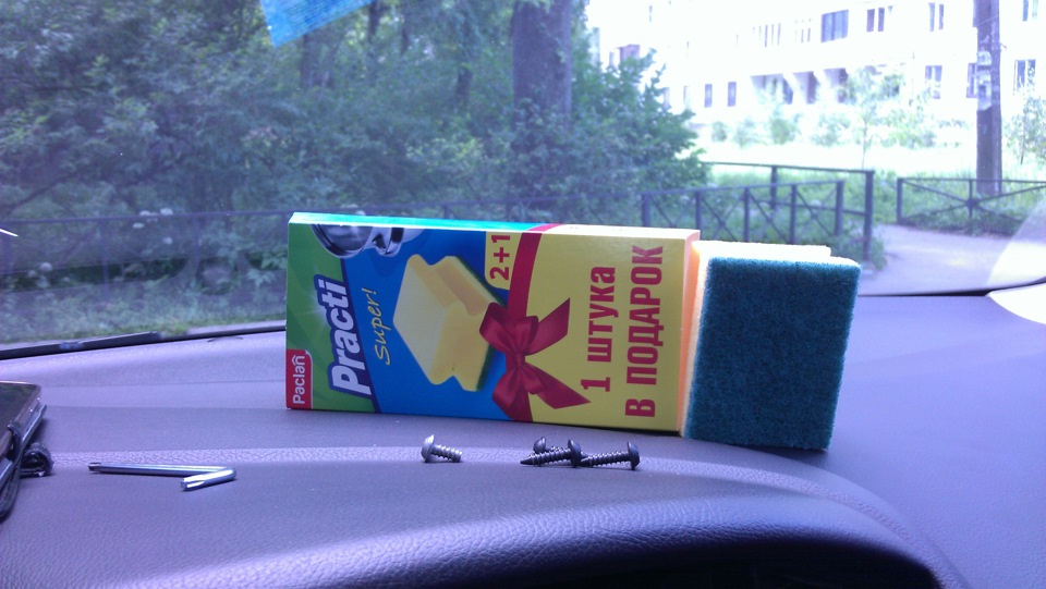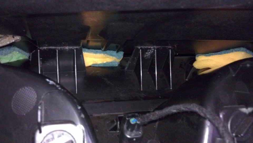 Материалы для операции были закуплены в хозяйственном отделе нашего гастронома и обошлись нам неприлично дешево ( 100 руб. ) . Дальше все очень просто, вытаскиваем свои музыкальные шкатулки и через освободившееся пространство начинаем погружение в глубины сознания ( извиняюсь просто в глубины ) . Губки для мытья посуды складываем абразивной частью вперед и подсовываем их при помощи какой нибудь длинной и тонкой штуковины ( мы использовали пилку по металлу ) под жесткую часть торпедо по всей ее длине !