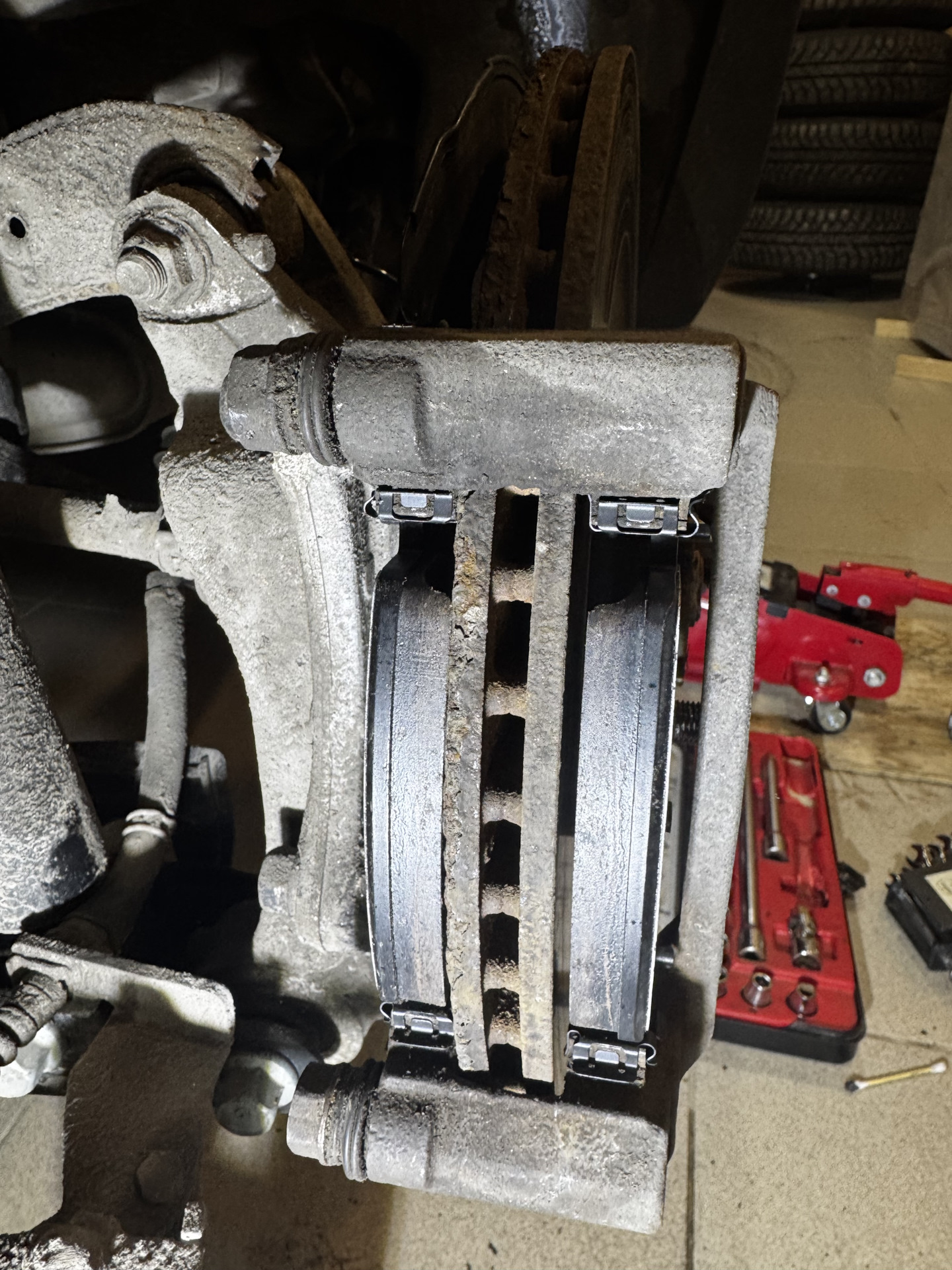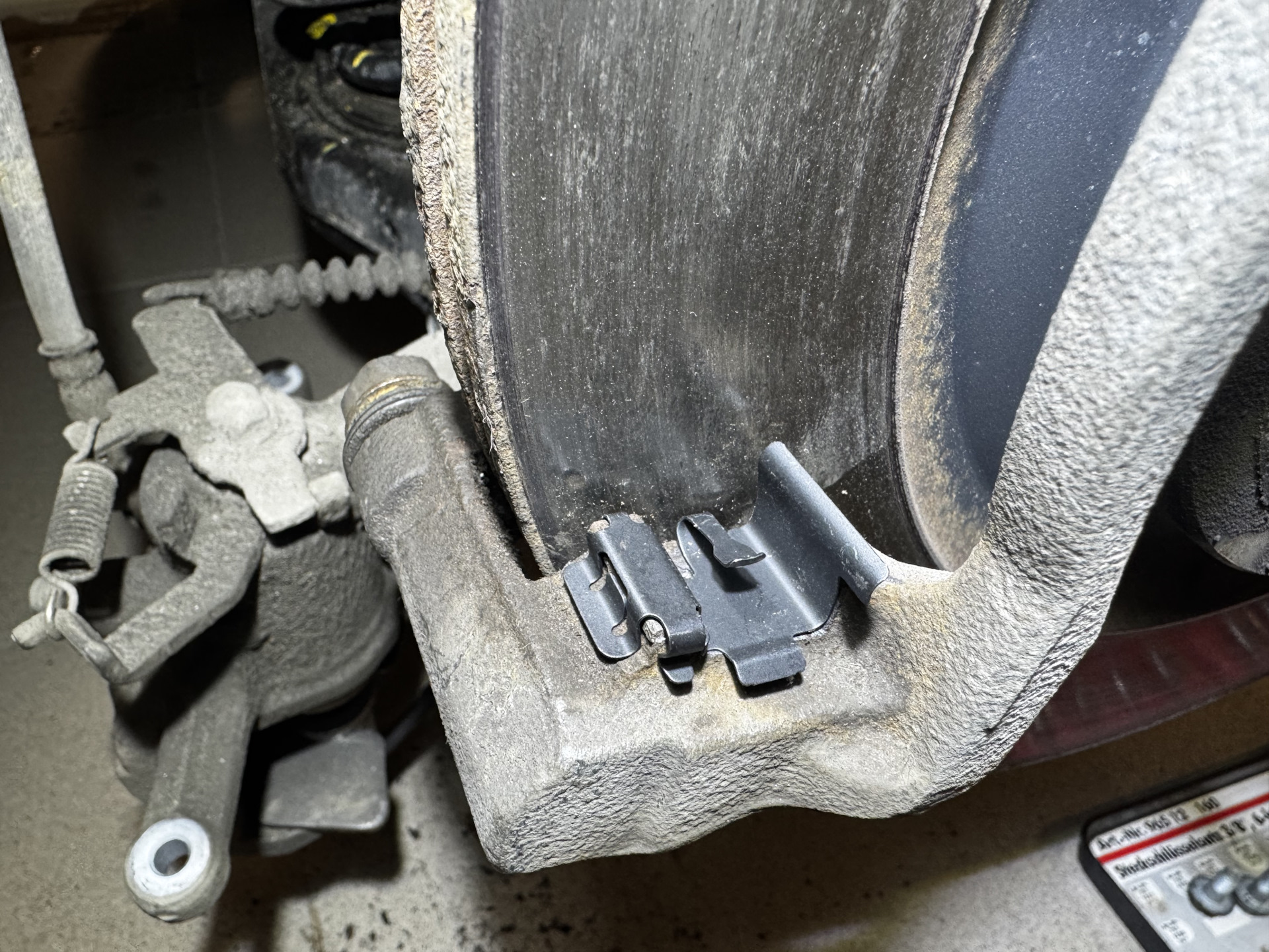Колодки установлены. Видно как пластины немного не дают прижиматься к диску, за счёт небольшого язычка в самой пластине. При торможении колодки будут прижиматься к диску, а при отпускании педали колодка немного будет отходить от диска. Продумано 👍