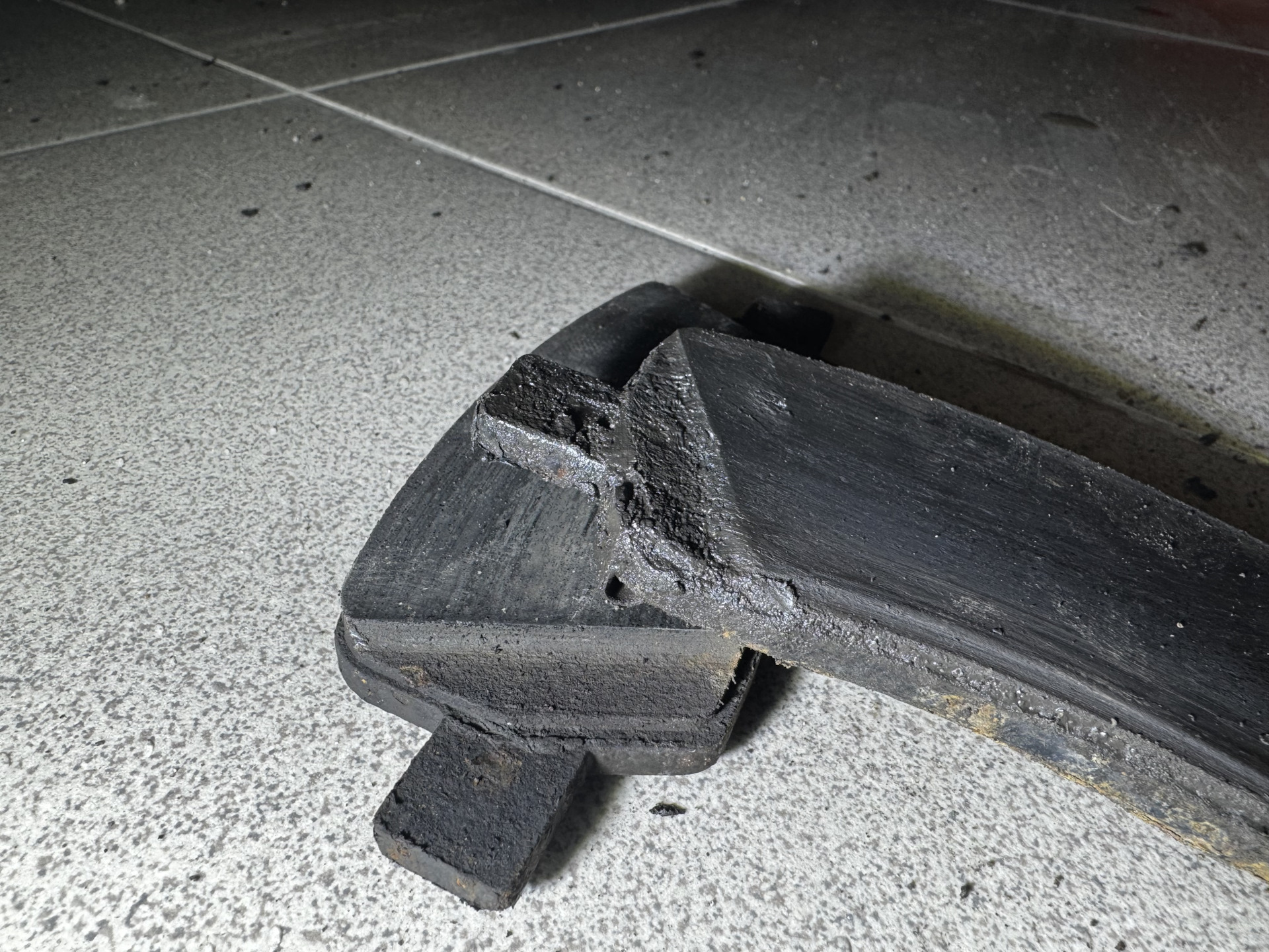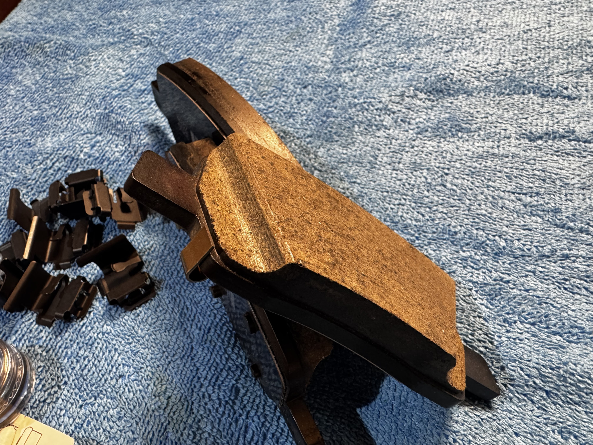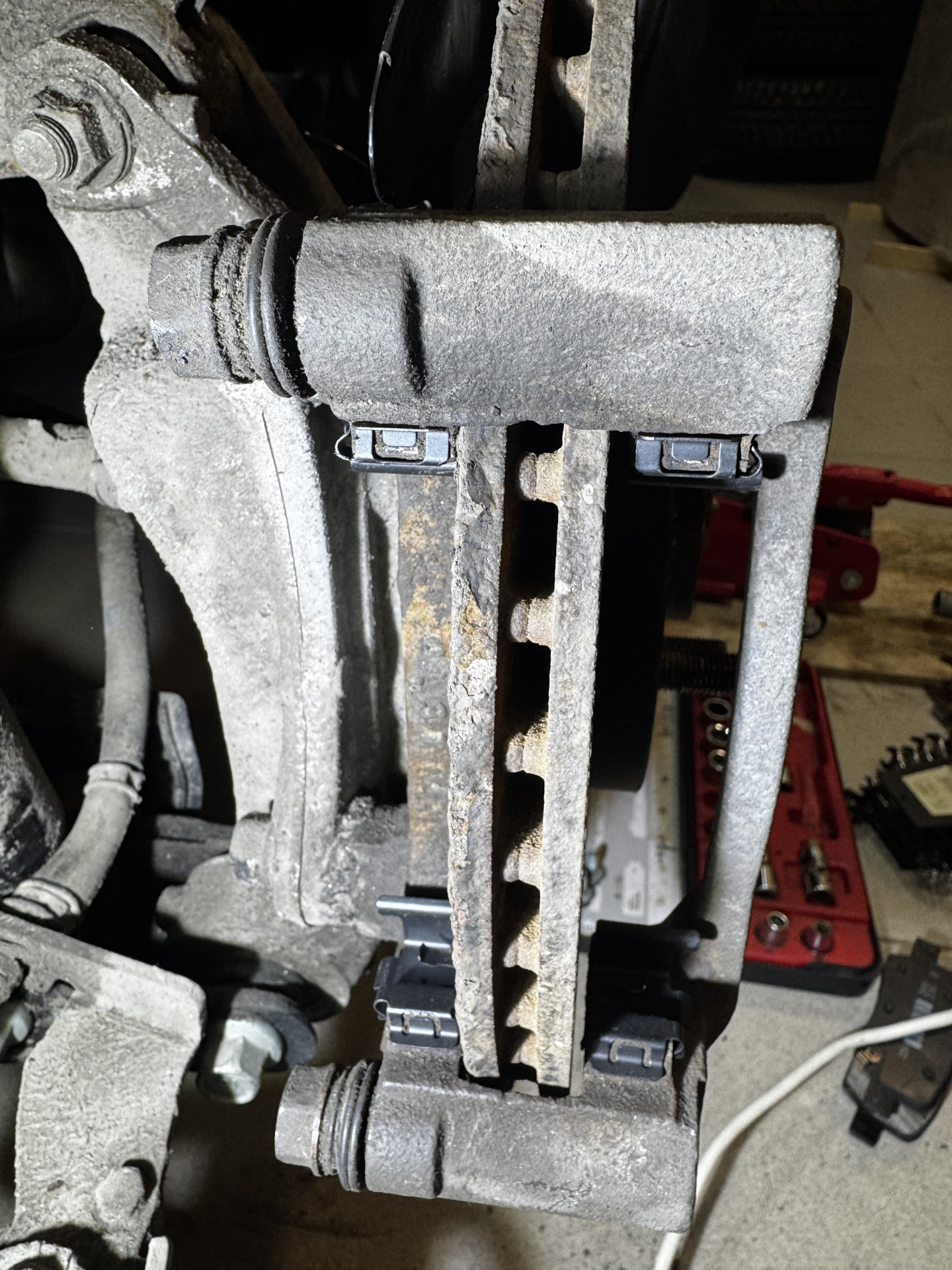 Видно, что внутренняя колодка изношена больше чем наружная.