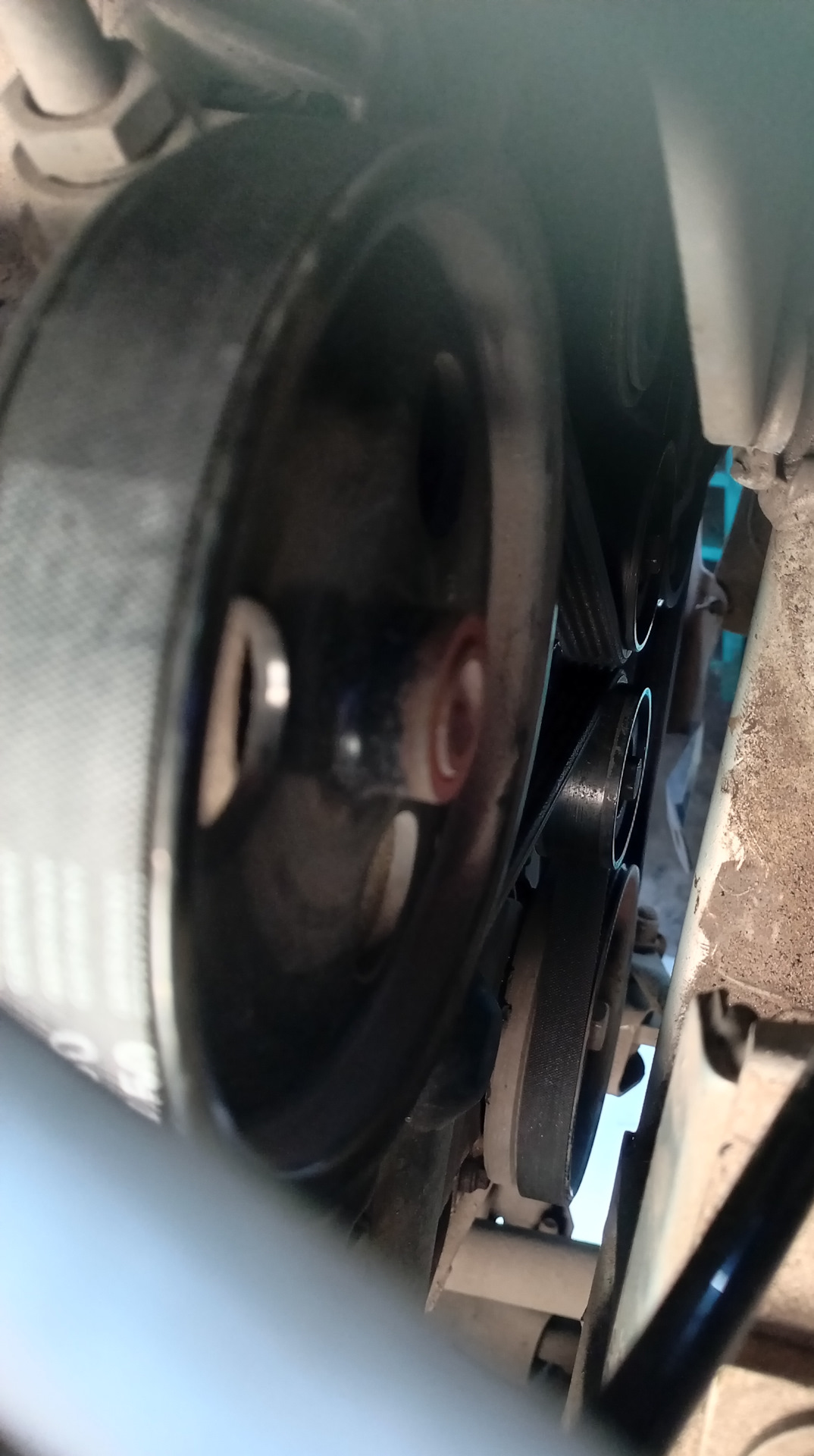 Заменил с ямы легко, даже не откручивал правое колесо. Только отогнул вниз пыльник. У кого стоит такой же ремень и такая же модификация как и у меня (гур+кондиционер) — оставляем свободную внутреннюю канавку на шкивах!