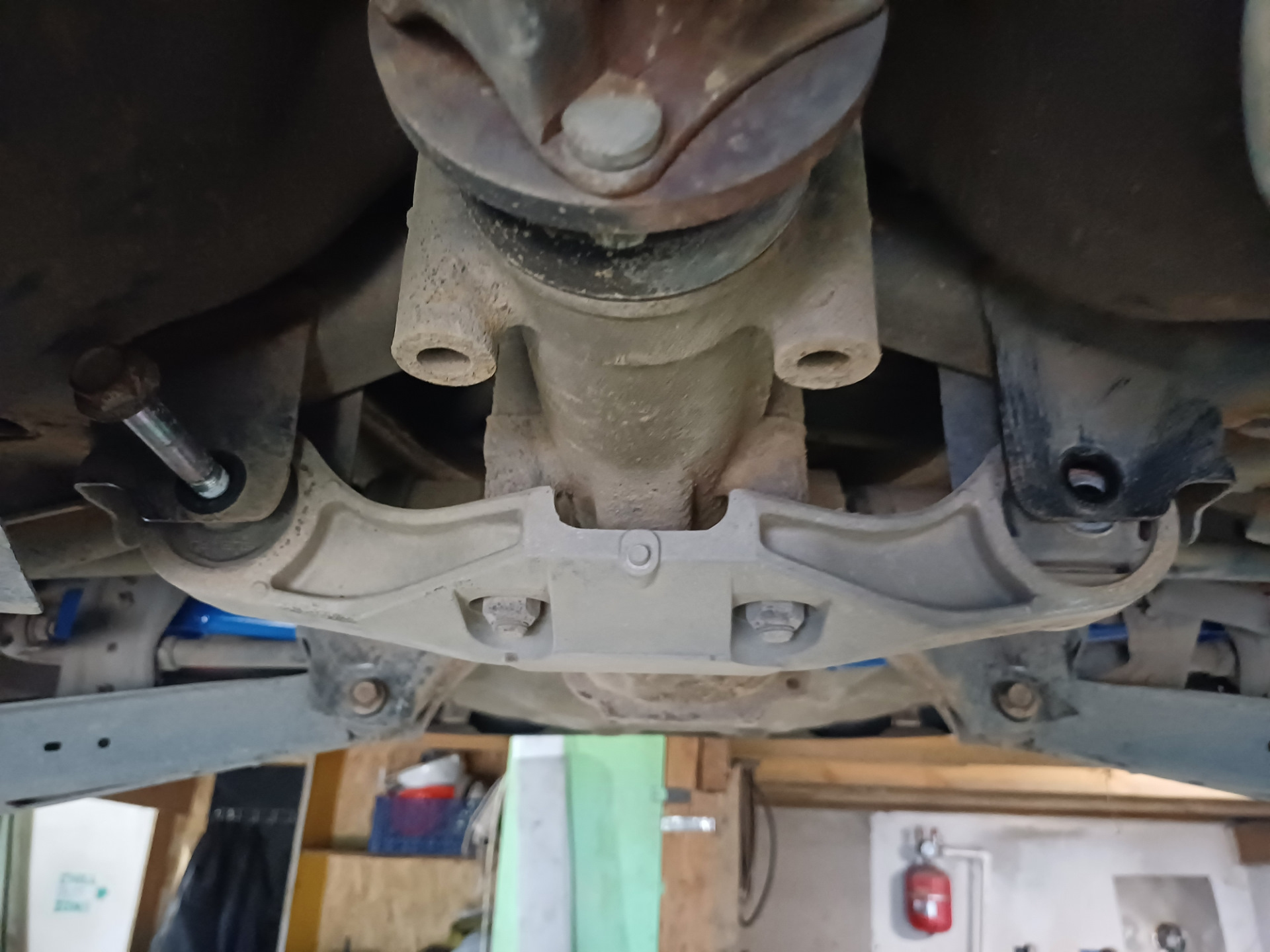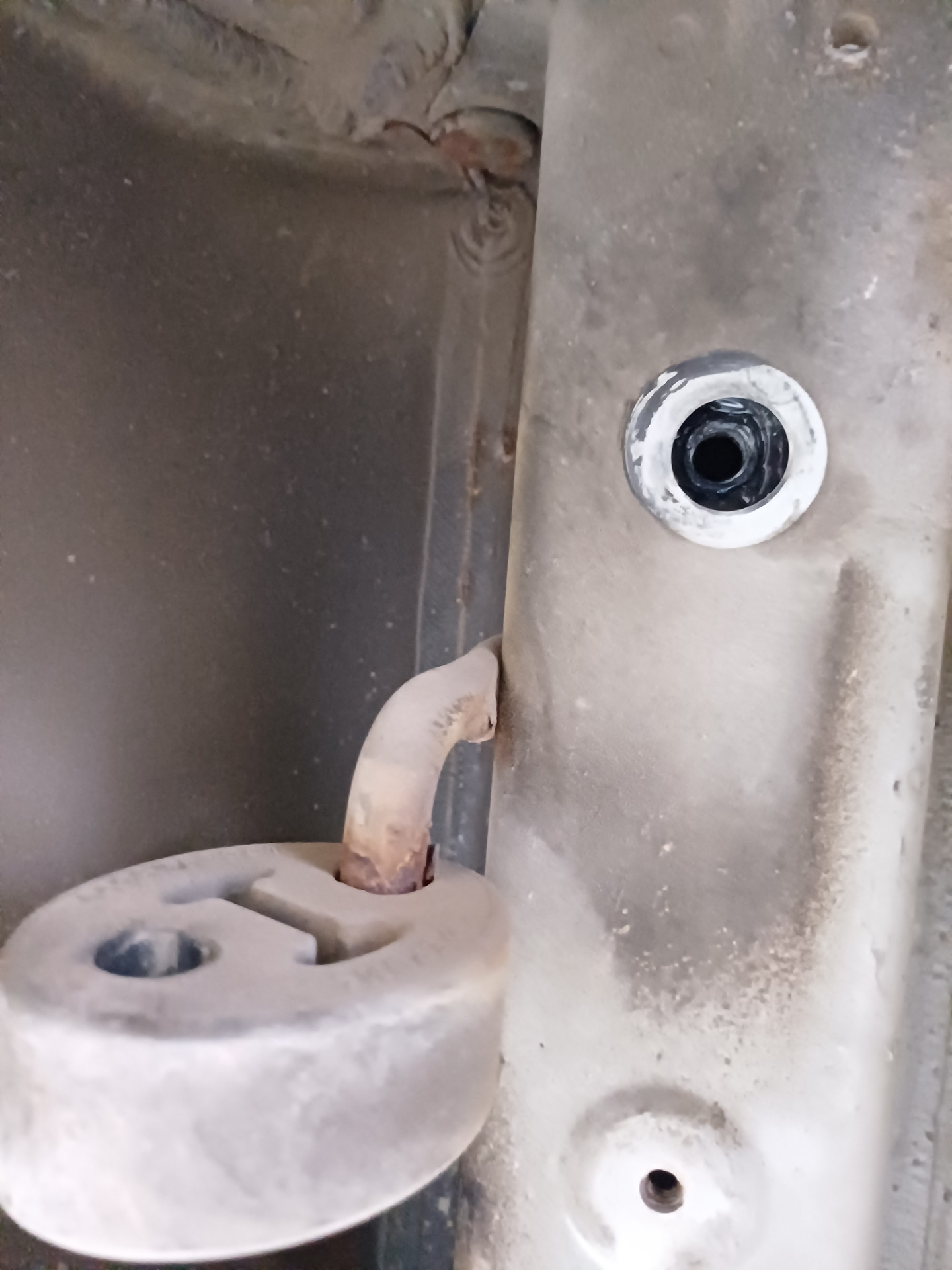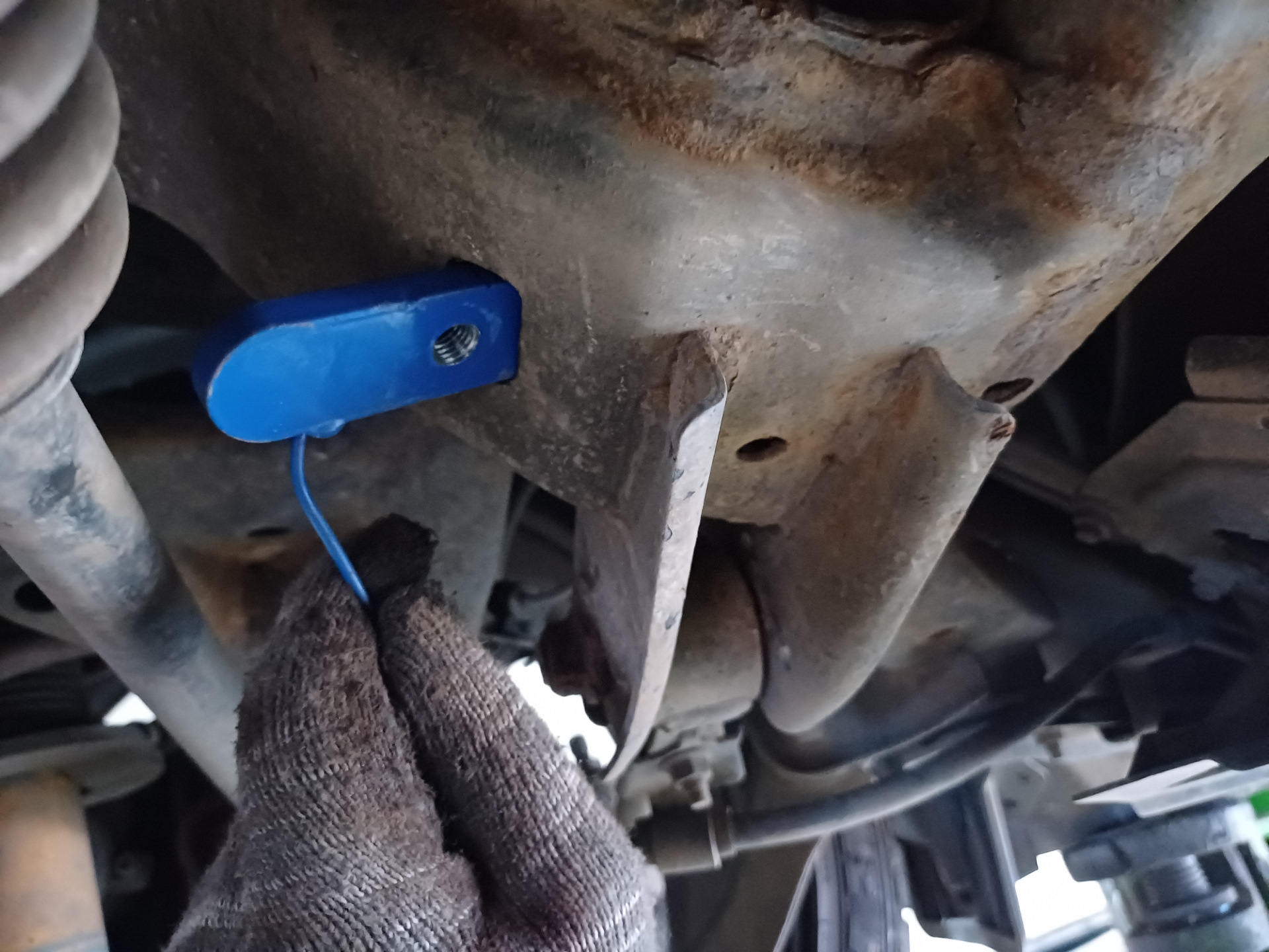 1. Усилитель заднего подрамника — в инструкции к установке написано открутить одно заднее колесо, но колеса я как раз таки и не снимал, а вот глушитель пришлось открутить.