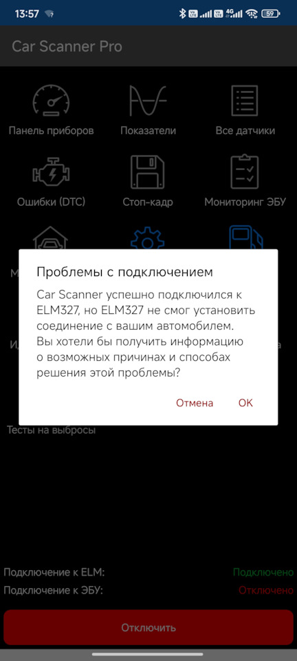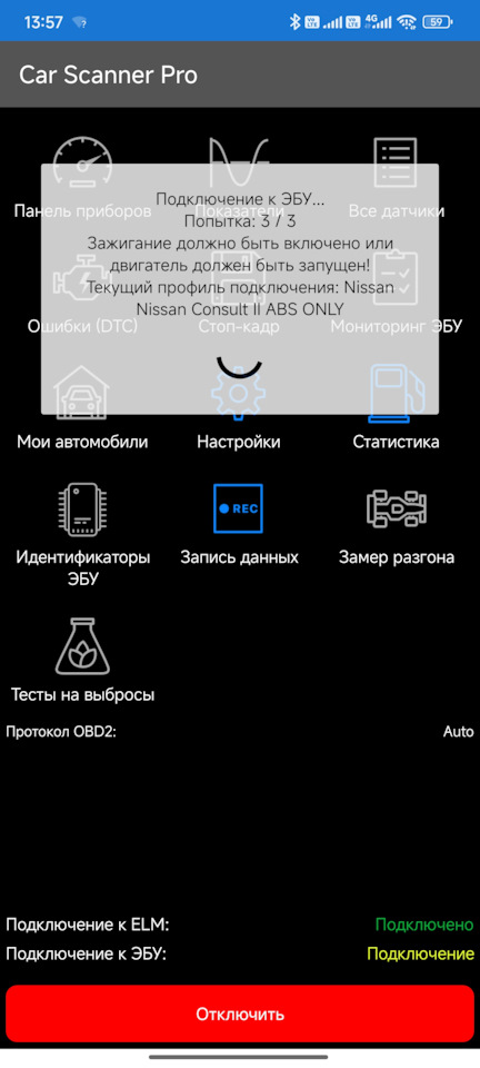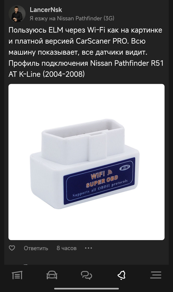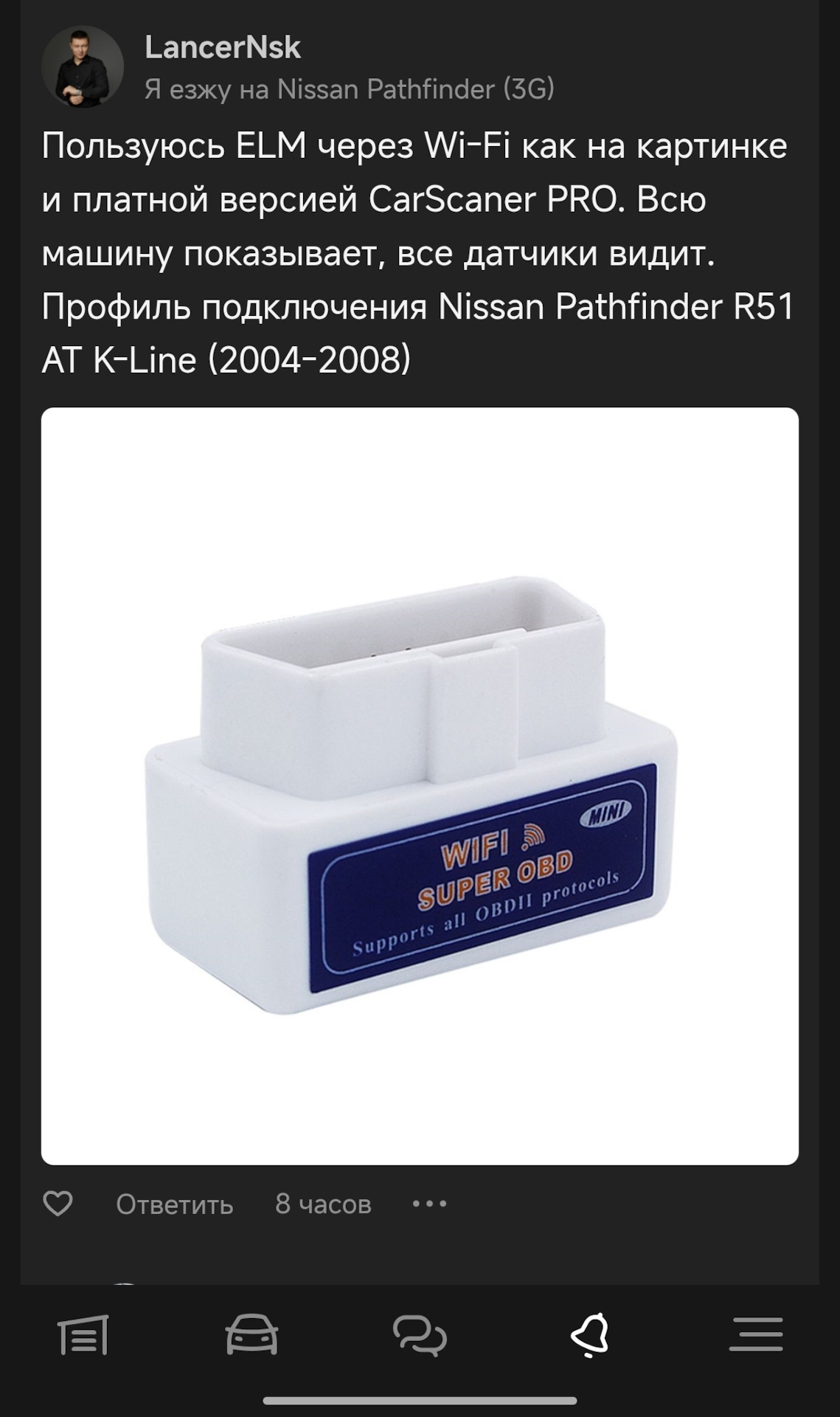Пользуюсь ELM через Wi-Fi как на картинке и платной версией CarScaner PRO. Всю машину показывает, все датчики видит. Профиль подключения Nissan Pathfinder R51 AT K-Line (2004-2008)