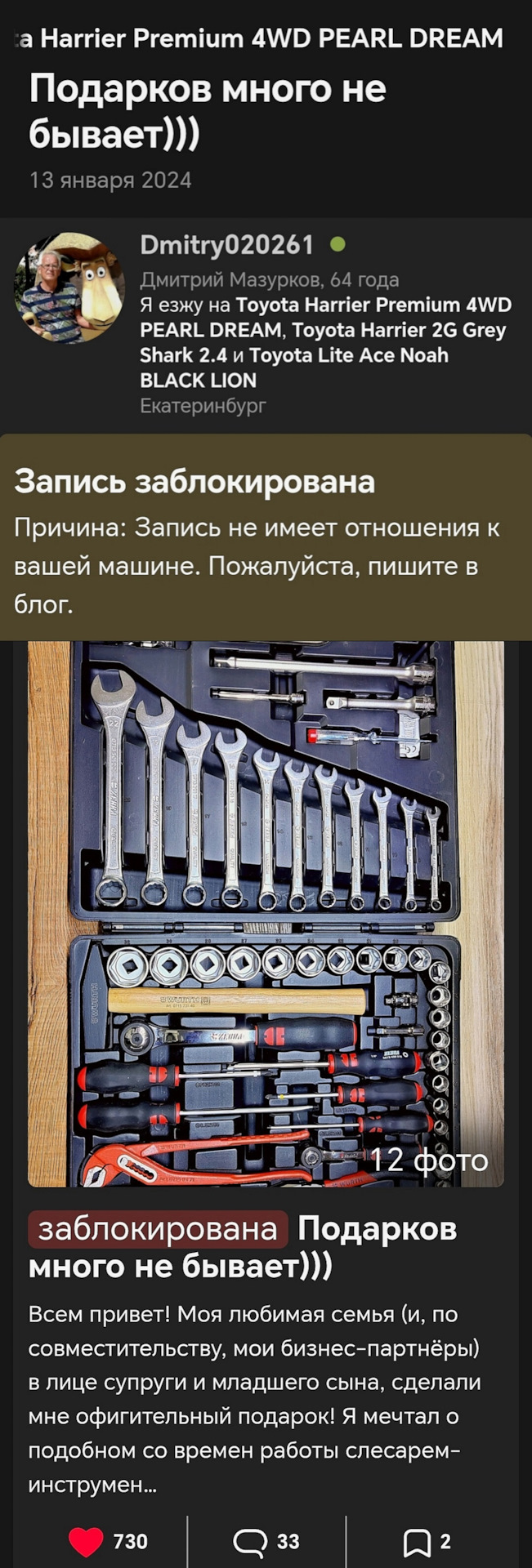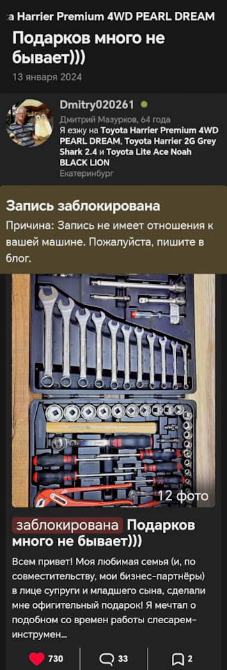 У тебя оформлена запись про ключи просто блеск 😂. Как и прочие, про замену шин, подбор ключей, мойки, сушки… Мне на Х не нужны ваши рейтинги. А вы, взаимщики, спать не будете, если у вас исчезнет одно очко из рейтинга. Поэтому у вас тысячи подписчиков. Не потому, что вас интересно читать, а потому, что вщаимщики И комментарии потом идут одни и те же. Клёво, супер, молодец, так держать…