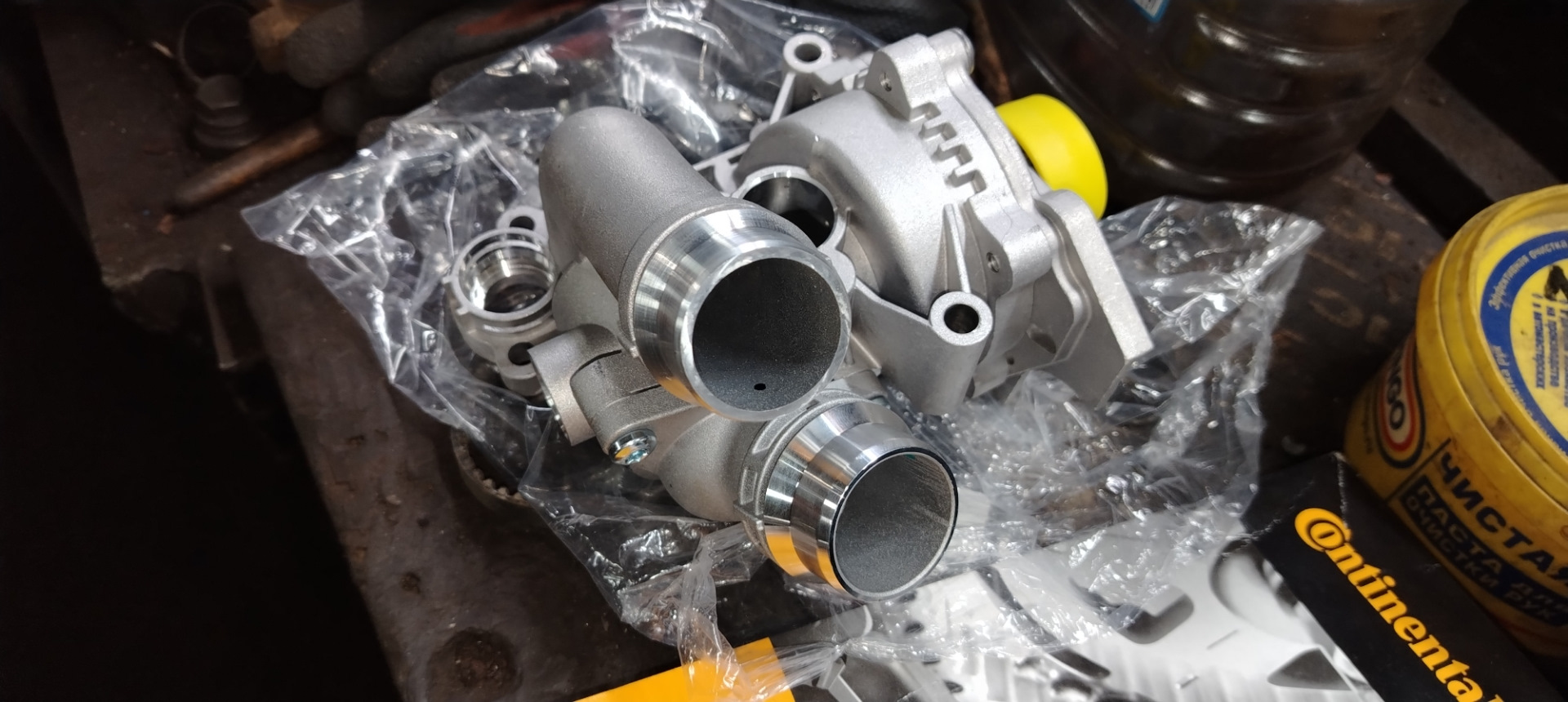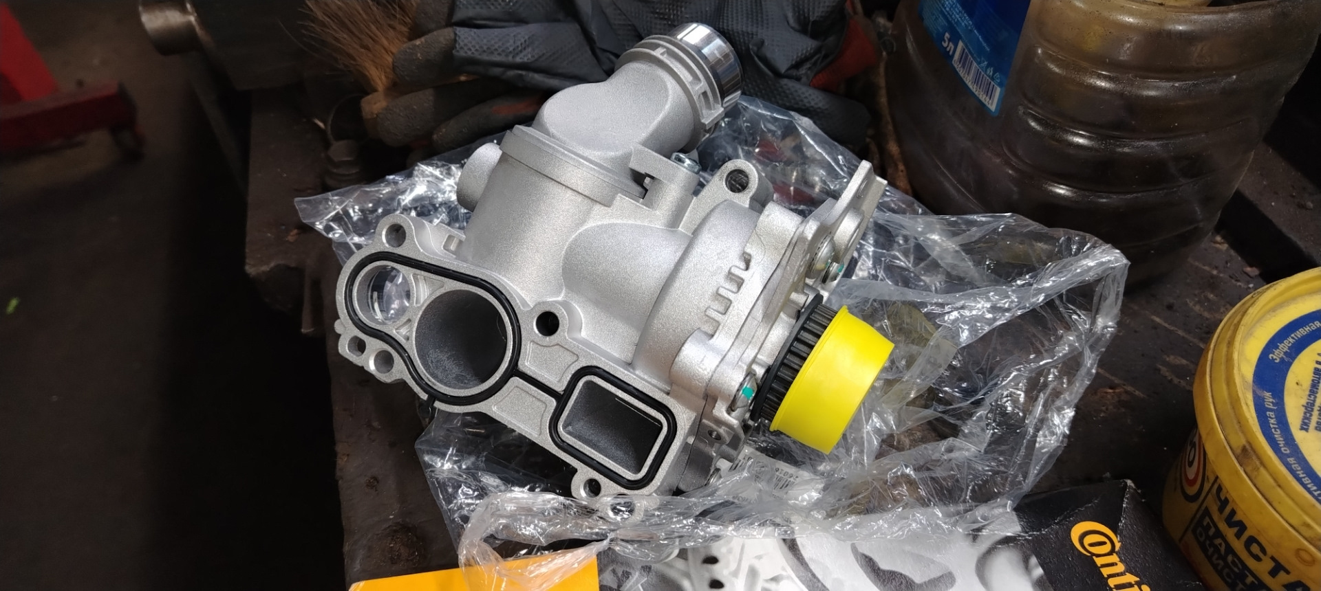 Пока машина в села на подъёмнике с ремонтом задней подвески, Выяснилось что течёт помпа. Заказал у парней из Саратова на авито усиленную помпу алюминиевую с крыльчаткой от 2.0 тигуана, с термостатом на 87гр. Так же установил новый ремень помпы, и новый теплообменник, новый антифриз.